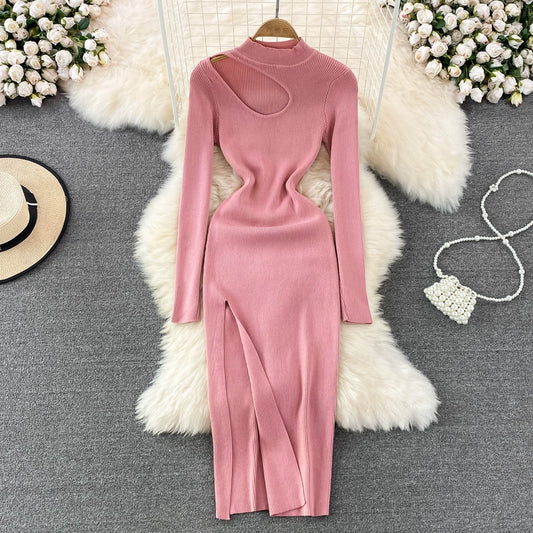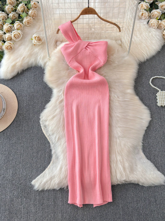 Knitted Slim Hip Pure Desire Slanted Shoulder Bodycon Dress