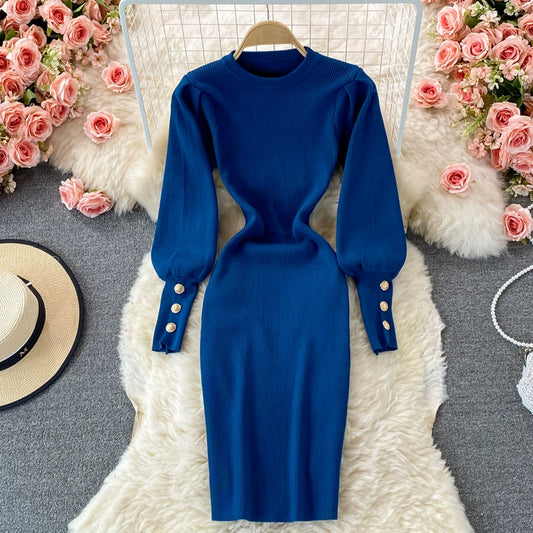 Sophisticated Winter Stretch Knitted Fit Bodycon Dress With Long Puff Sleeves