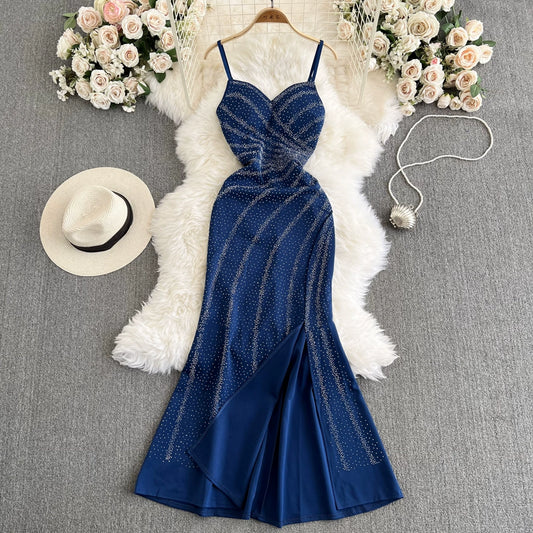Luxury Velvet Slit Slim Waist Black Suspender Bodycon Dress