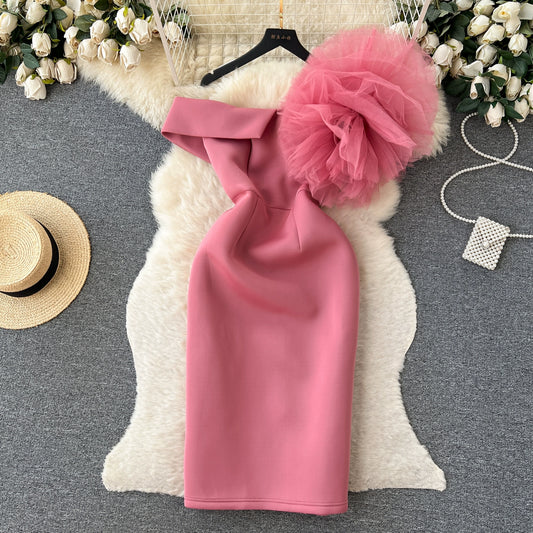 Elegant Celebrity Style Banquet Dress with One-Shouldered Design with 3D Floral Details and Cinched Waist
