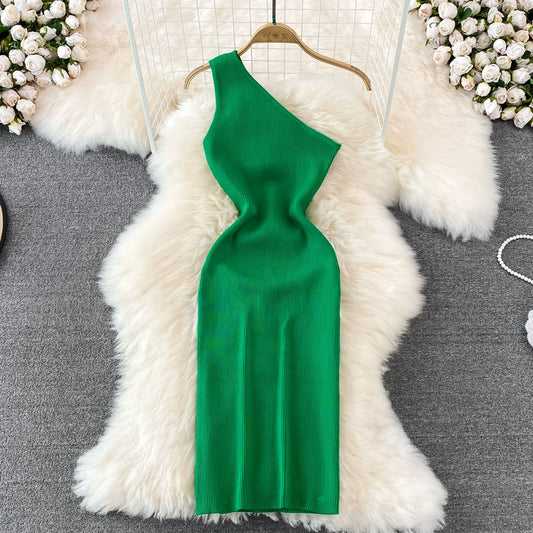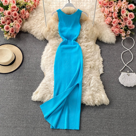 Sophisticated Summer Round Neck Off-Shoulder Sleeveless Midi Split Knitted Dress