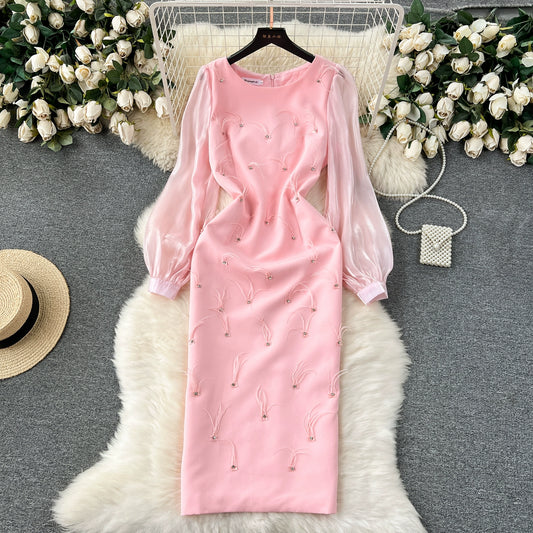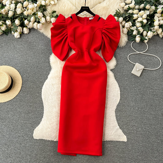 Refined Light Luxury Banquet Dress with Balloon Sleeves and Slim Fit Design