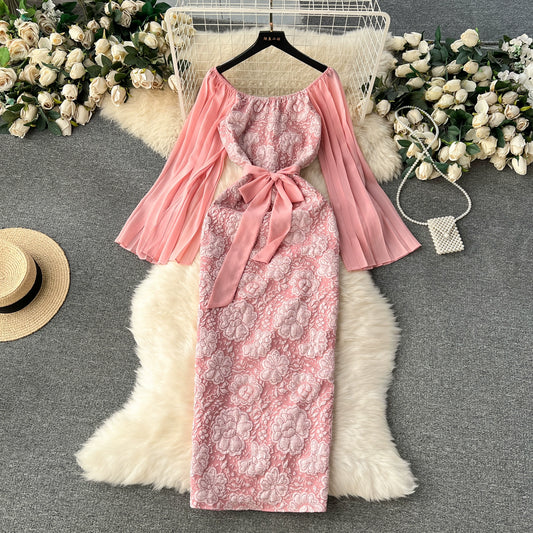 Trendy and Stylish Jacquard Design Pressed Pleats,Bell-Sleeved Dress
