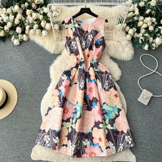 Floral Elegant Sleeveless Pleated Waist-Defining Skirt Dress For Women