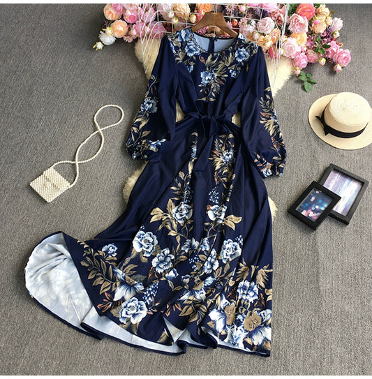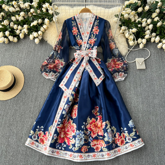 European Luxurious V-Neck Lantern Sleeve Dress with Retro Court Style Prints