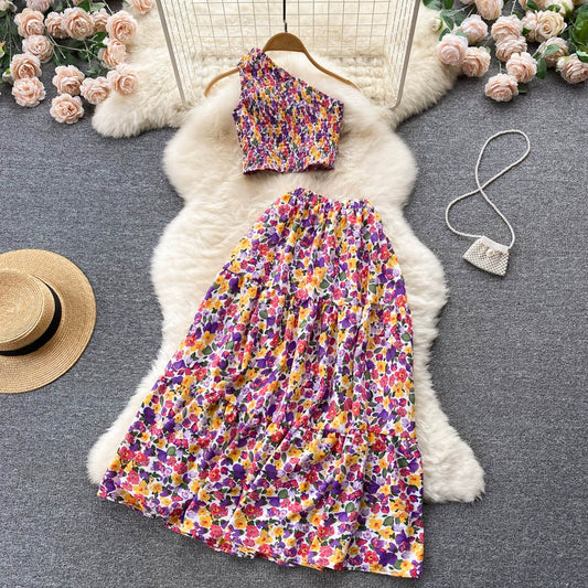Vacation Ready Floral Printed Suit with Cropped Top and Flowy Skirt For Women