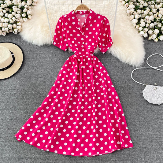 French Flair Retro Dress with V-Neck and Puff Sleeves Polka Dot Design