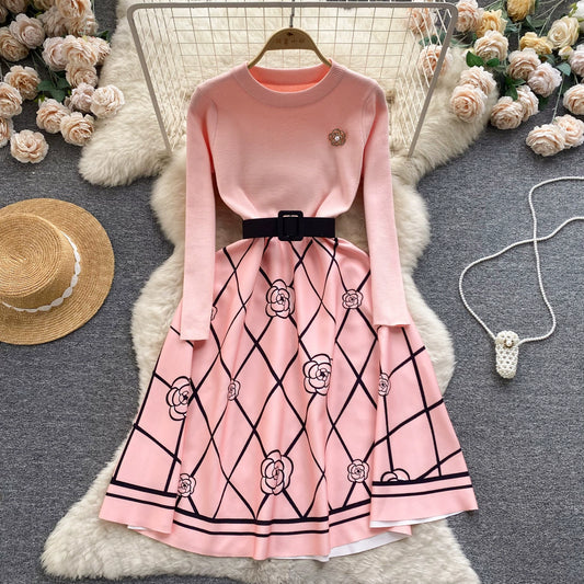 Women's Luxury Style Knitted Stitched Embroidered Mesh Dress With Lace-Up Waist Temperament Fairy Skirt