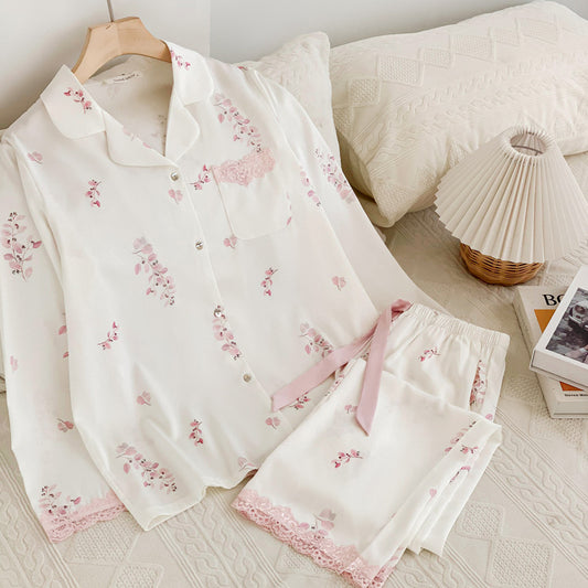 Summer Serenity Lace Cotton Crepe Double Gauze Thin Long Sleeve Loungewear Suit For Women
