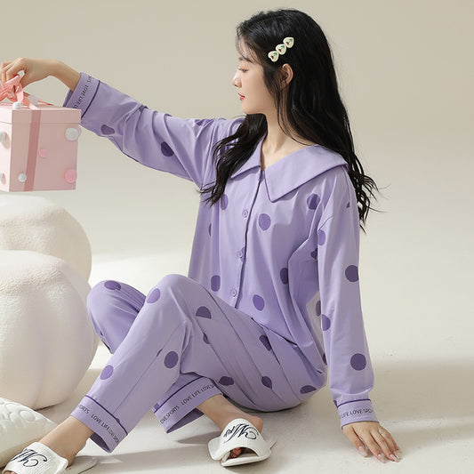 Women's Cotton Yarn Long Sleeve Round Neck Polka Dots Loose Loungewear Set