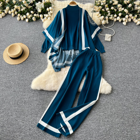 Contrasting Color knitted Buttoned V-neck Cardigan With Fashionable Wide-Leg Pants Sweater Set
