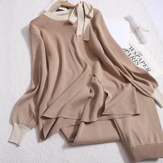 Premium Duo Fall Fashion Round Neck Lace Long Sleeve Slit Top High Waist Casual Pants