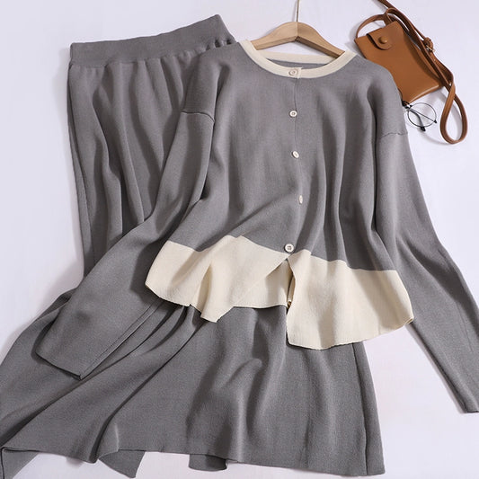 Women's Temperament Solid Color Contrasting Round Neck Long-Sleeved High-Waisted knitted Cardigan Top With Skirt
