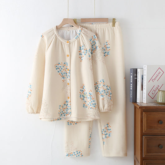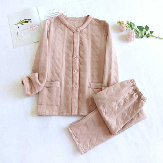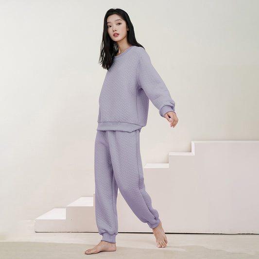 Soft & Soothing Air Cotton Three-Layer Padded Round Neck Long Sleeve Padded Loungewear Suit For Autumn And Winter