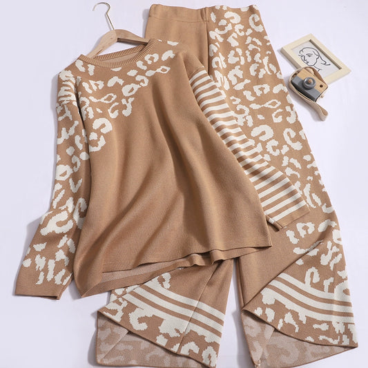 Leopard Jacquard knitted Contrasting Design Loose Slim Long-Sleeved Sweater And High-Waisted Trousers For Autumn And Winter