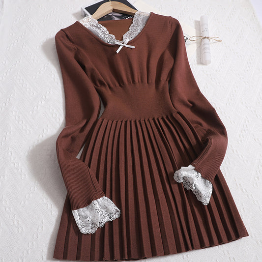 Luxury Korean Retro Lace V-Neck Long-Sleeved Pleated Skirt Stitched knitted Dress