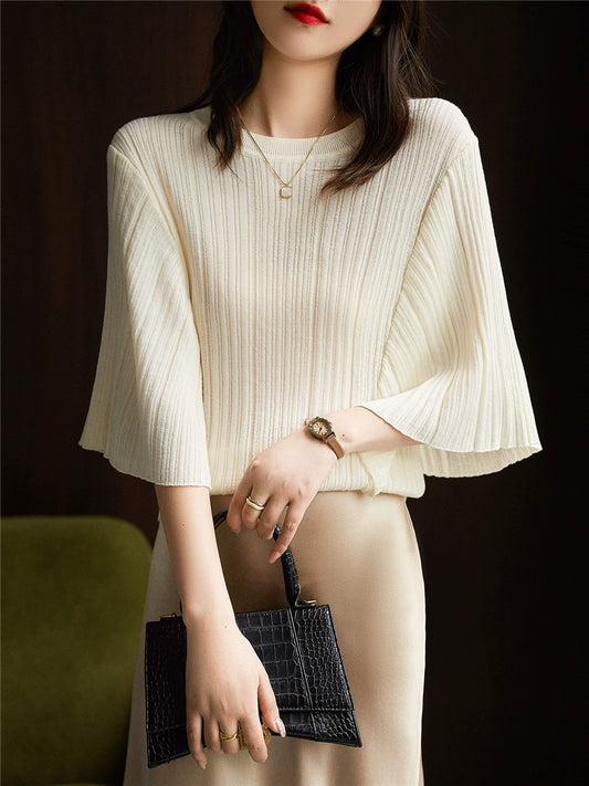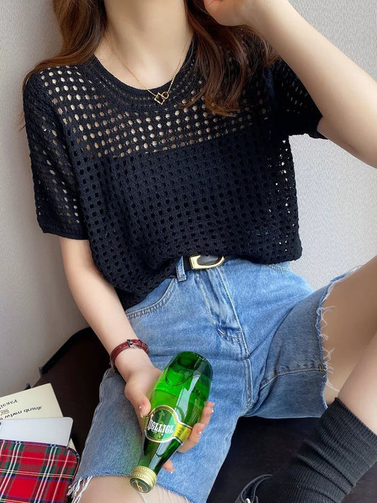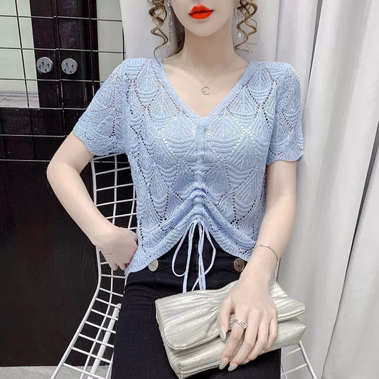 Women's summer short sleeve cut-out versatile new thin ice silk loose tops