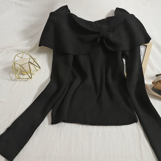 women's Solid Color Big Bow Neckline Off-Shoulder Slim knitted Sweater Top