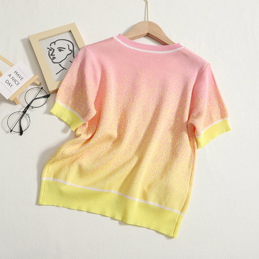 Versatile Colorful Gradient knitwear Round Neck Short Sleeve Summer Casual T-shirt Top For Summer