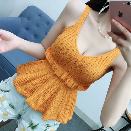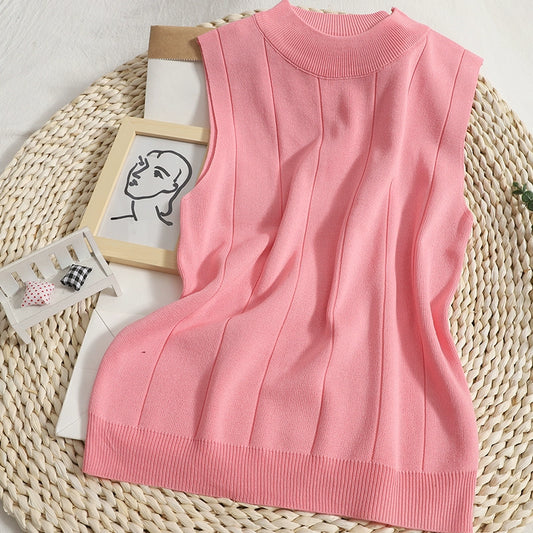 New Korean Version Solid Color Knitted Round Neck Sleeveless Vest T-shirt Top