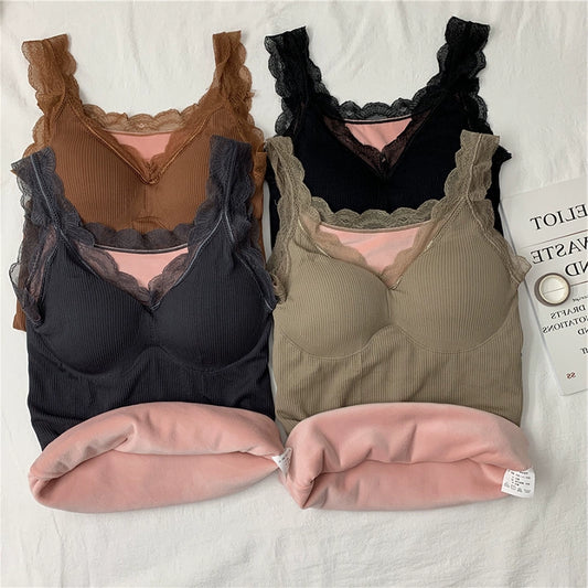 Women's Velvet Thickening Lace Inner Slim Fit Warm Camisole Top With Chest Pad