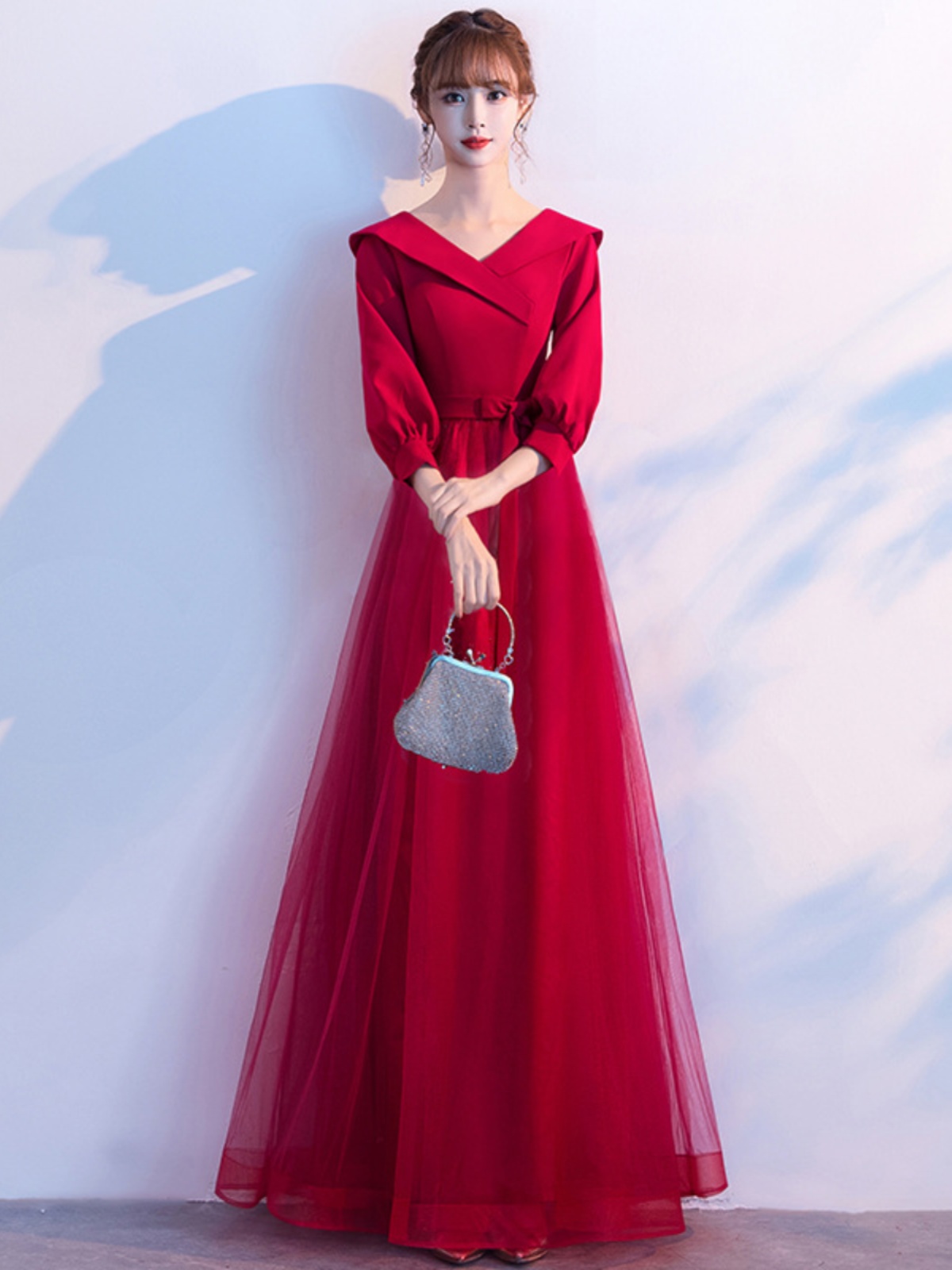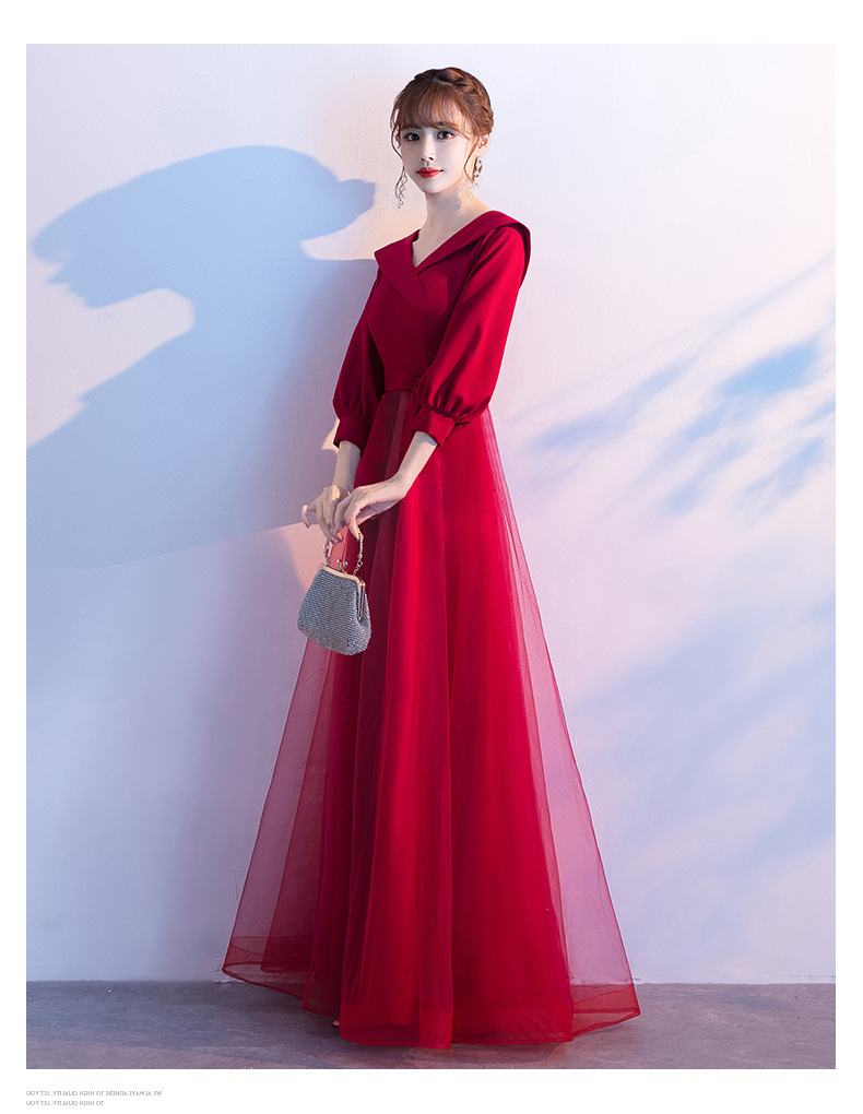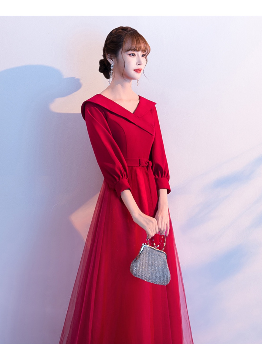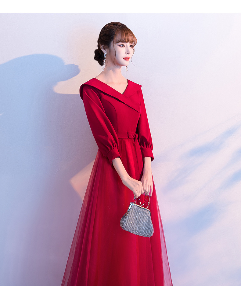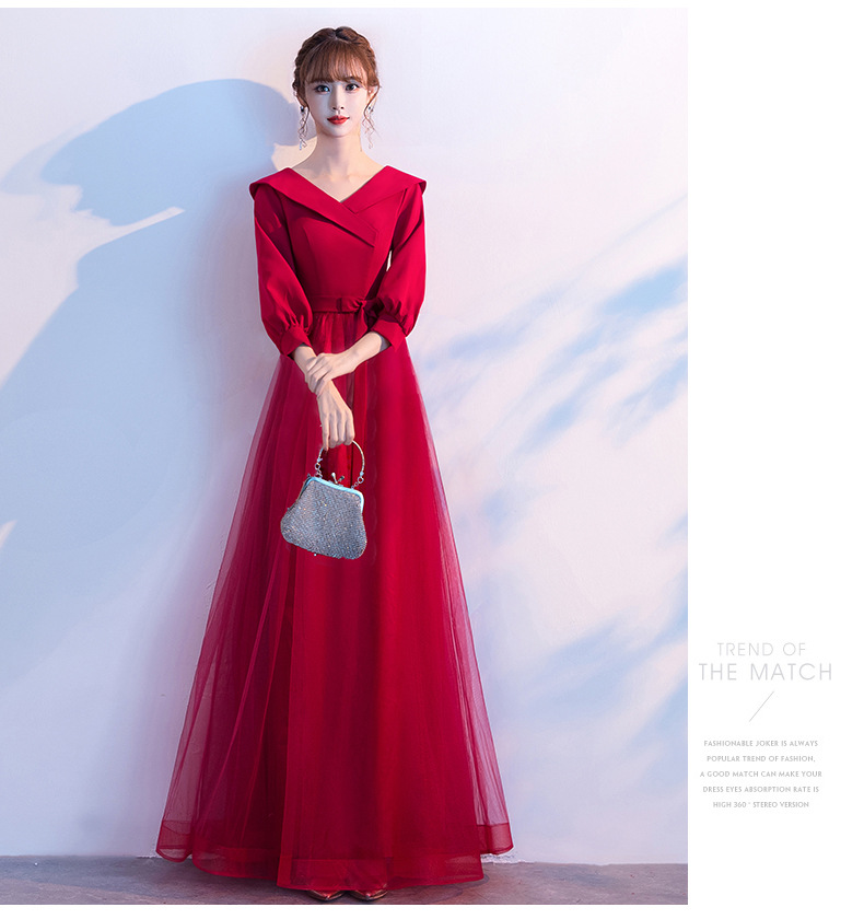 Bridal Glam Long-Sleeved Dress with V-Neck and Puffy Patchwork Skirt