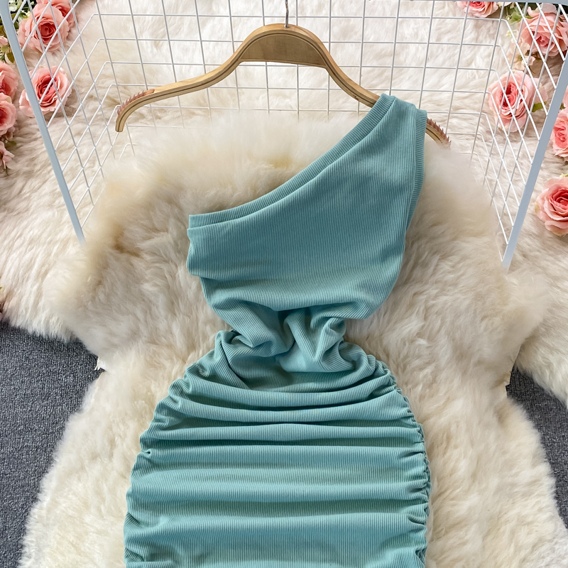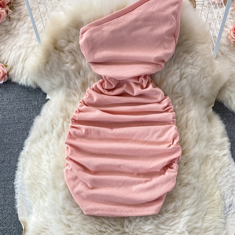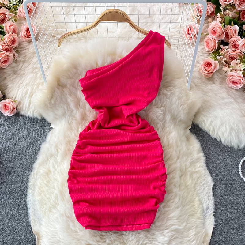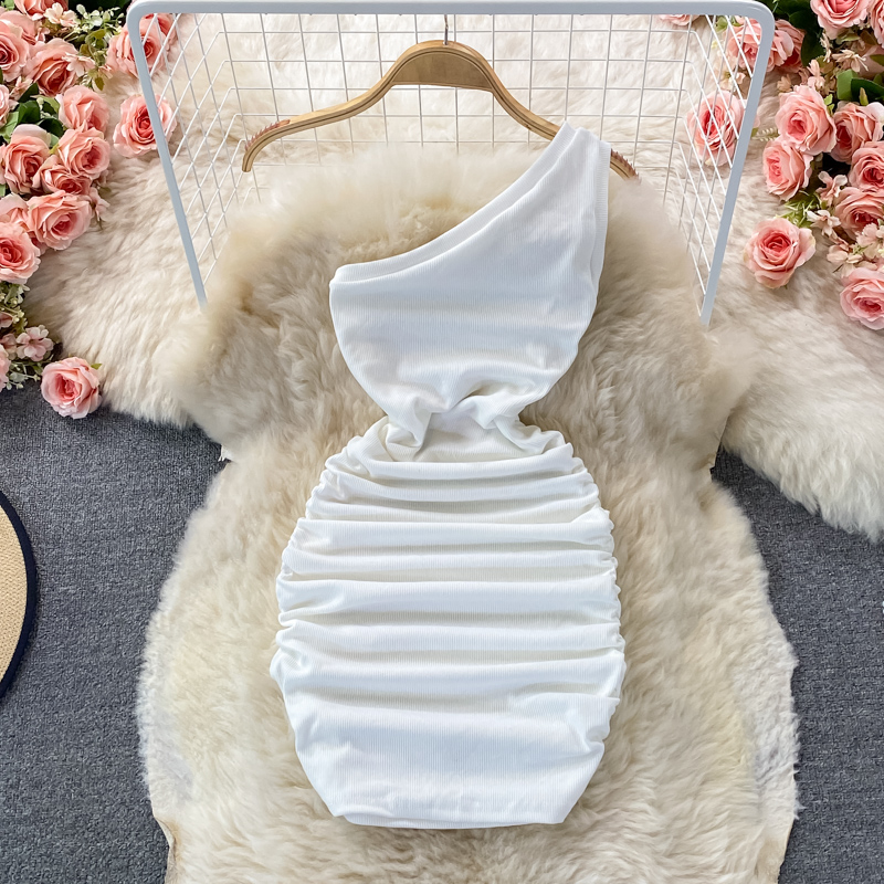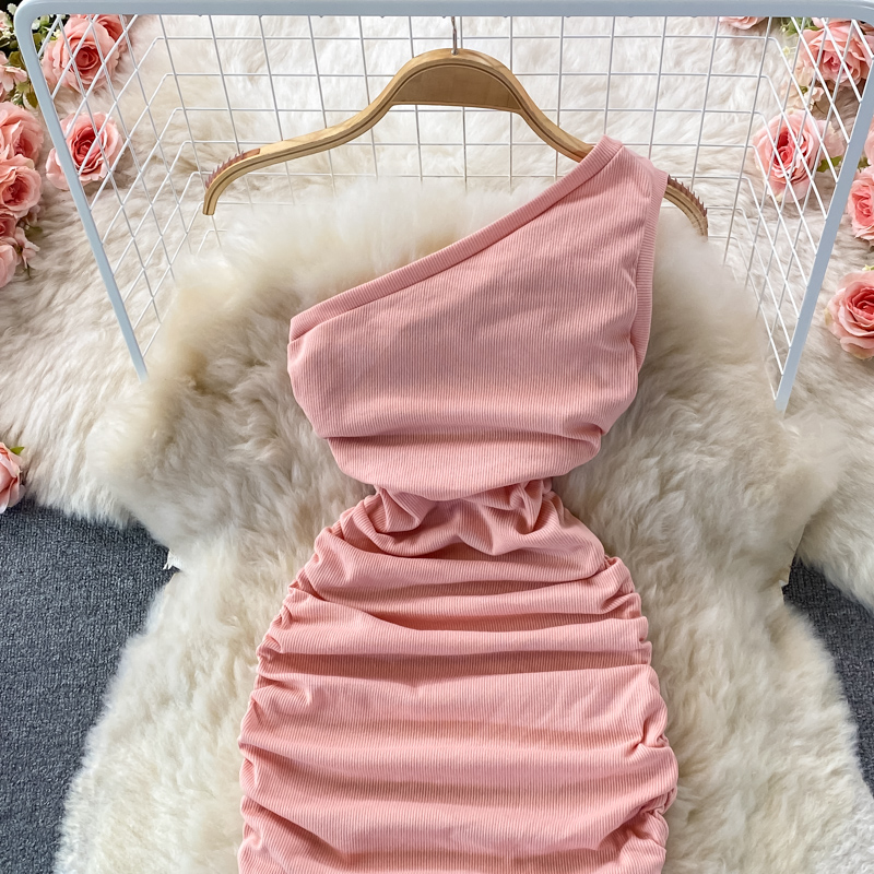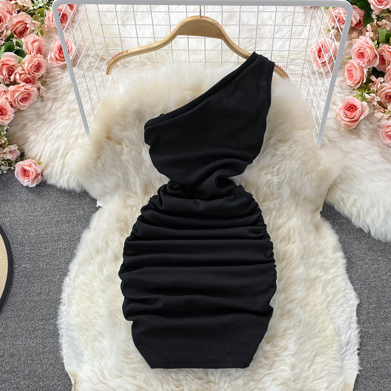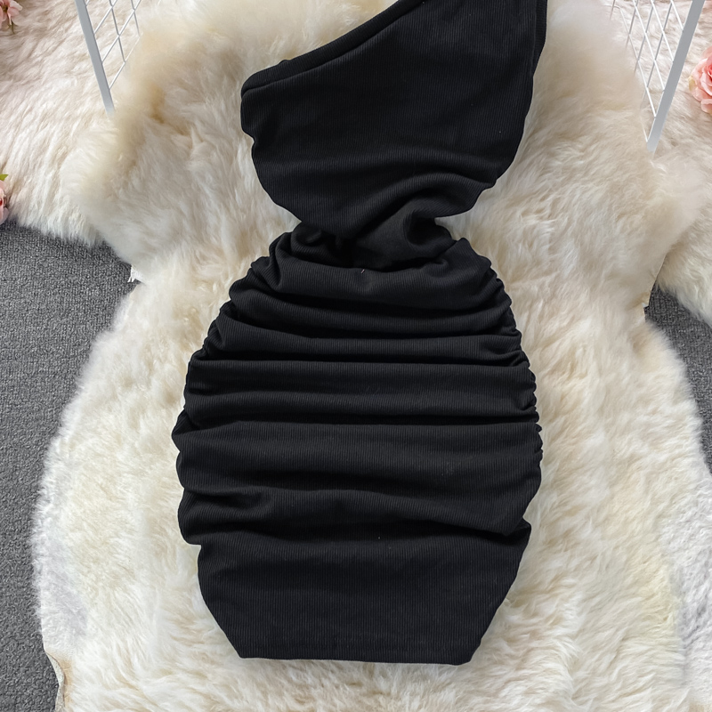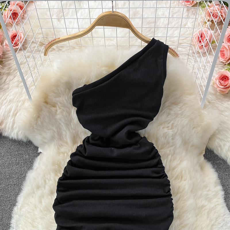 Elegant European and American Style Slanted Collar Dress with Unilateral Off-Shoulder Pleats