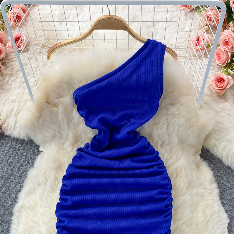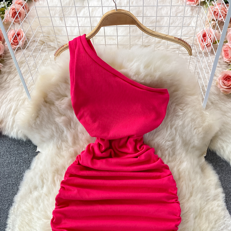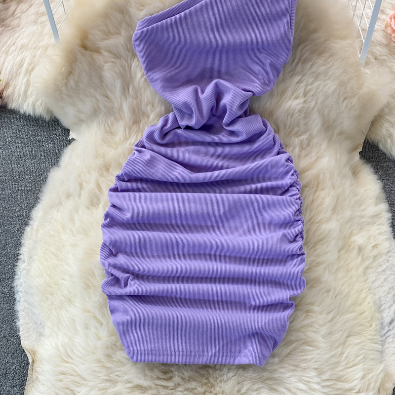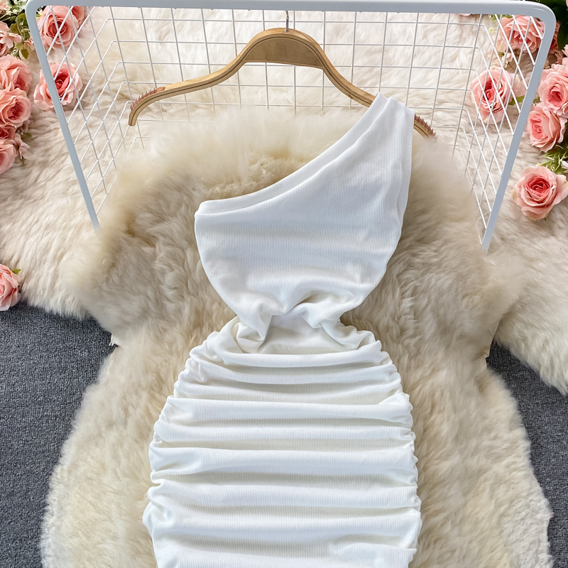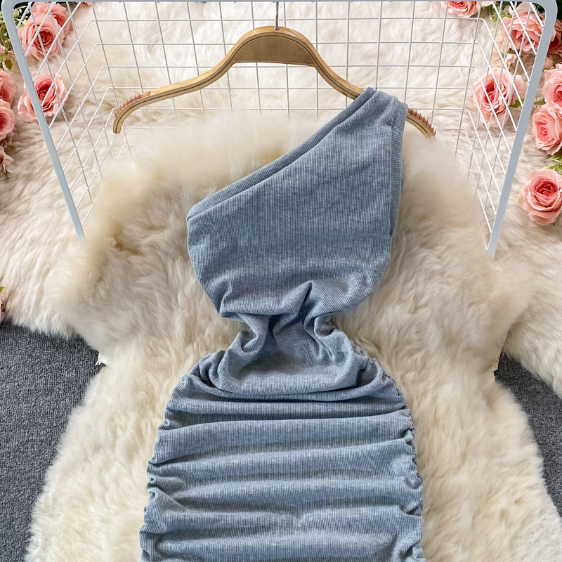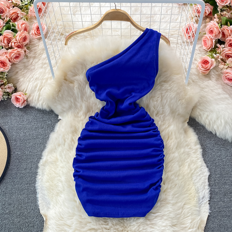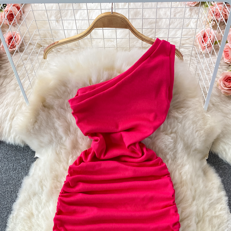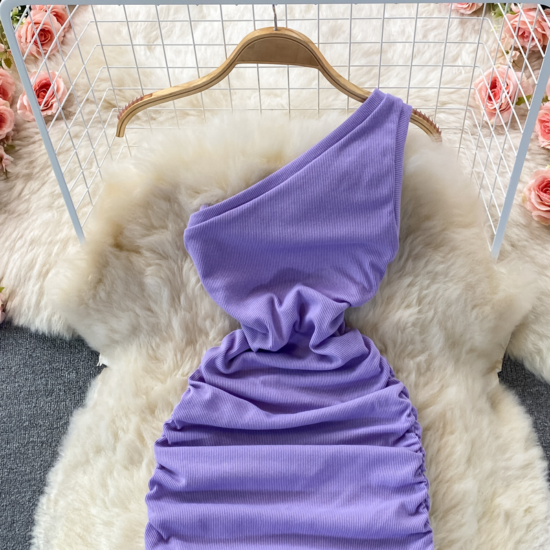 Elegant European and American Style Slanted Collar Dress with Unilateral Off-Shoulder Pleats