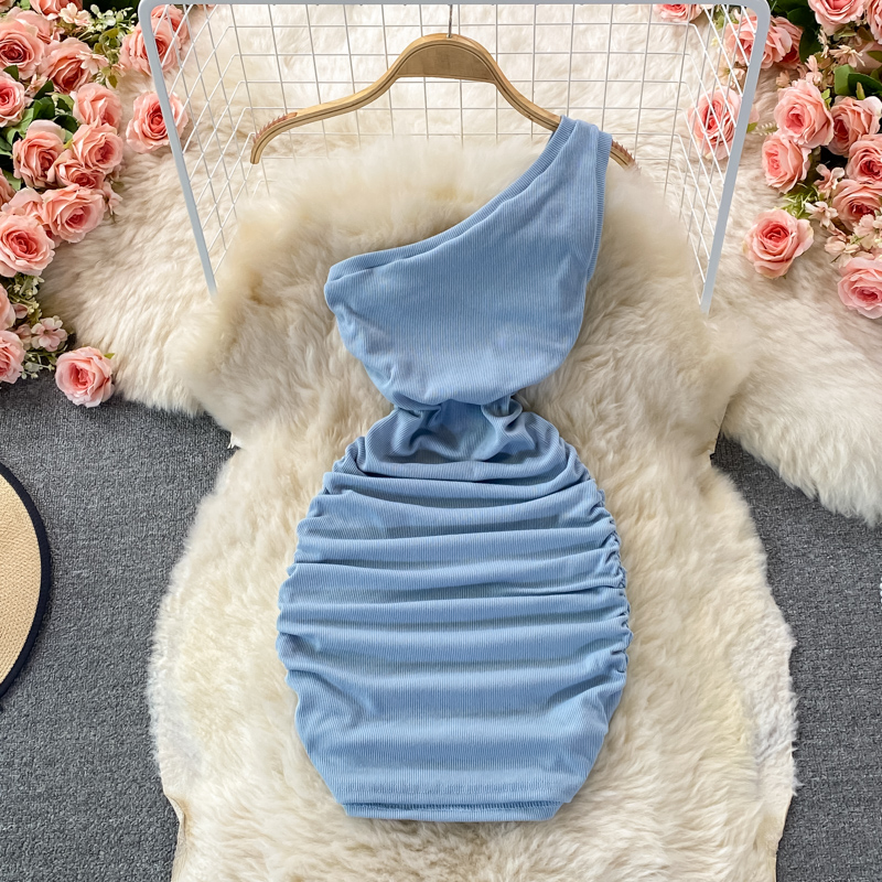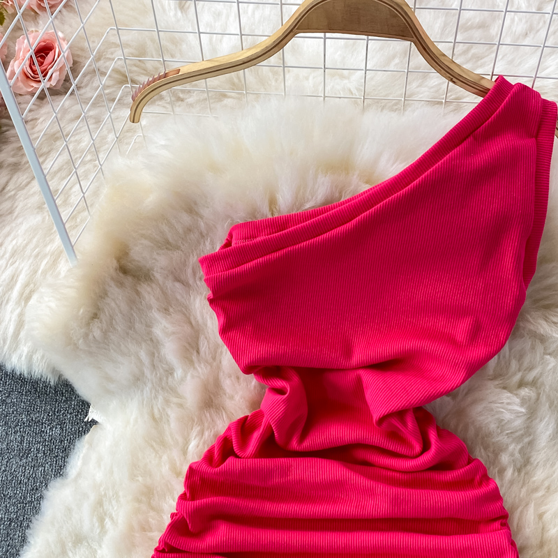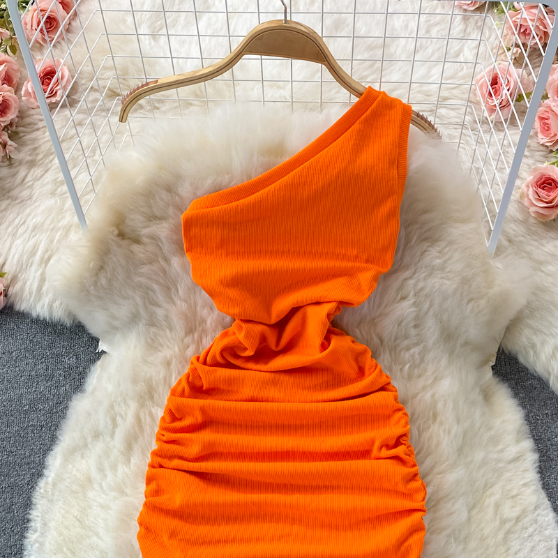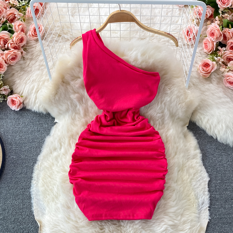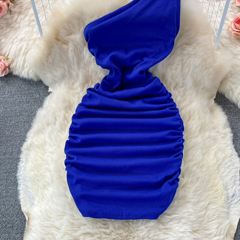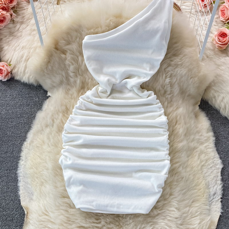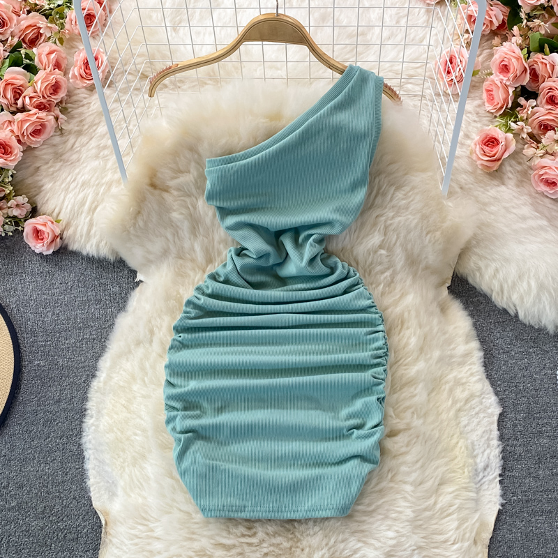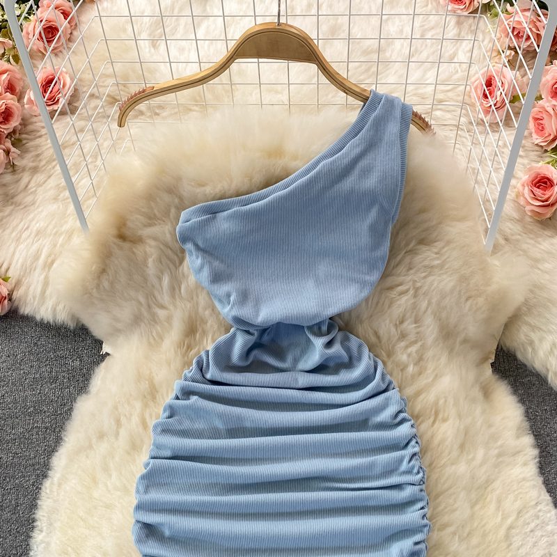 Elegant European and American Style Slanted Collar Dress with Unilateral Off-Shoulder Pleats