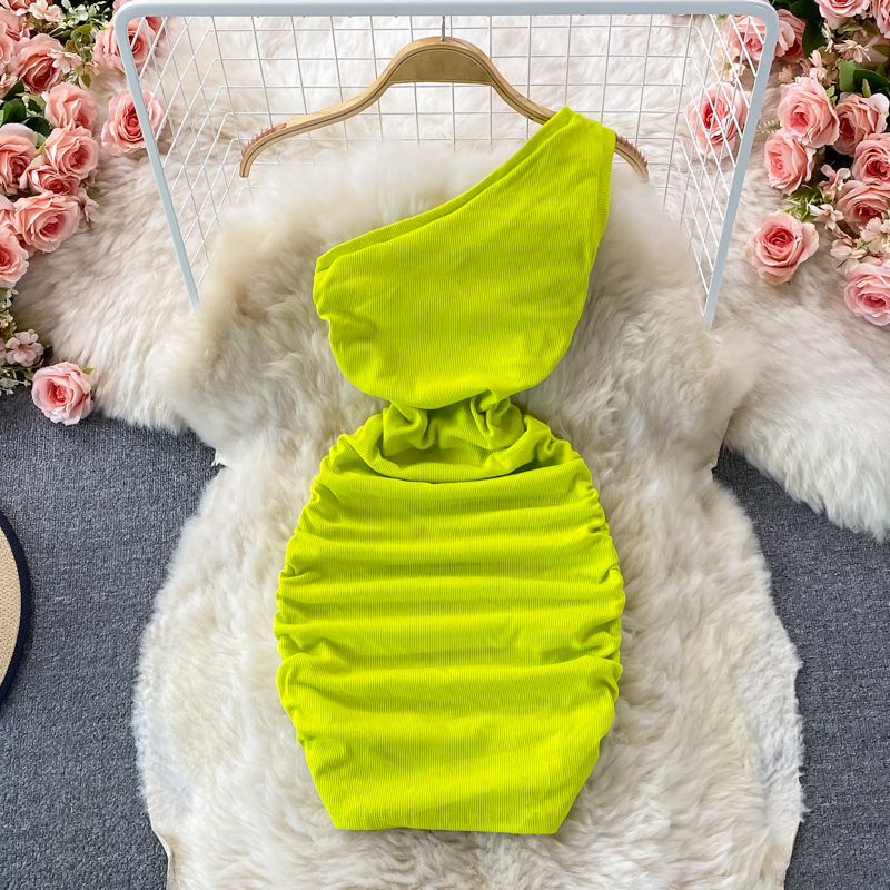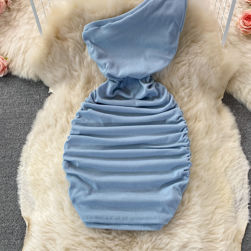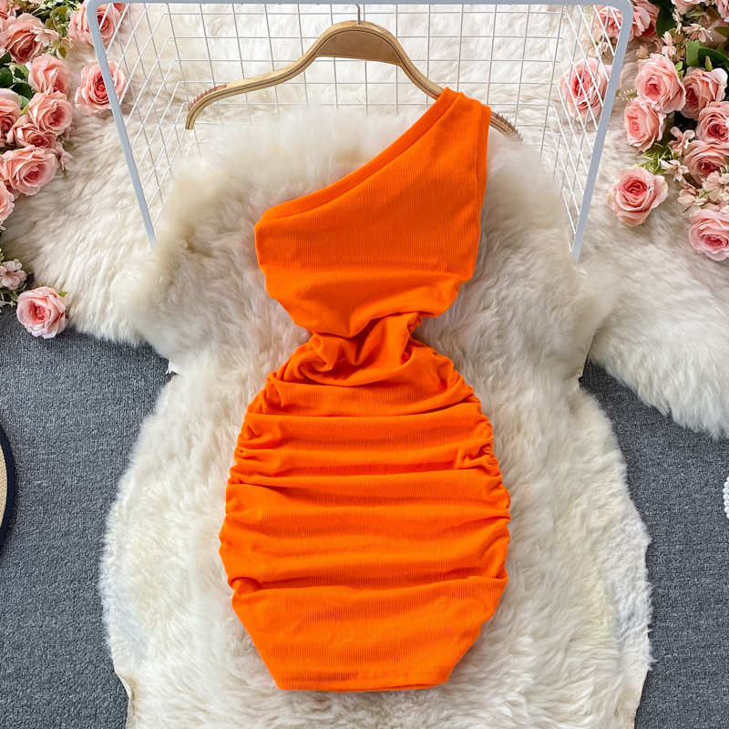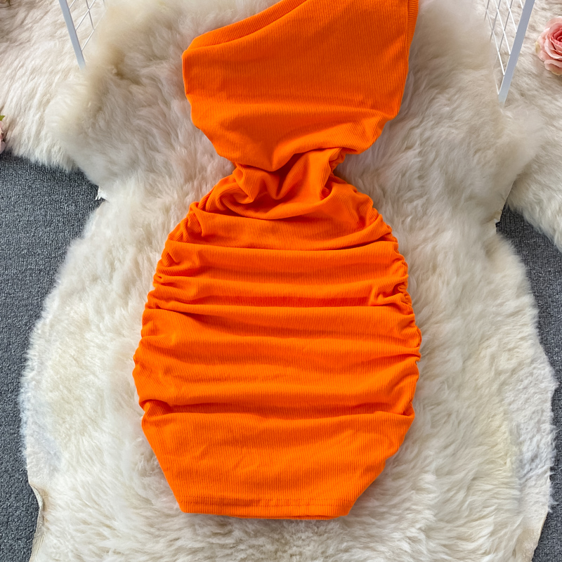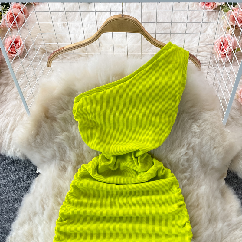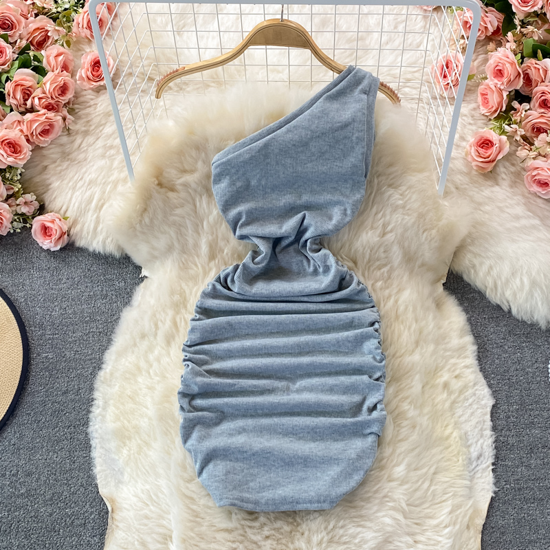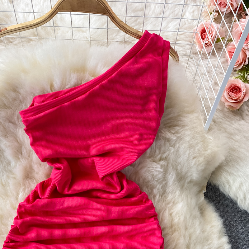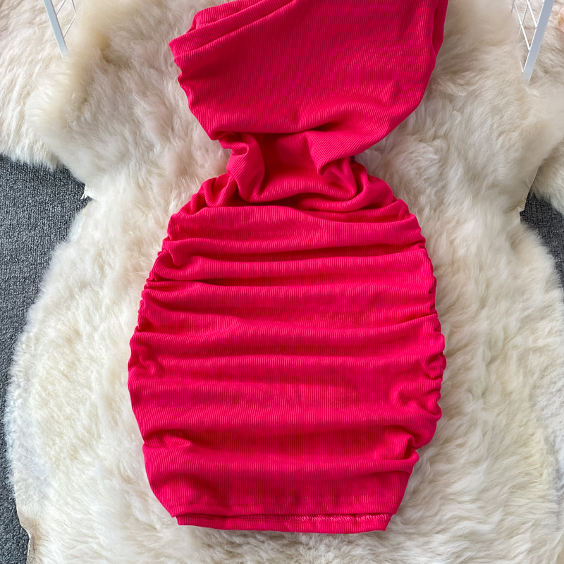 Elegant European and American Style Slanted Collar Dress with Unilateral Off-Shoulder Pleats