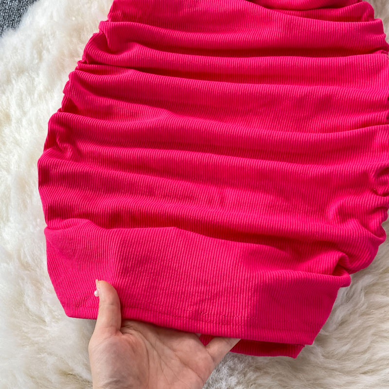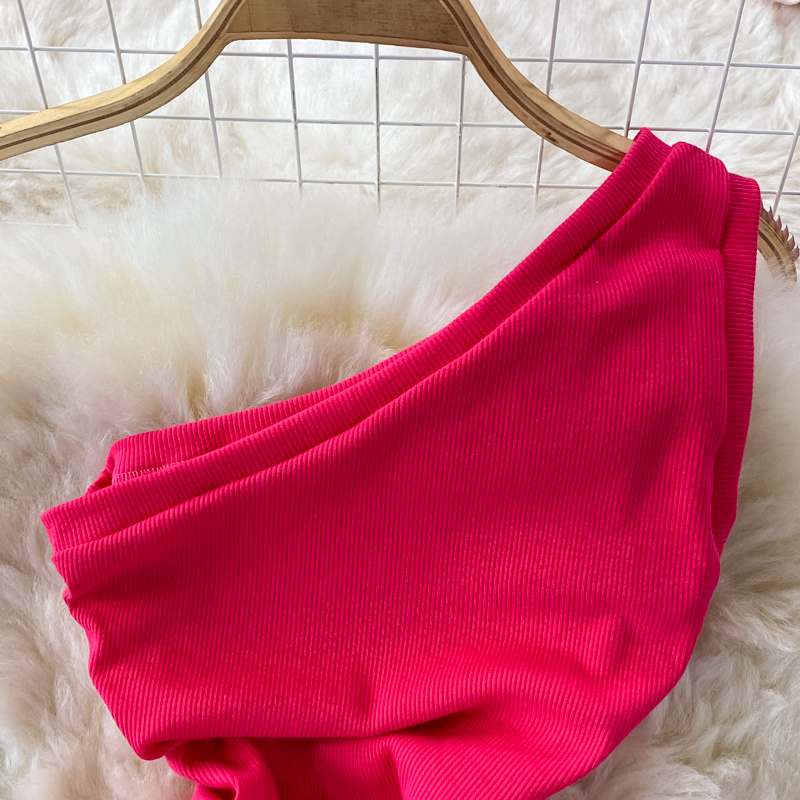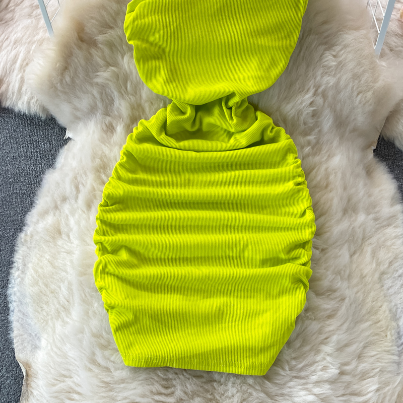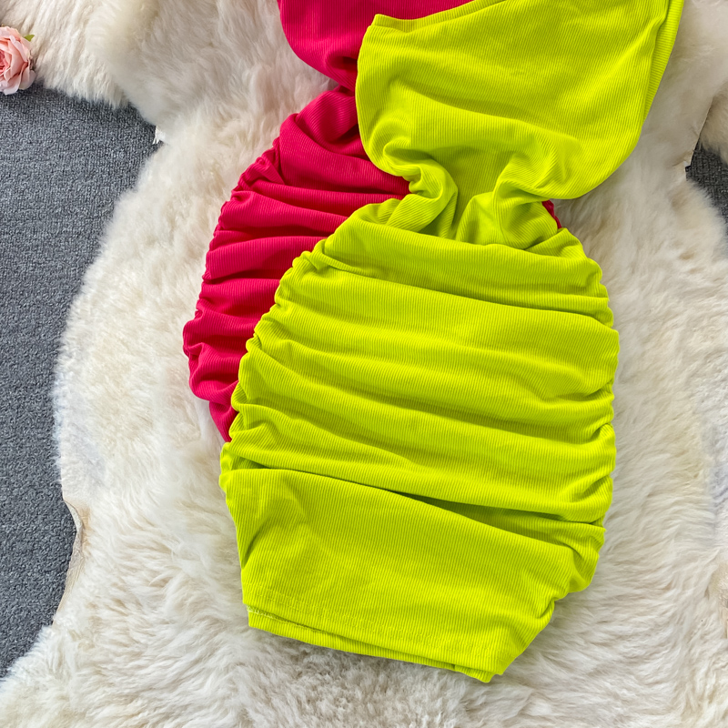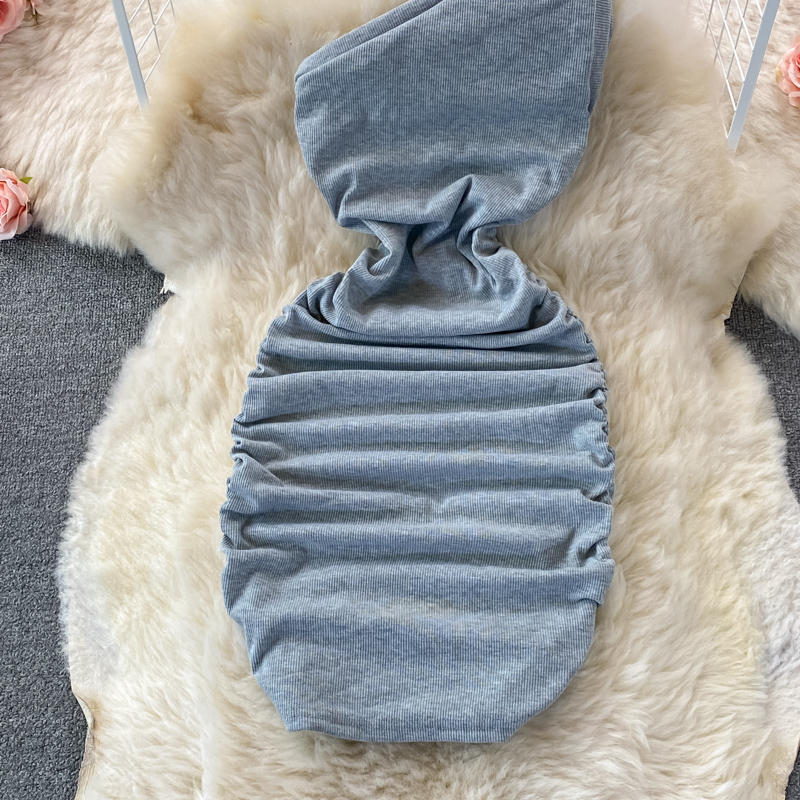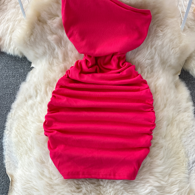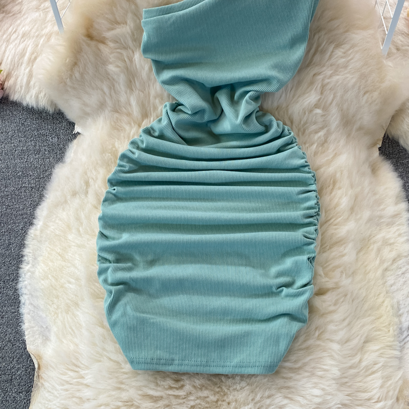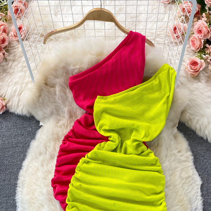 Elegant European and American Style Slanted Collar Dress with Unilateral Off-Shoulder Pleats