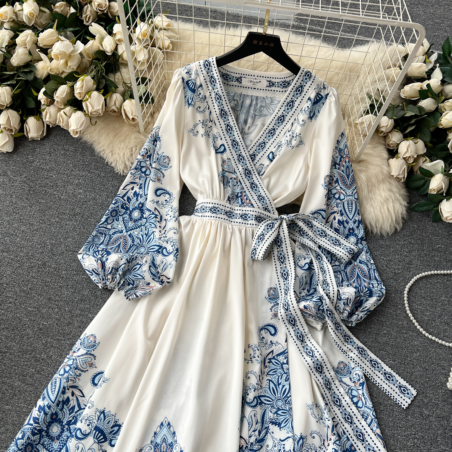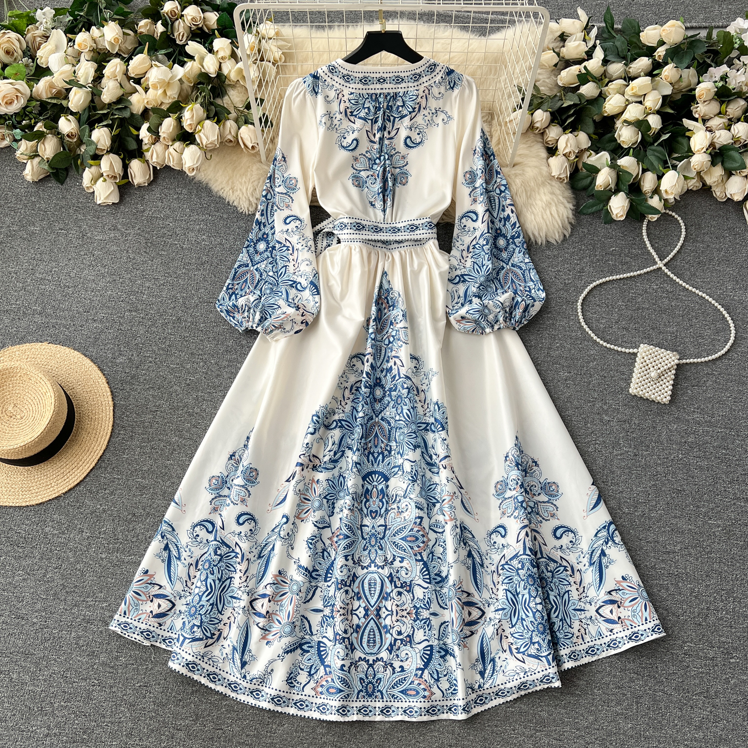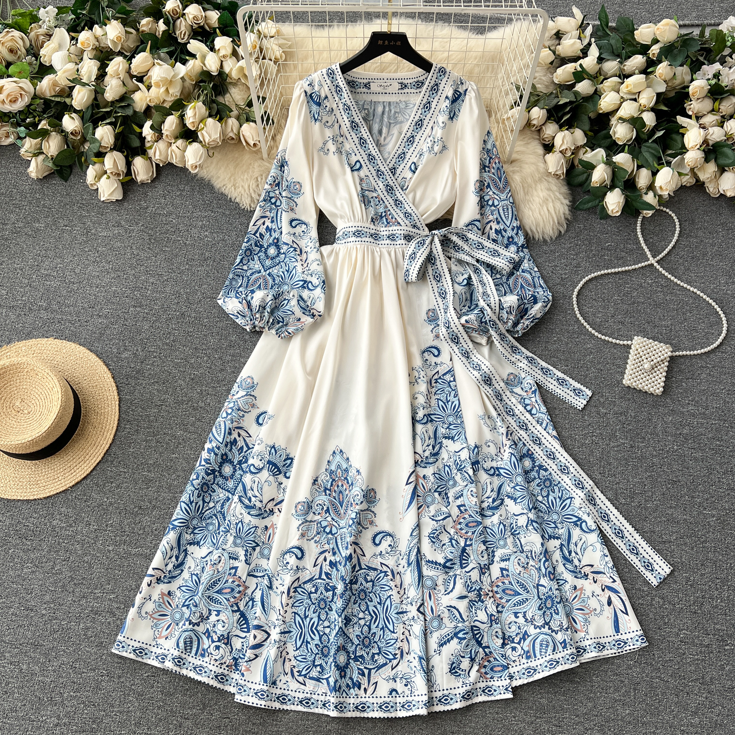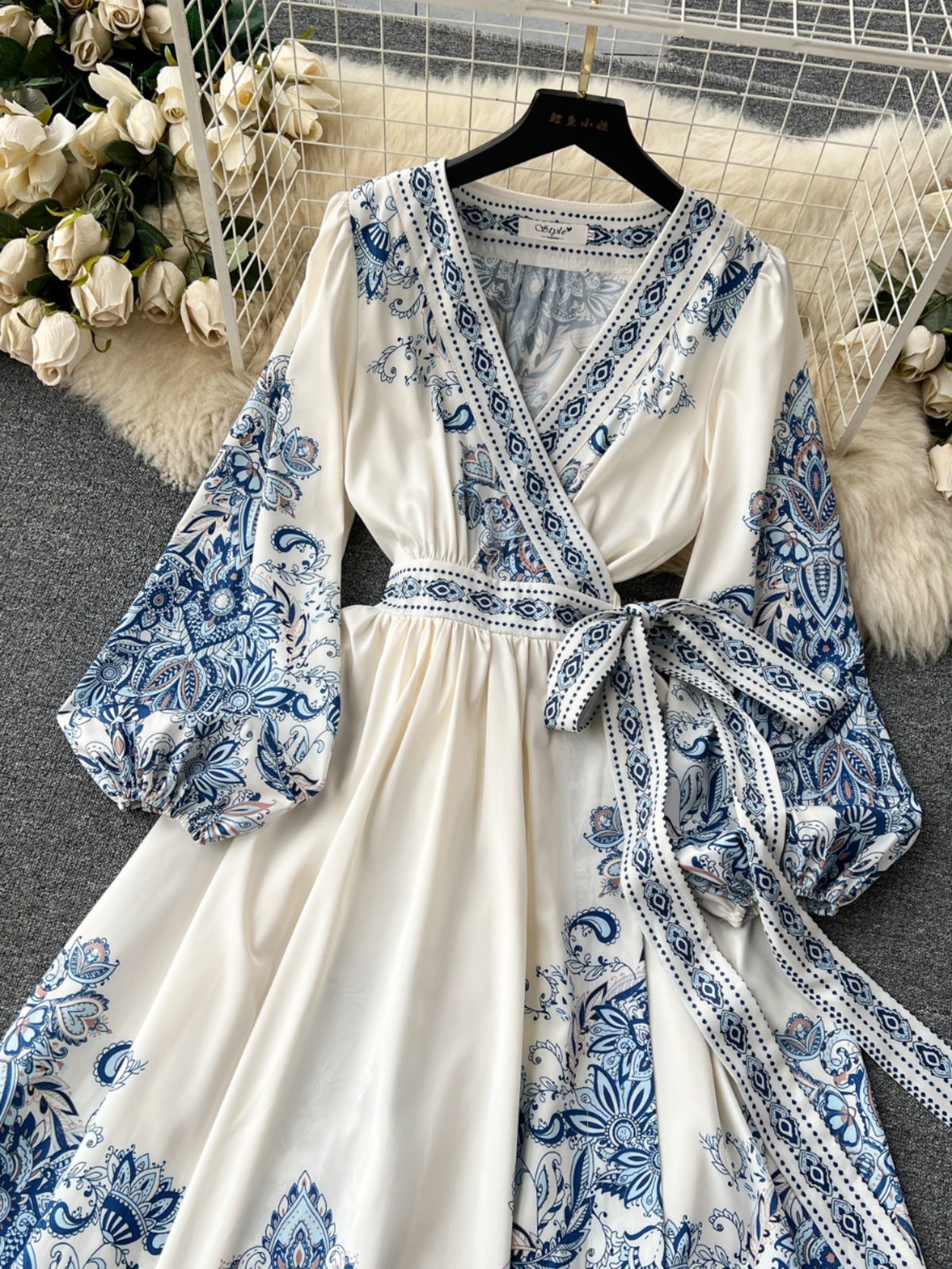 European Luxurious V-Neck Lantern Sleeve Dress with Retro Court Style Prints