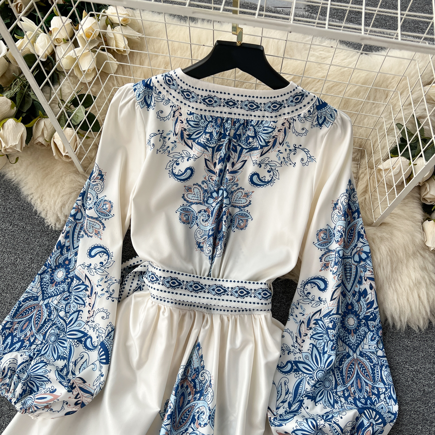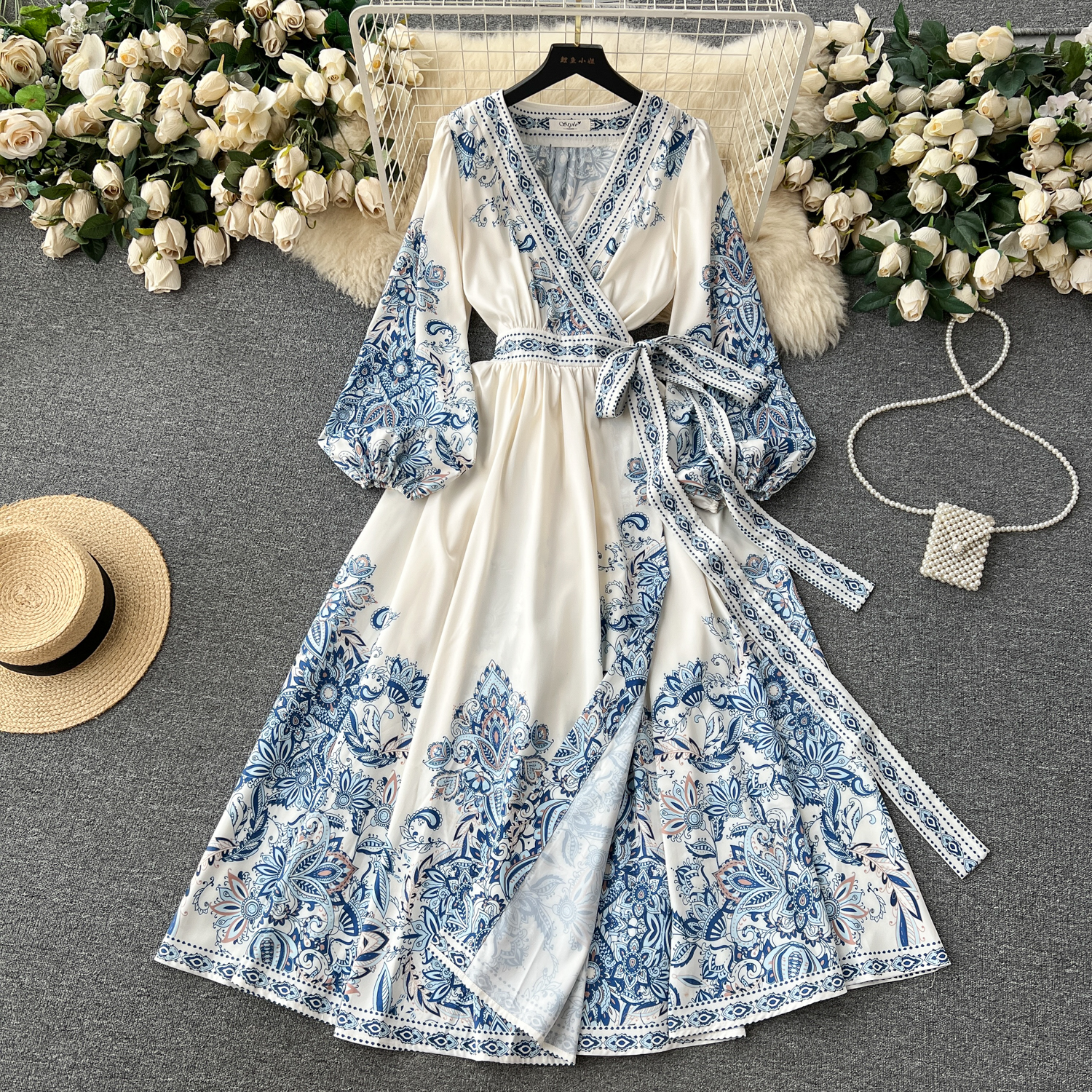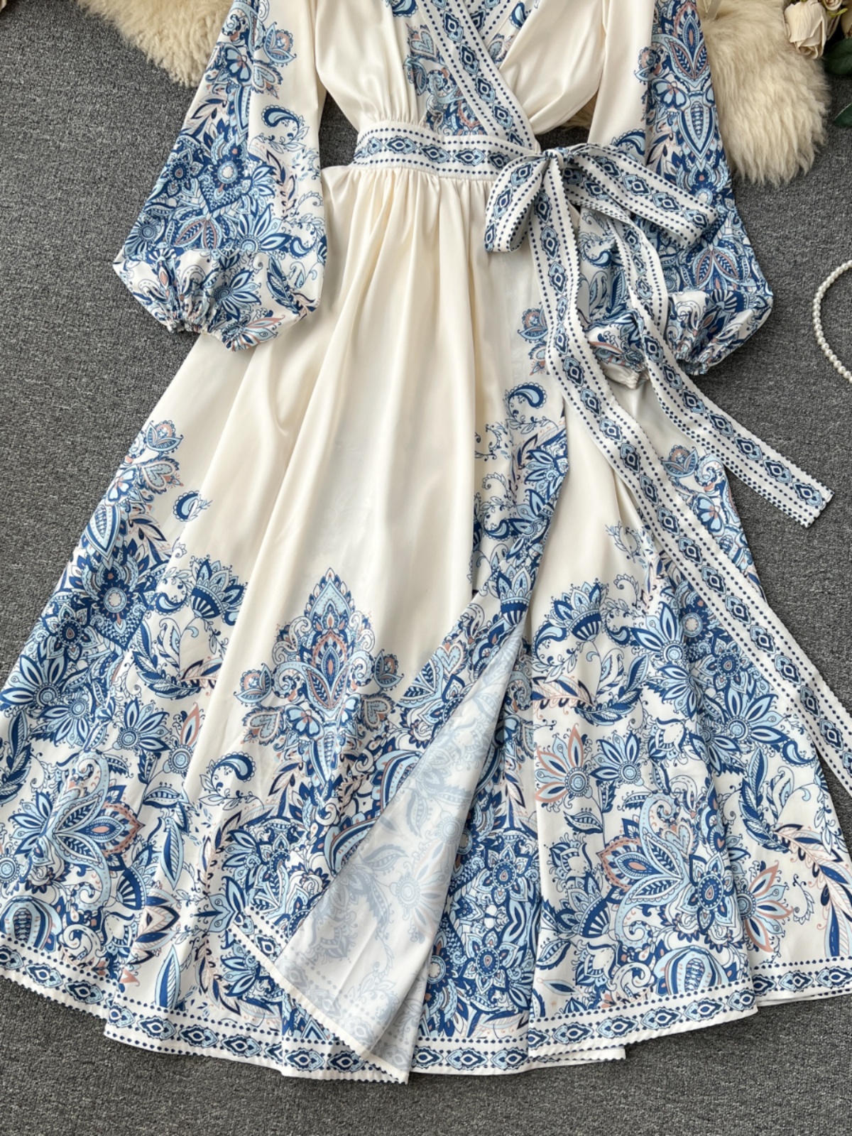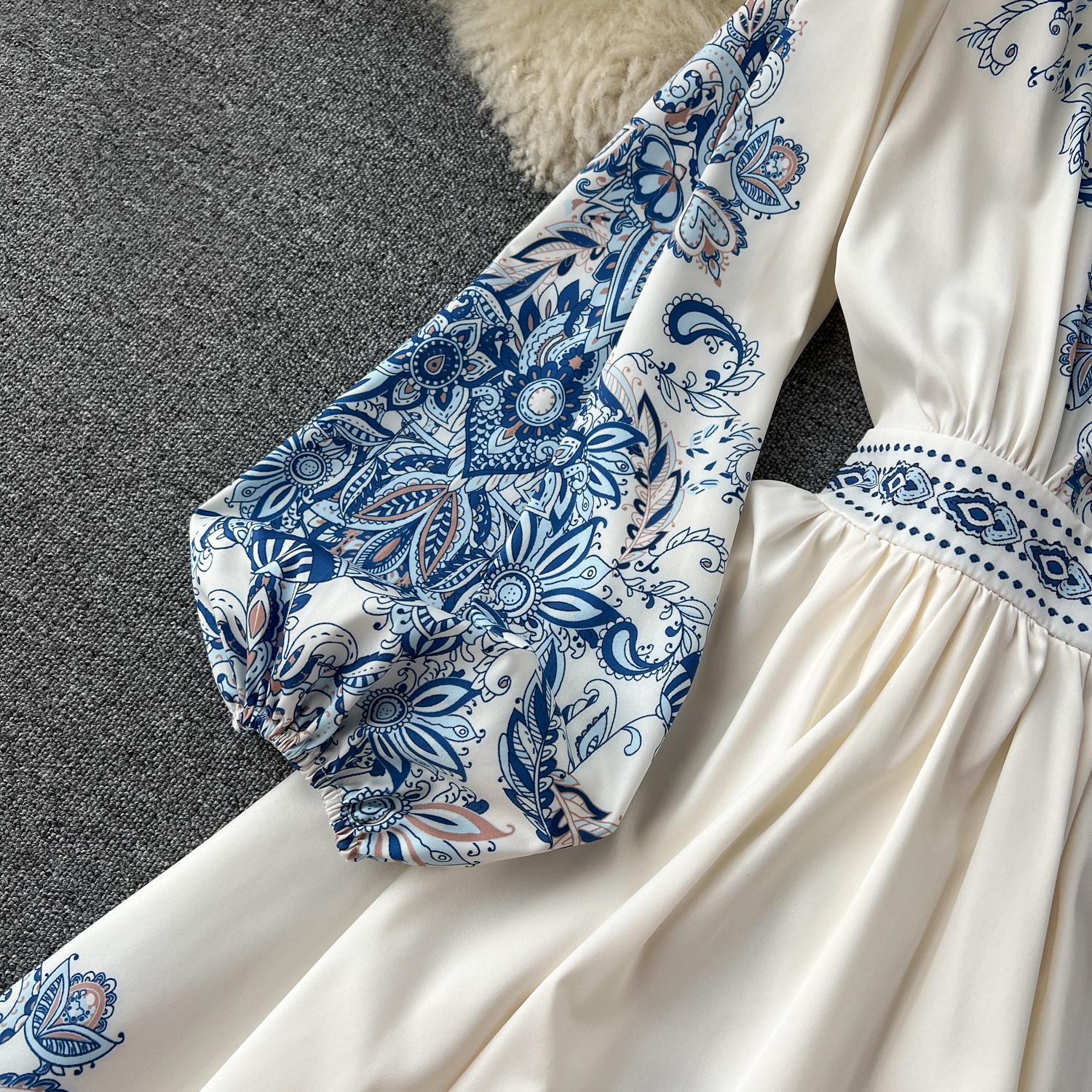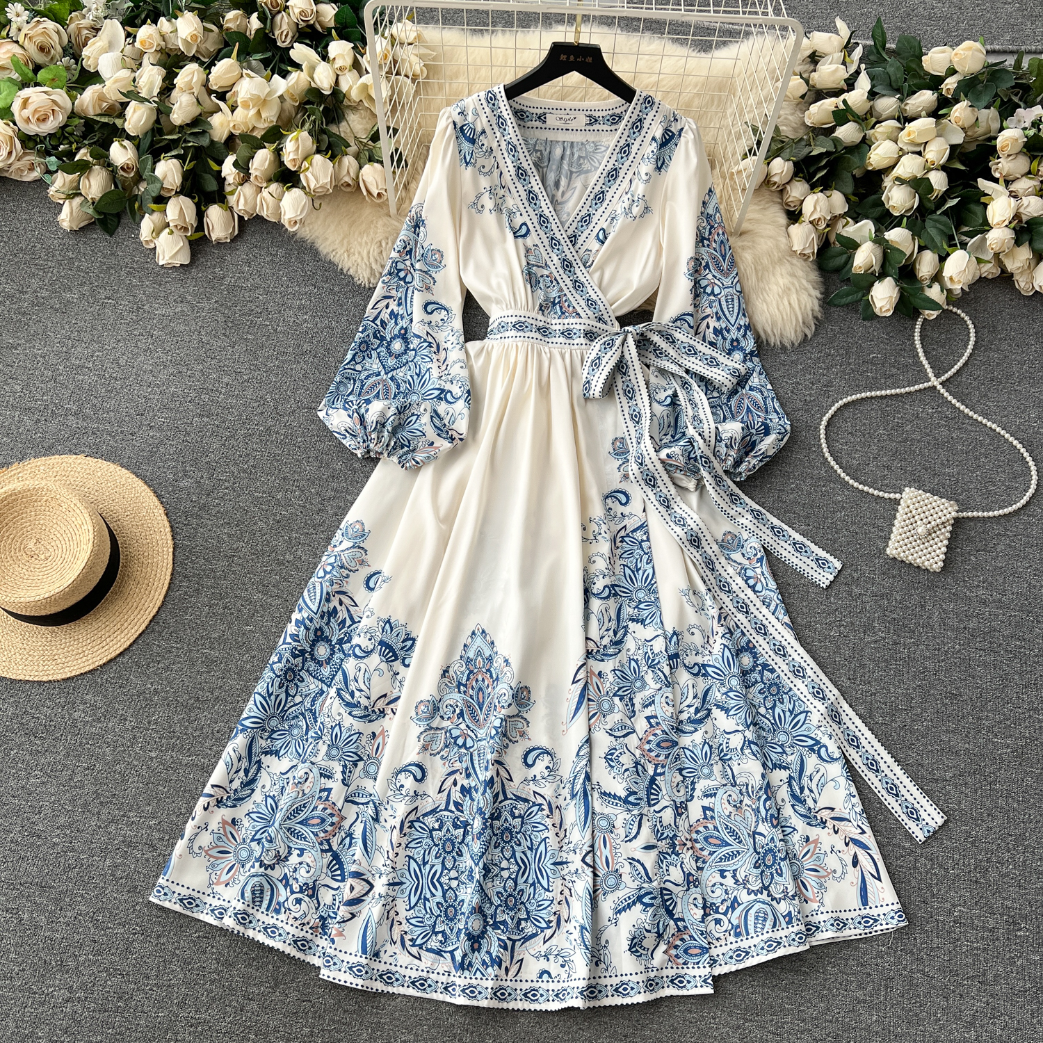 European Luxurious V-Neck Lantern Sleeve Dress with Retro Court Style Prints