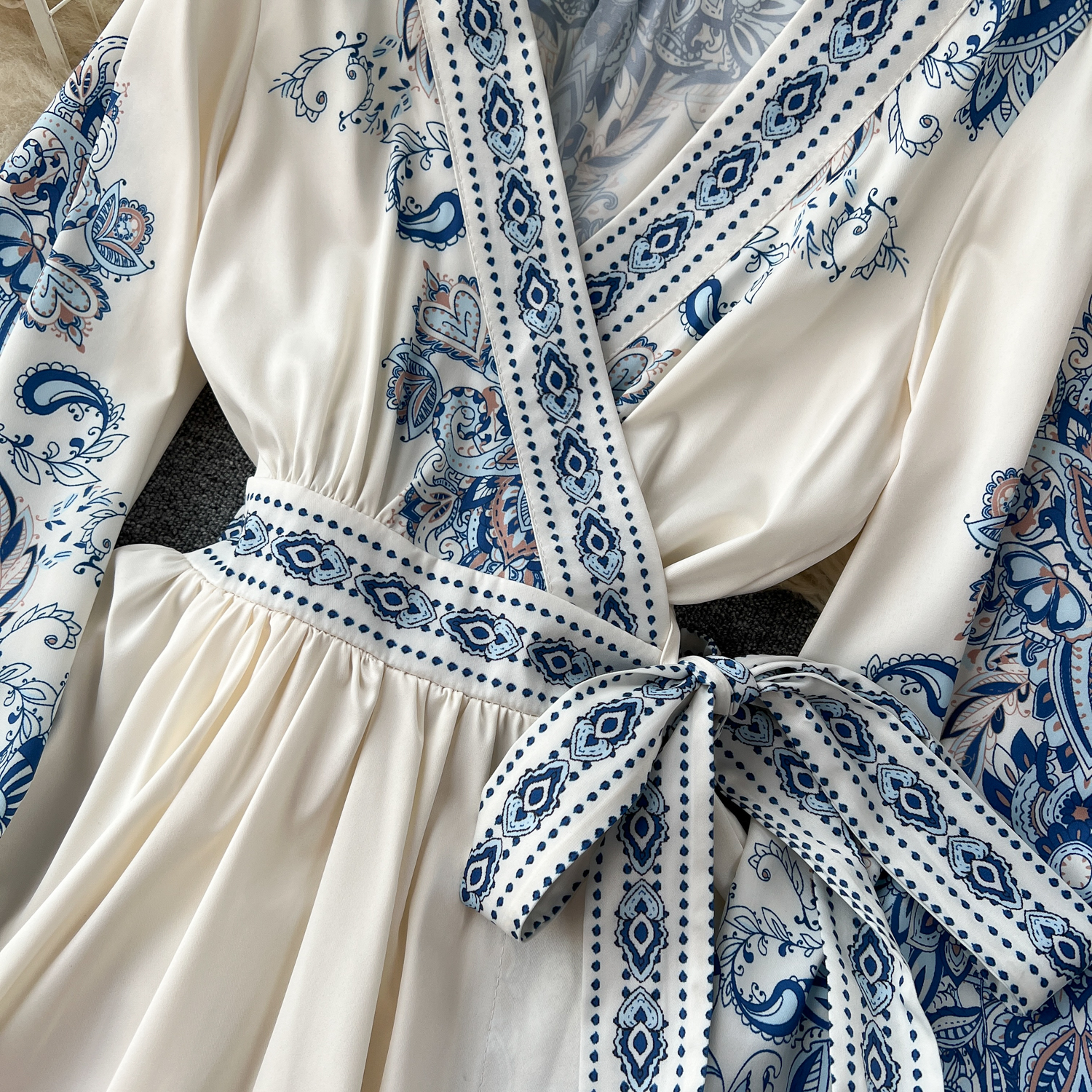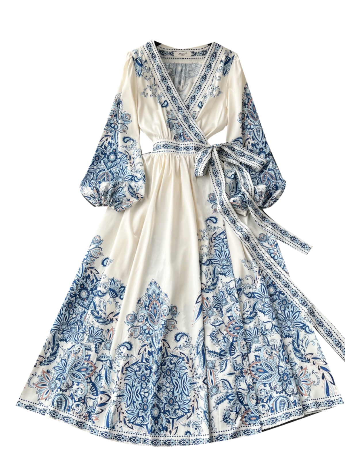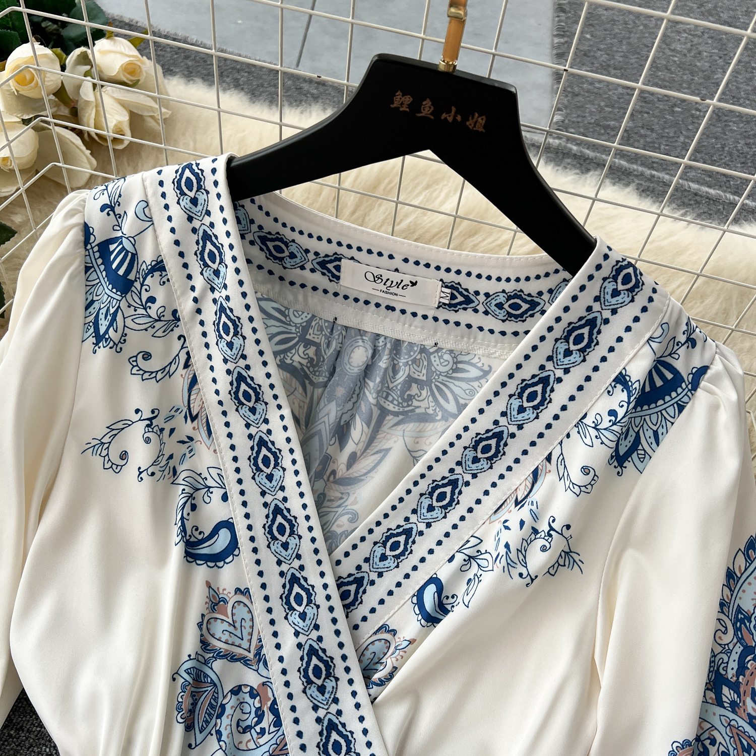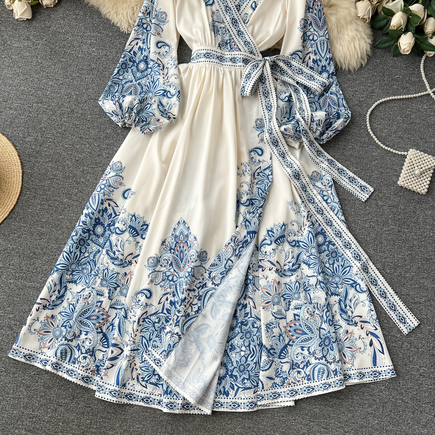 European Luxurious V-Neck Lantern Sleeve Dress with Retro Court Style Prints