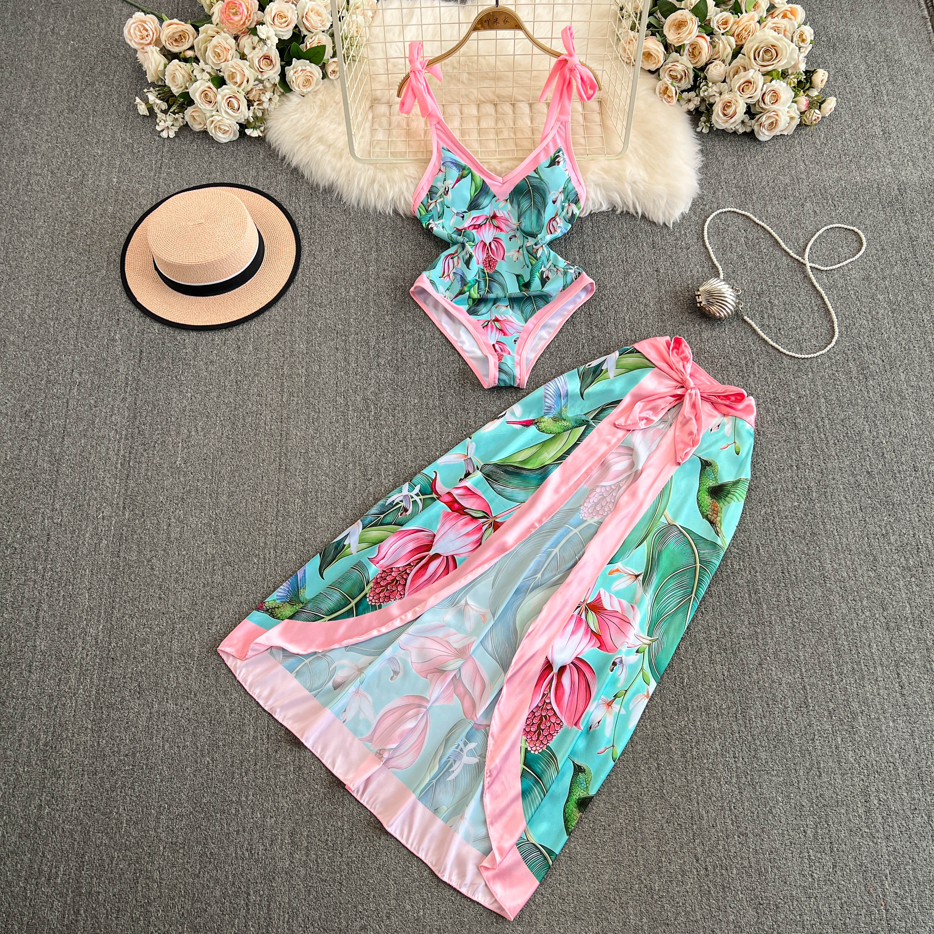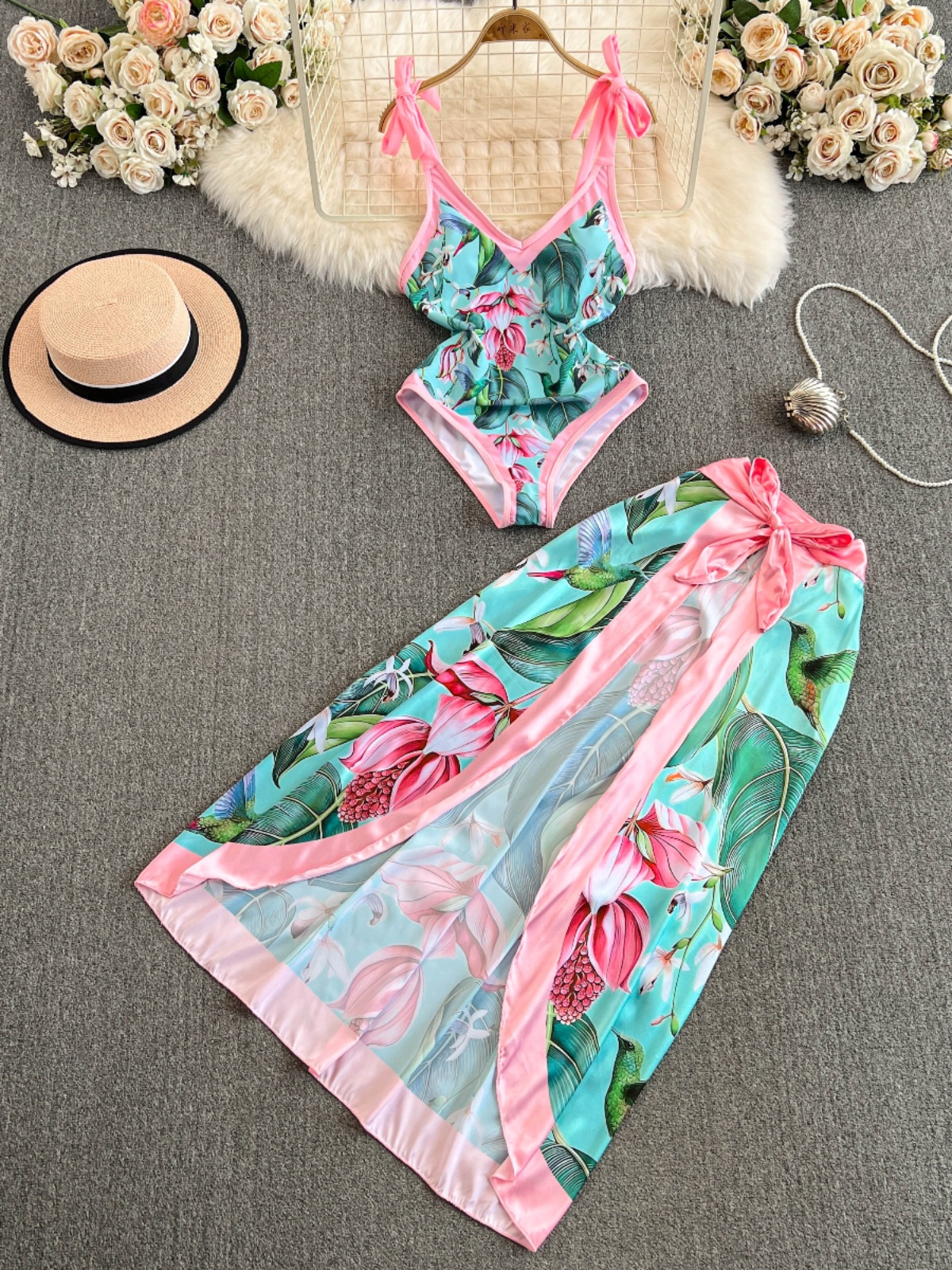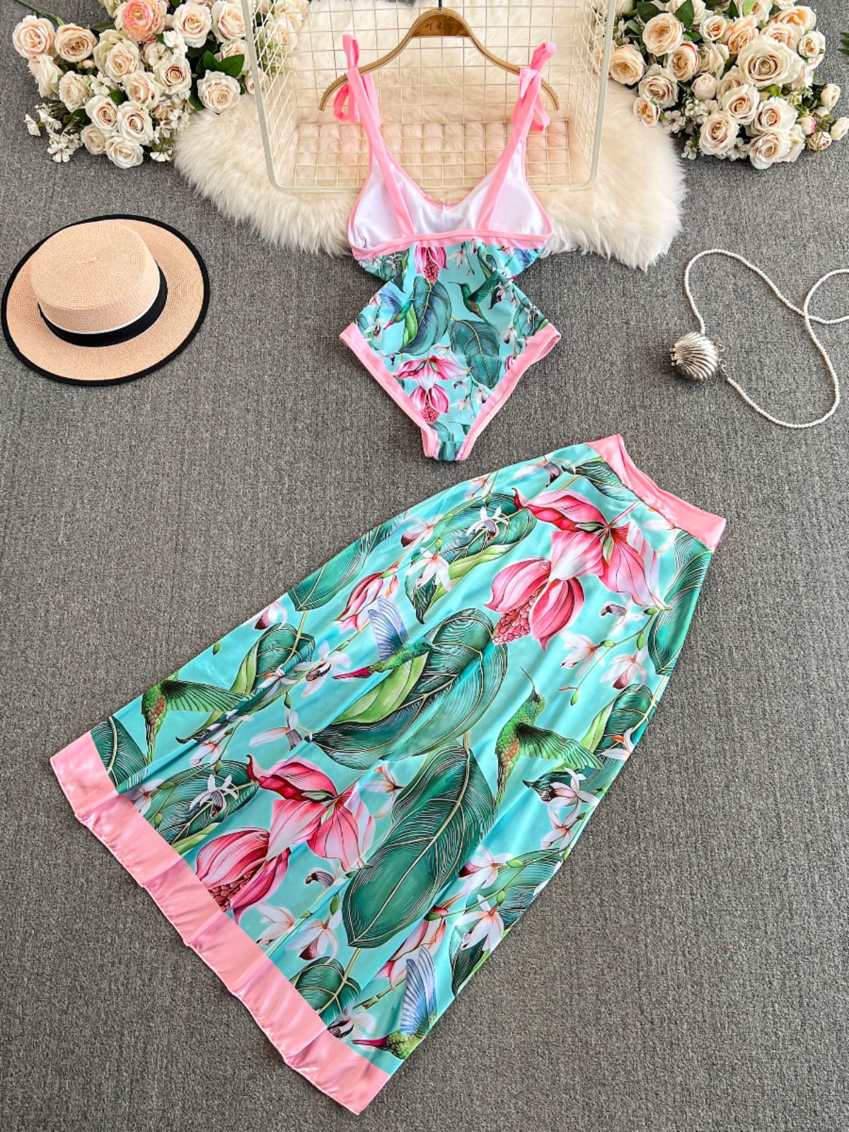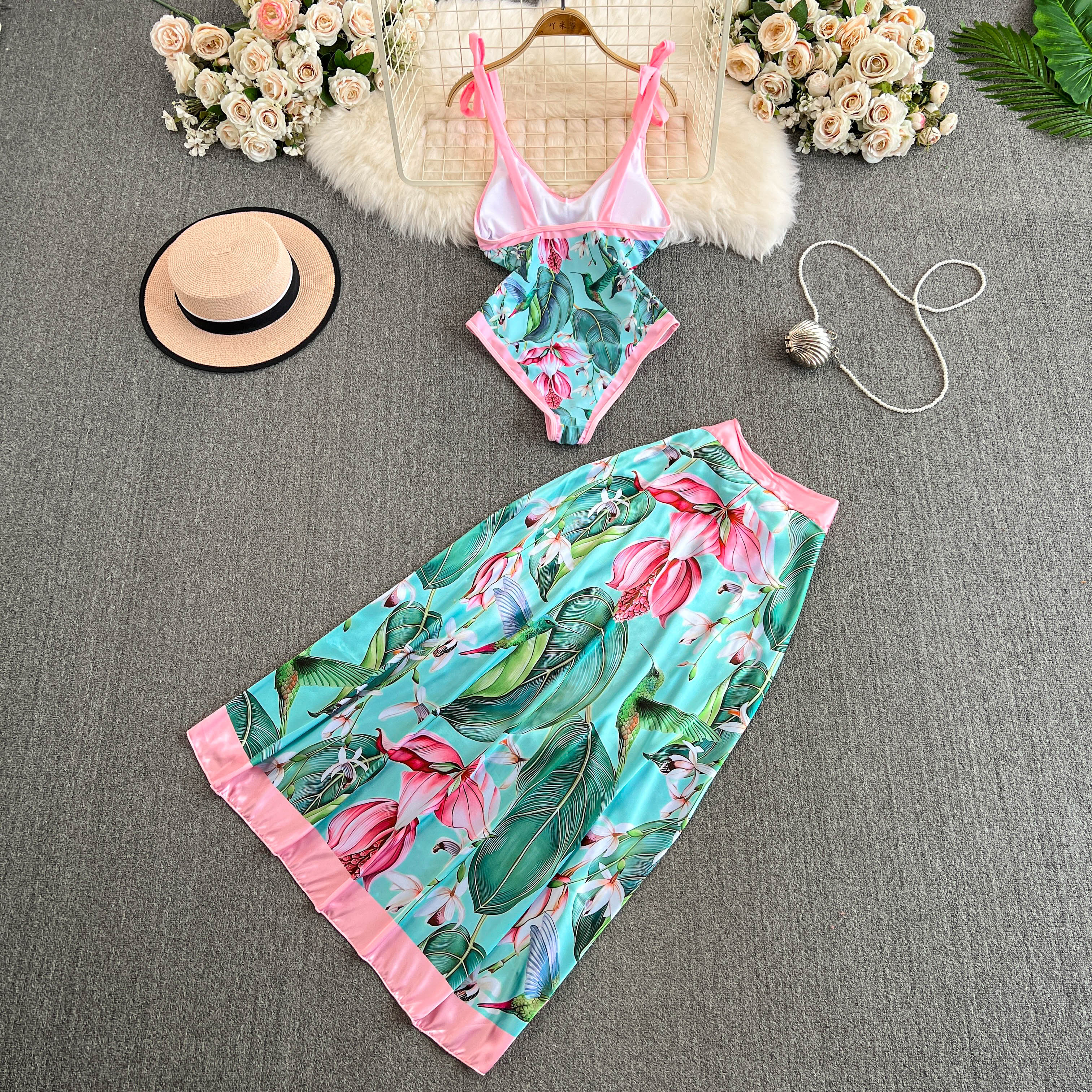 Exquisite Vacation One-Piece Suite with Contrasting Prints and Elegant Tie Skirt Set