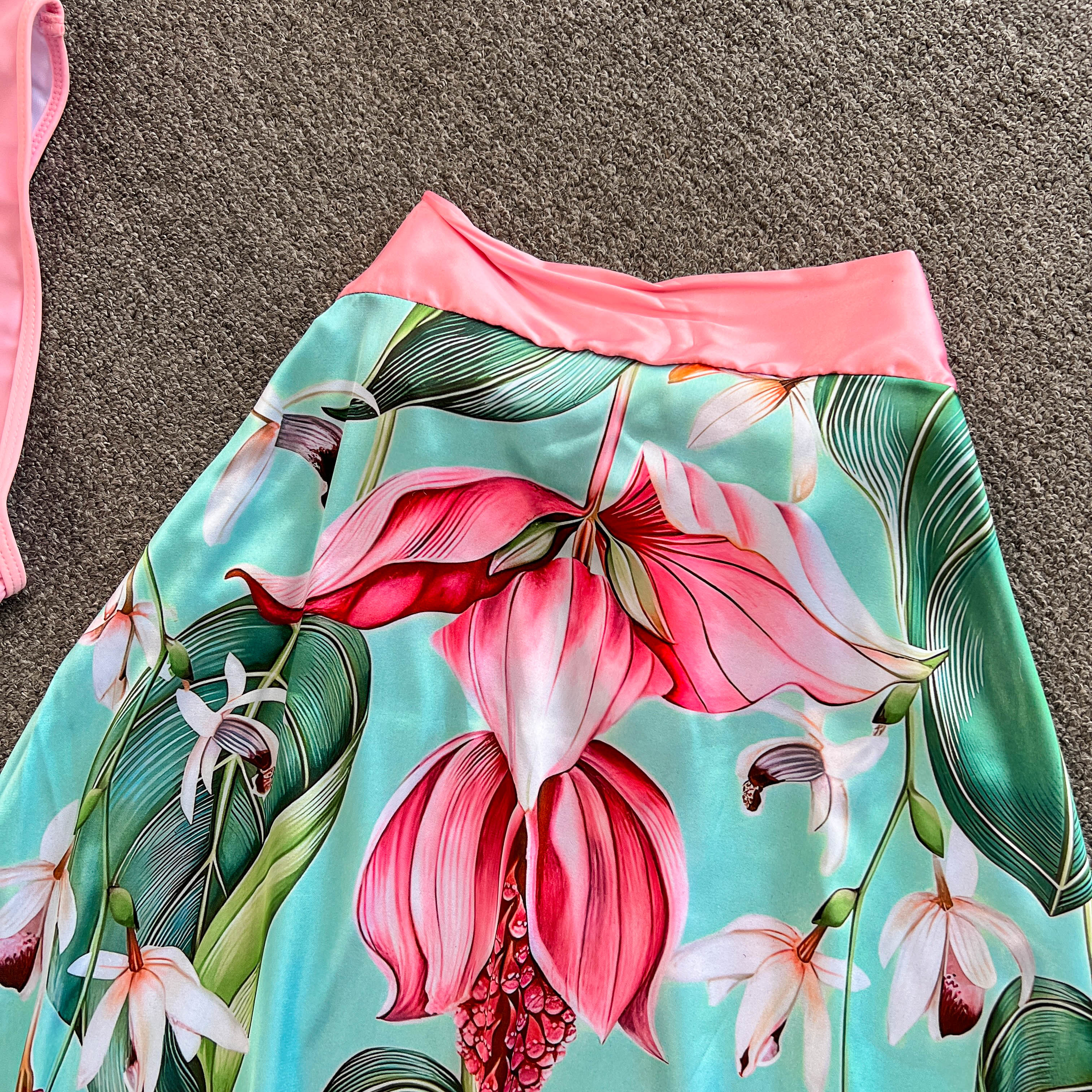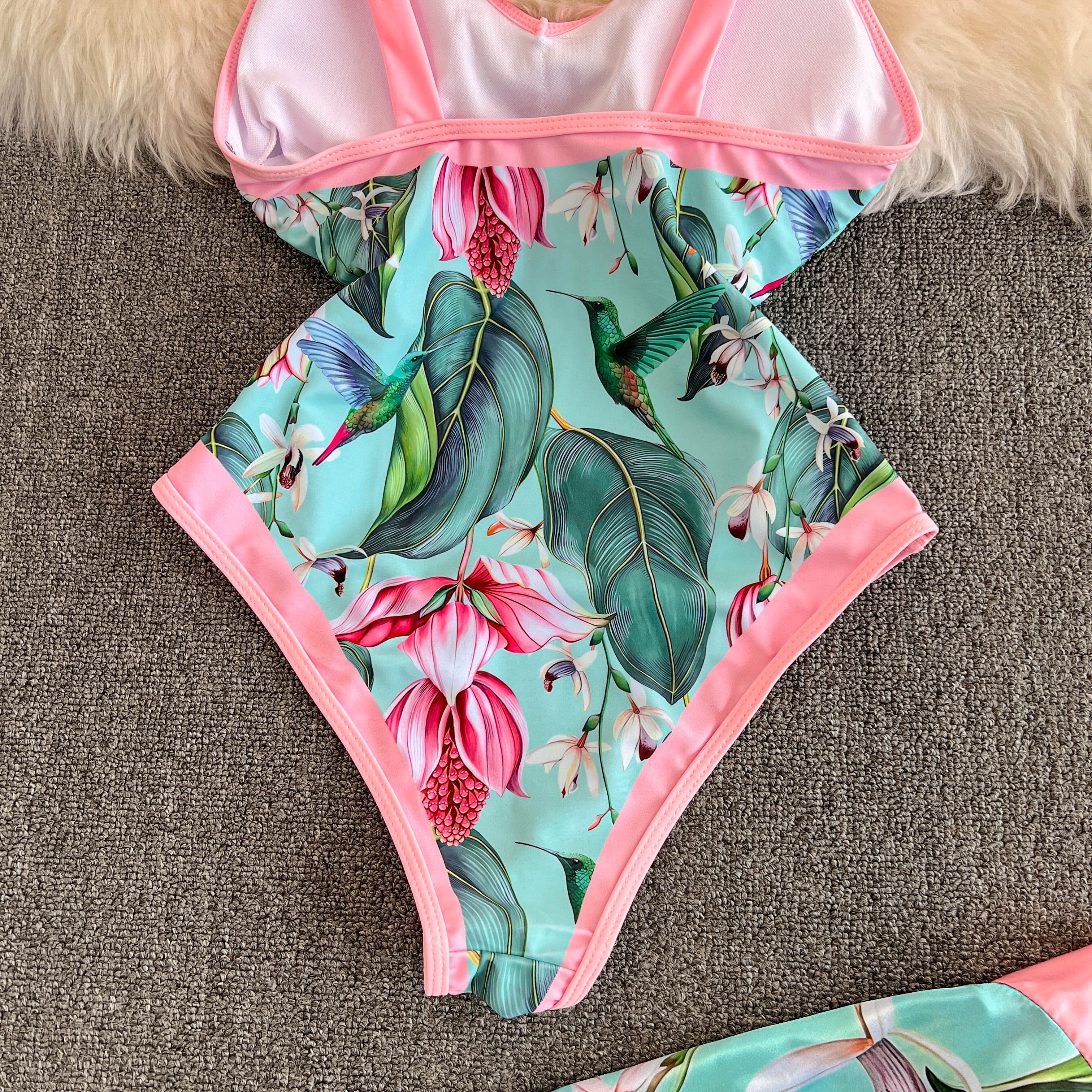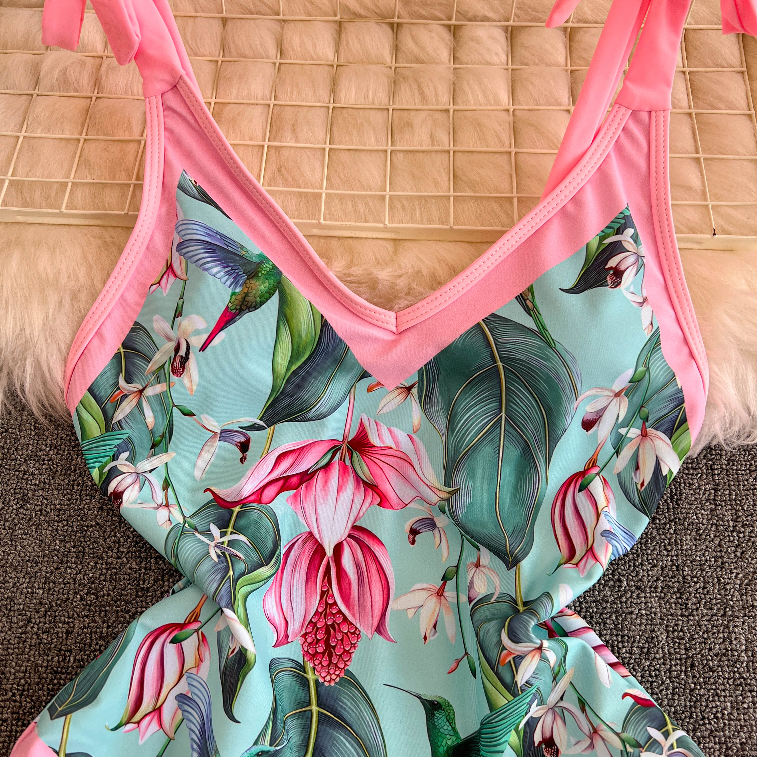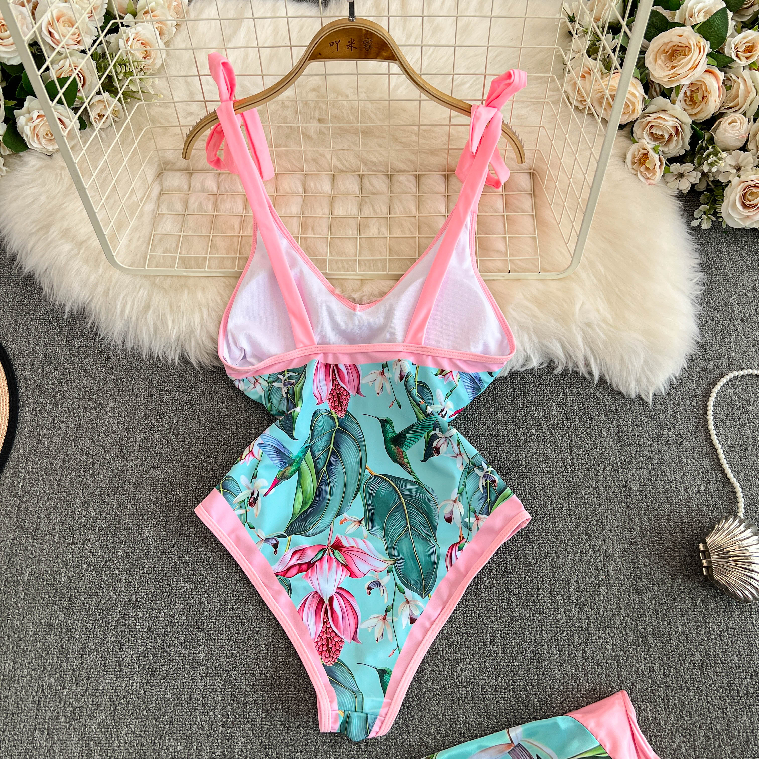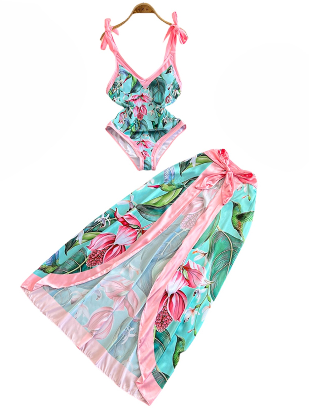 Exquisite Vacation One-Piece Suite with Contrasting Prints and Elegant Tie Skirt Set