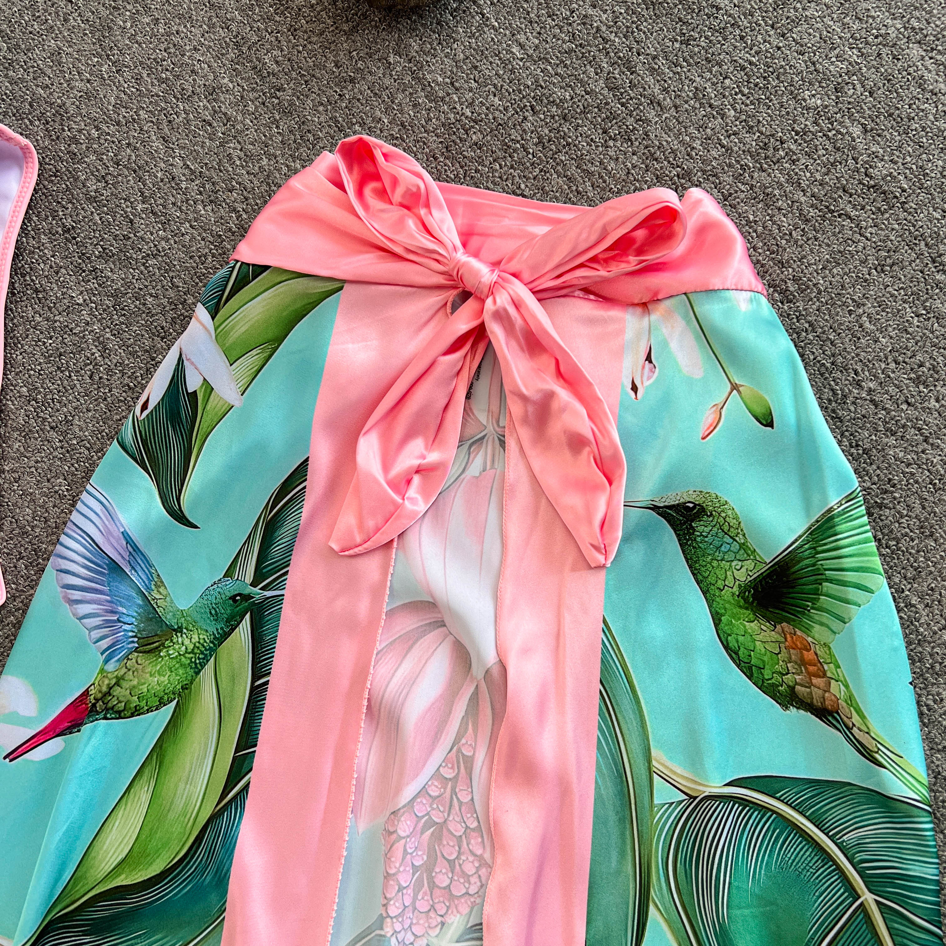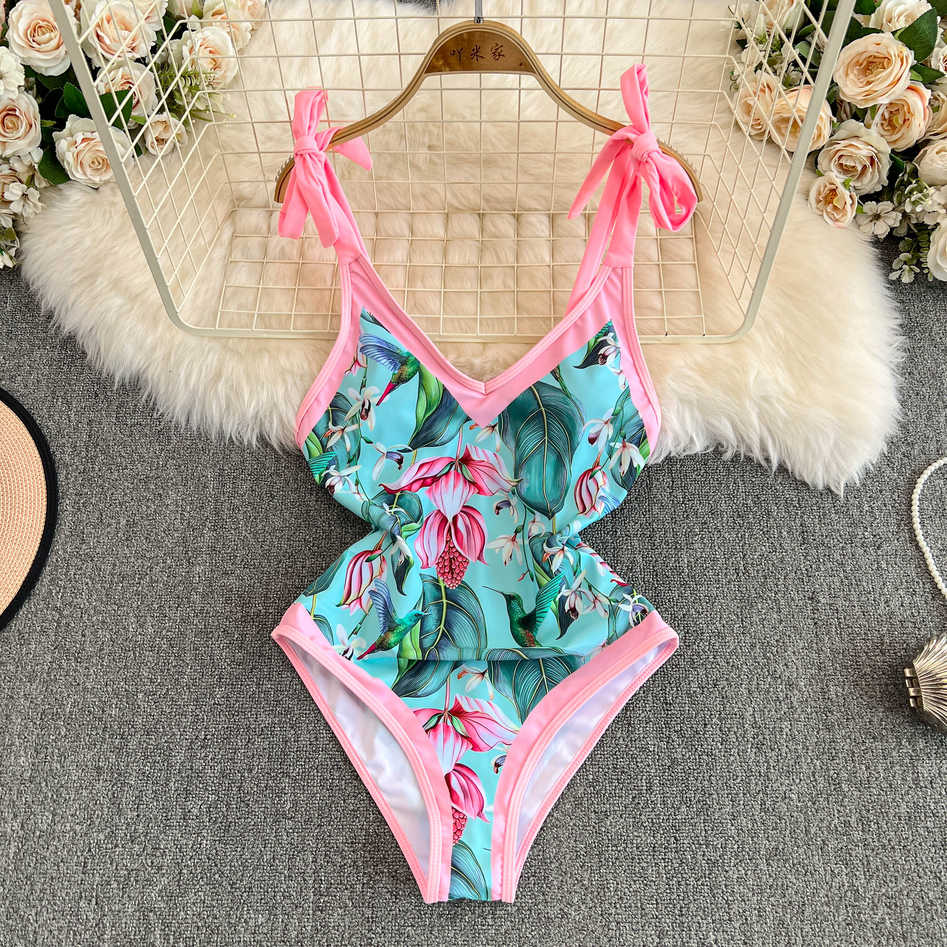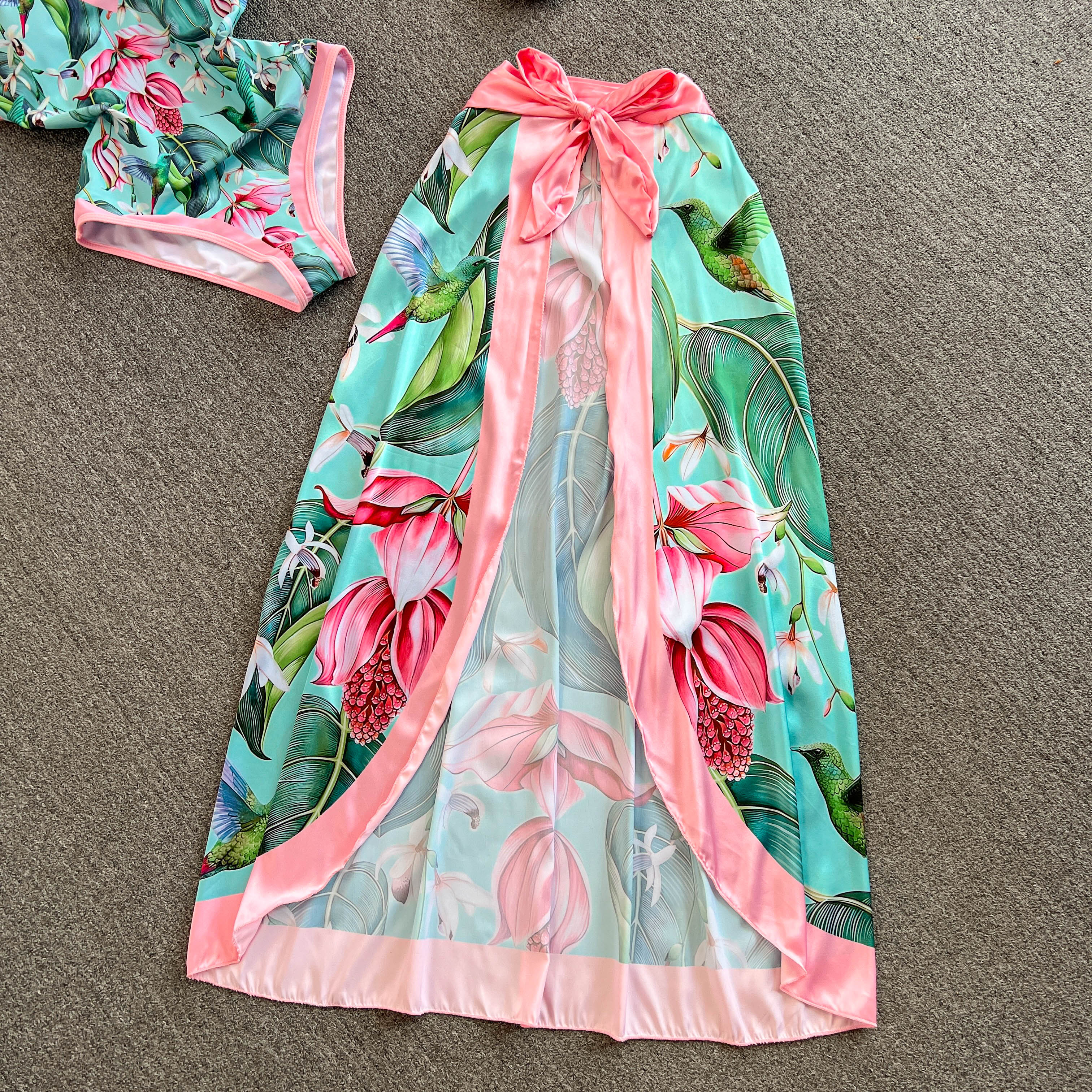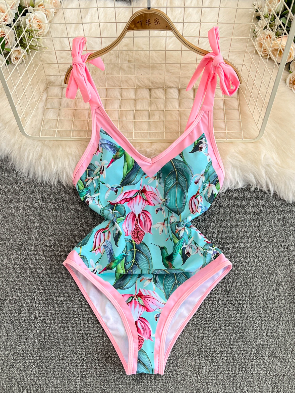Exquisite Vacation One-Piece Suite with Contrasting Prints and Elegant Tie Skirt Set