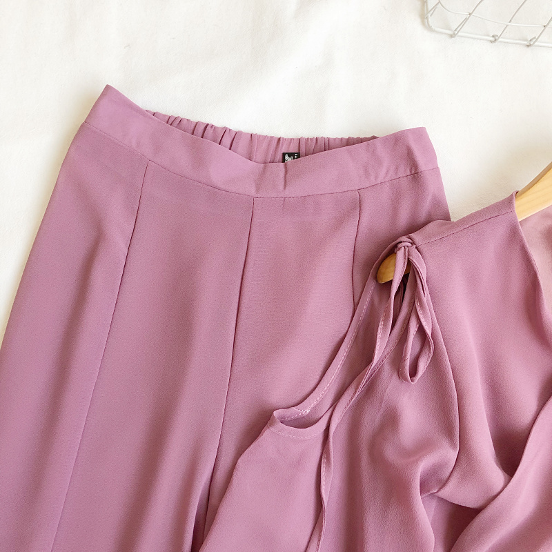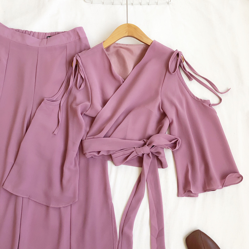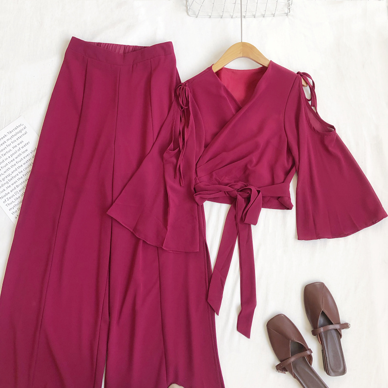 Fashionable Temperament V-Neck Tie Waist Short Bell Sleeve Shirt With High-Waisted Slit Wide-Leg Pants