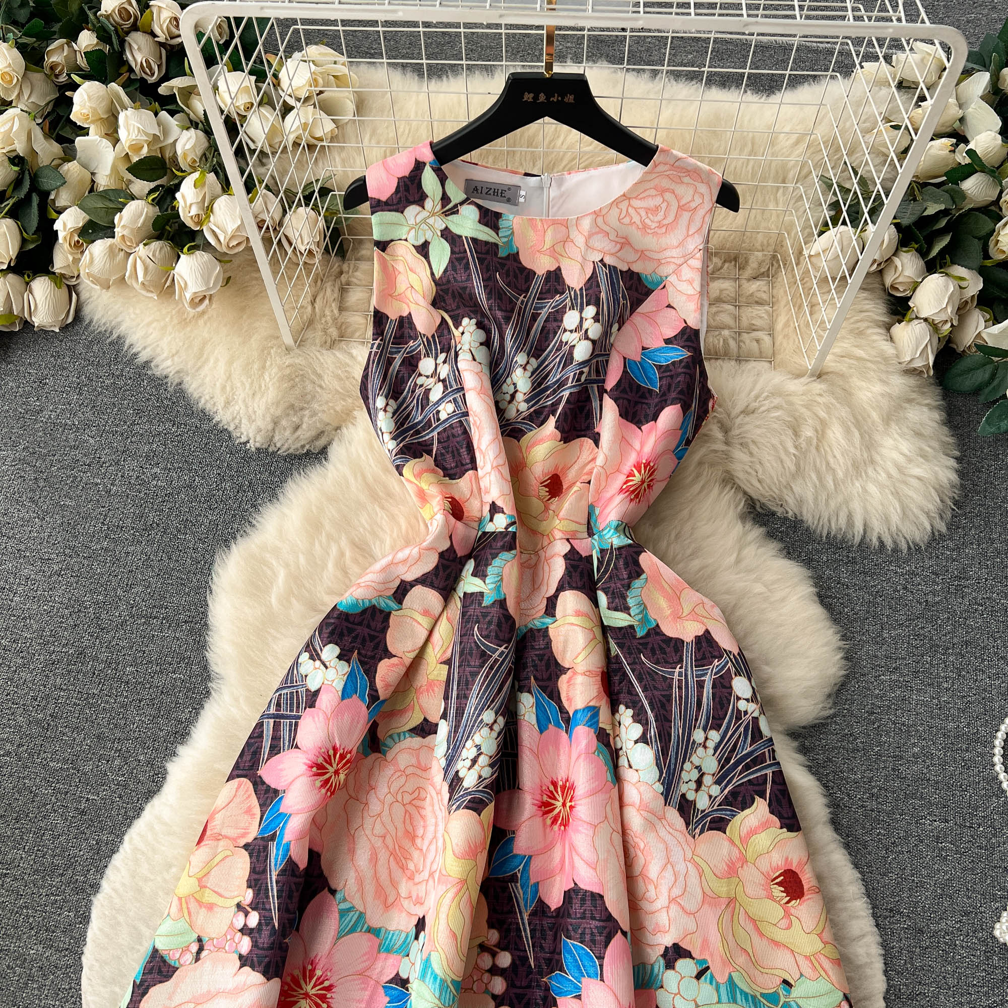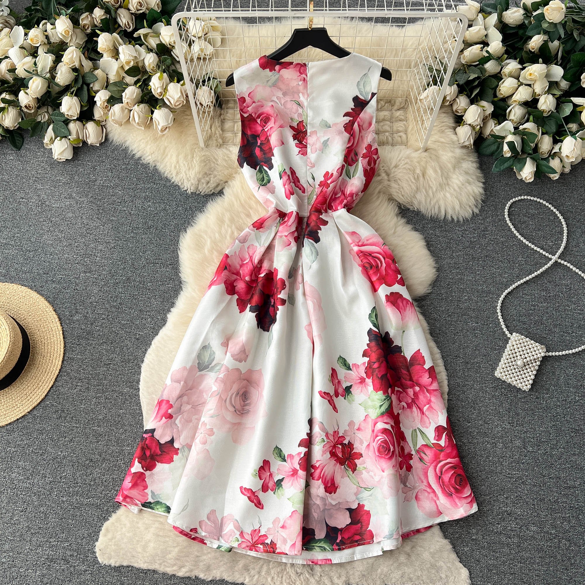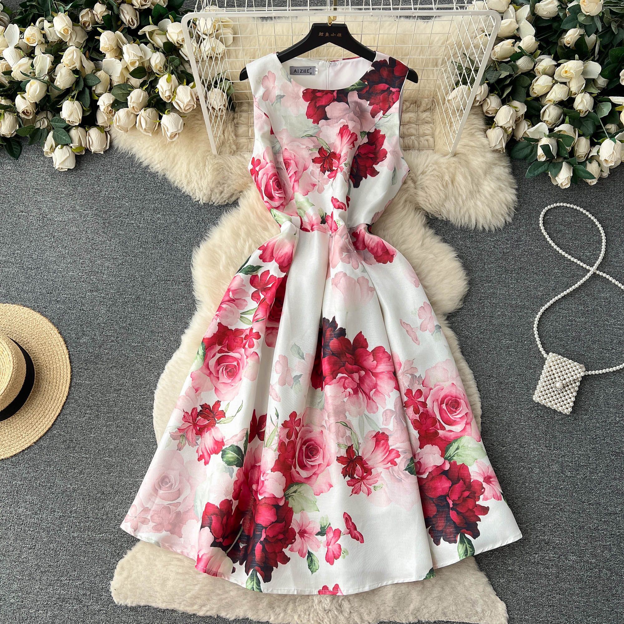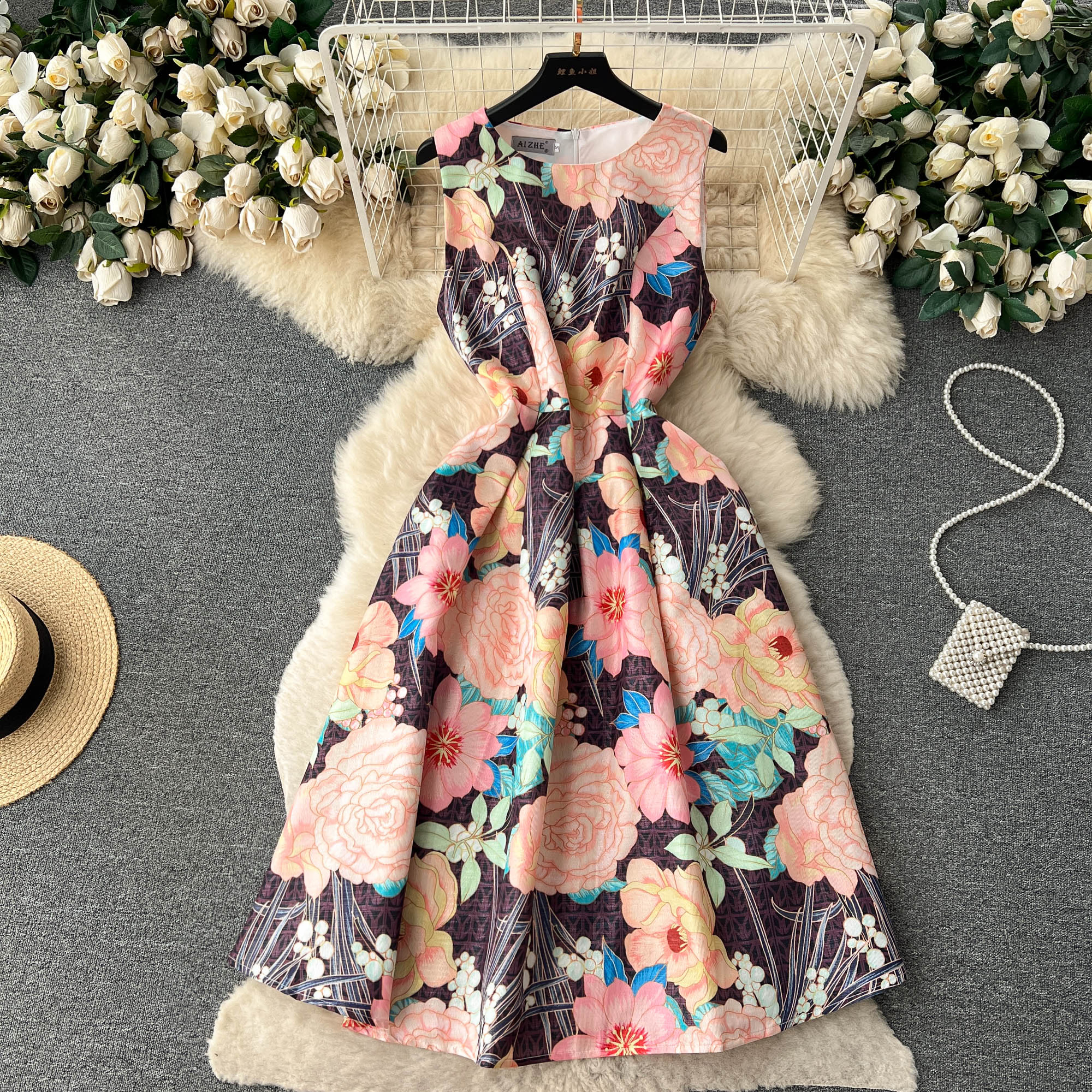Floral Elegant Sleeveless Pleated Waist-Defining Skirt Dress For Women