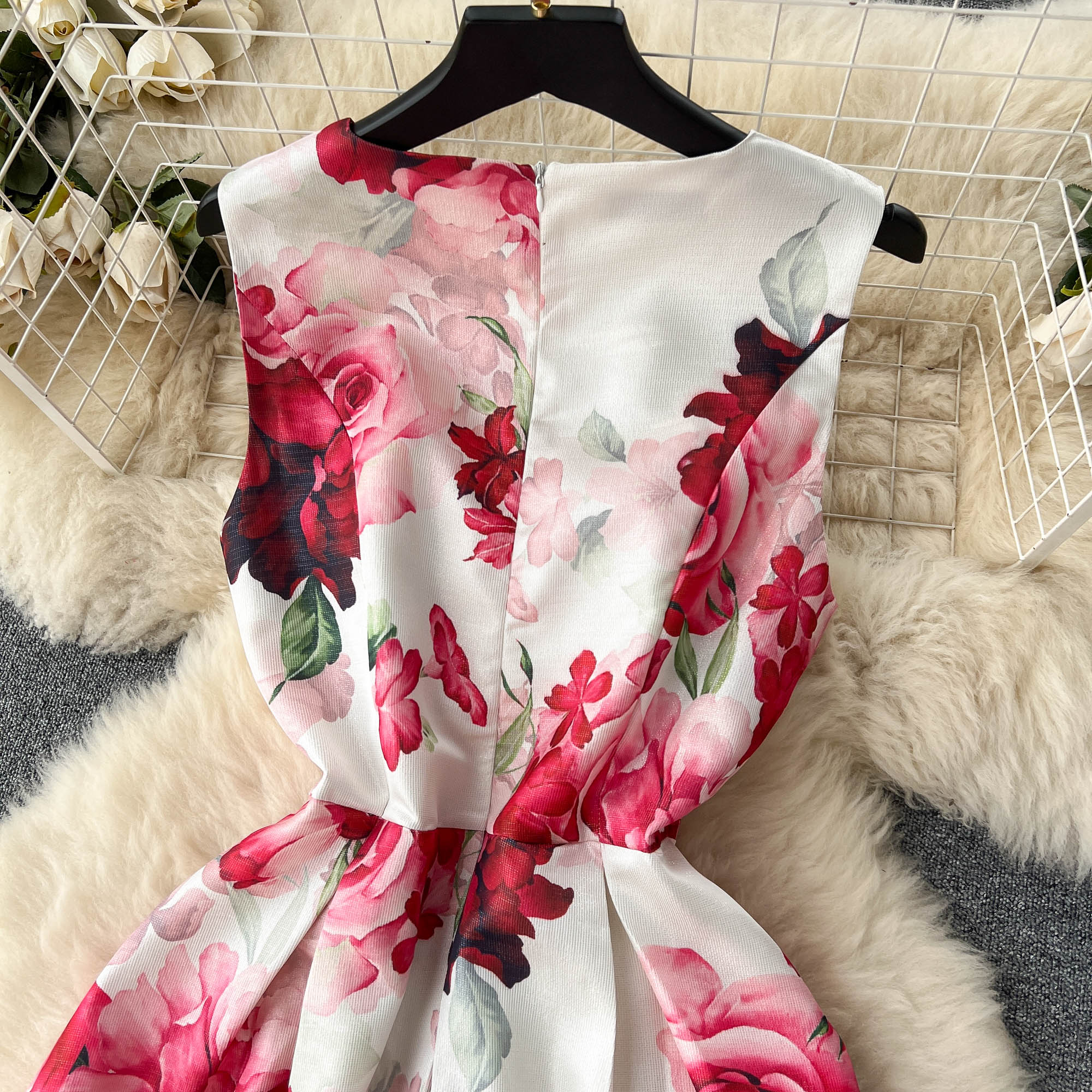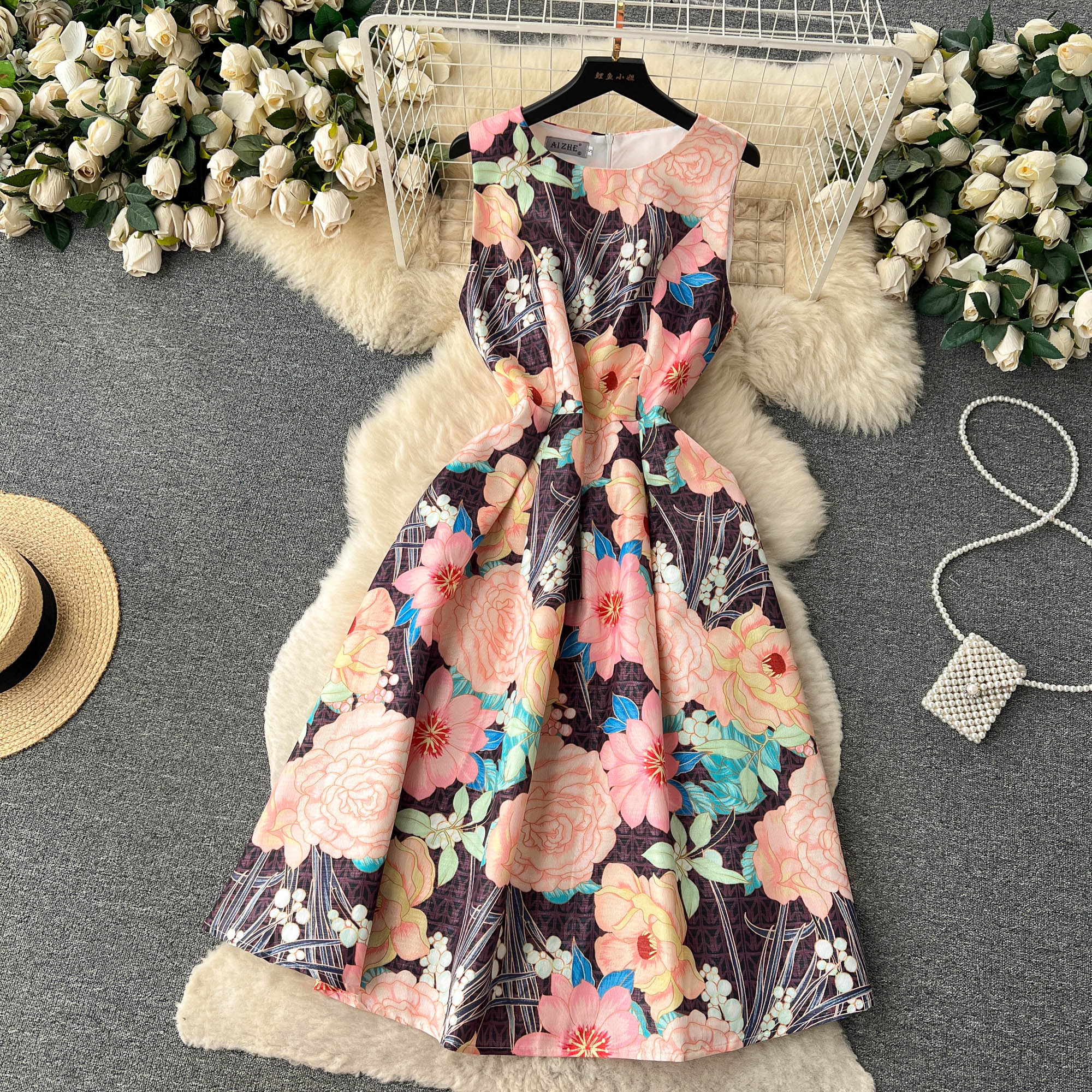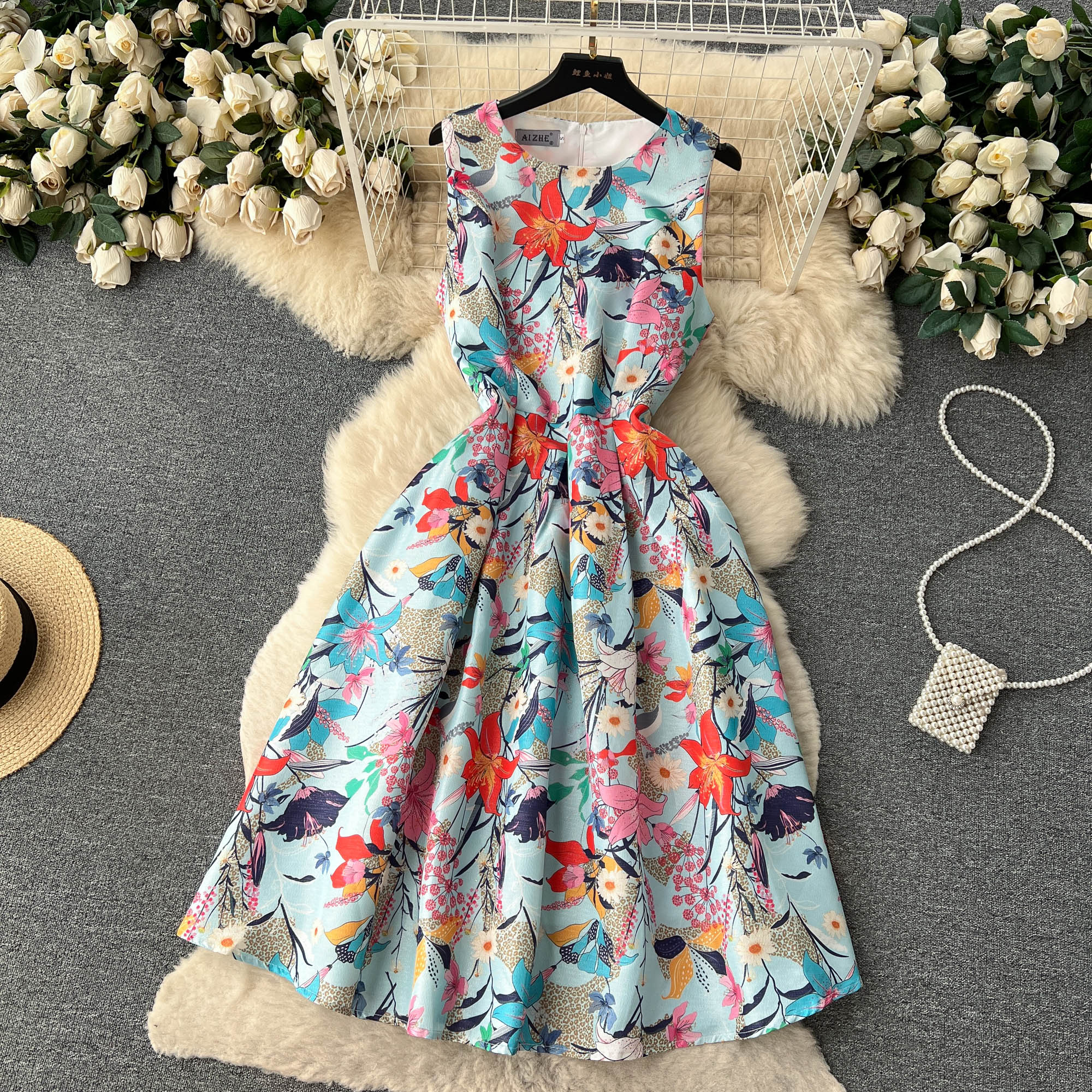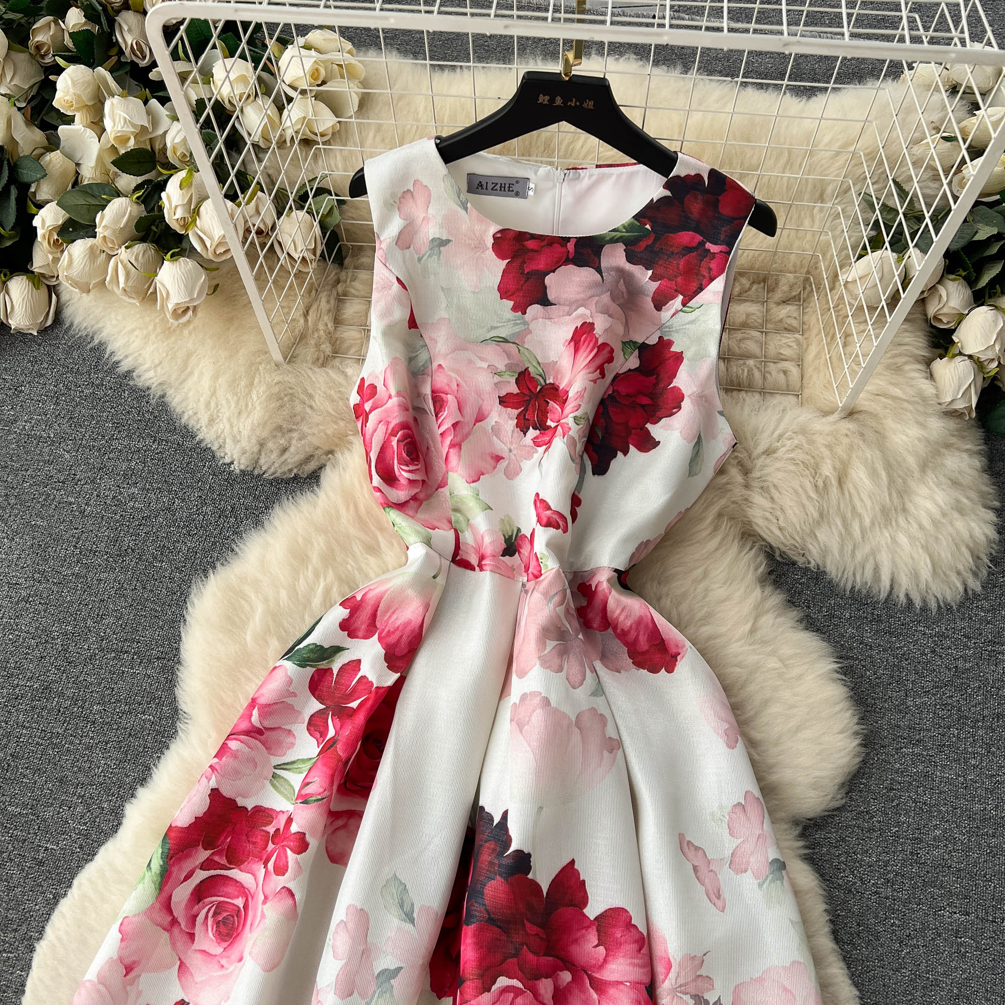 Floral Elegant Sleeveless Pleated Waist-Defining Skirt Dress For Women