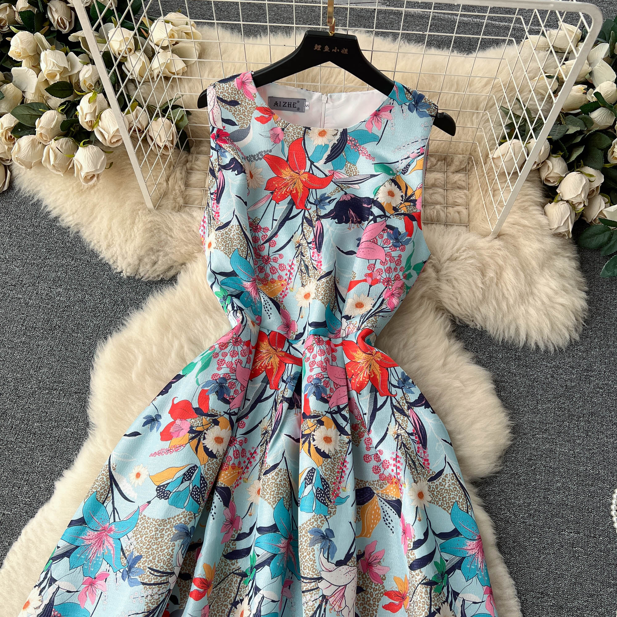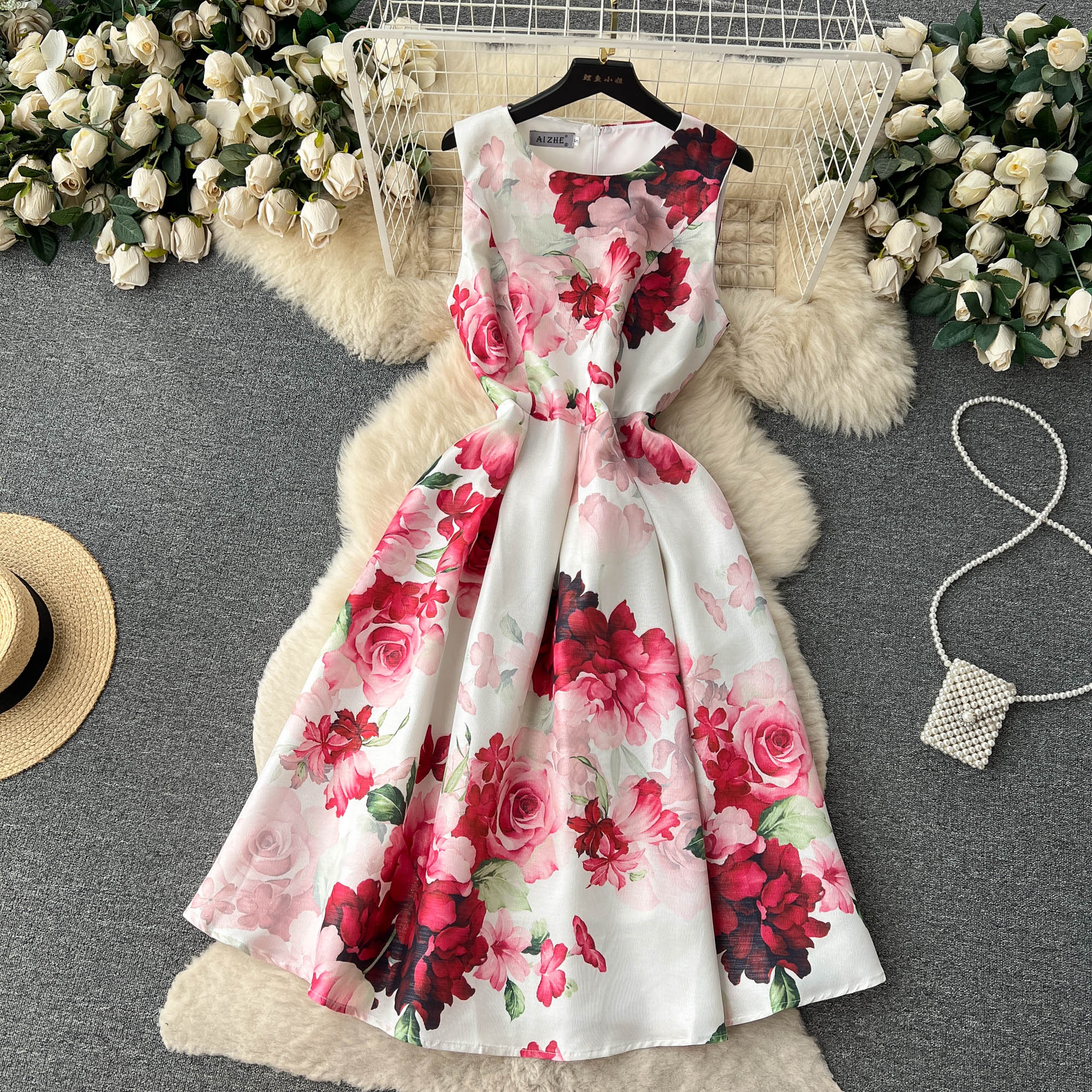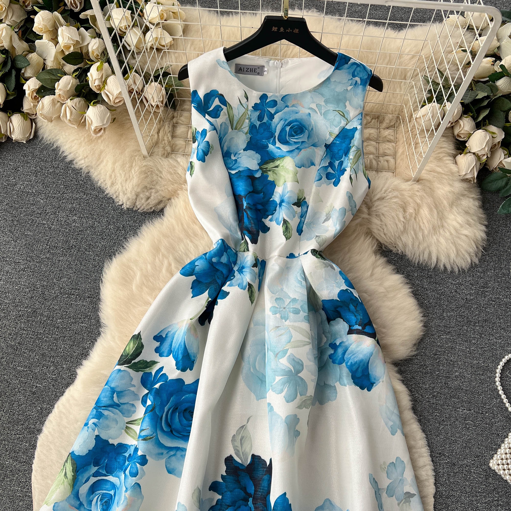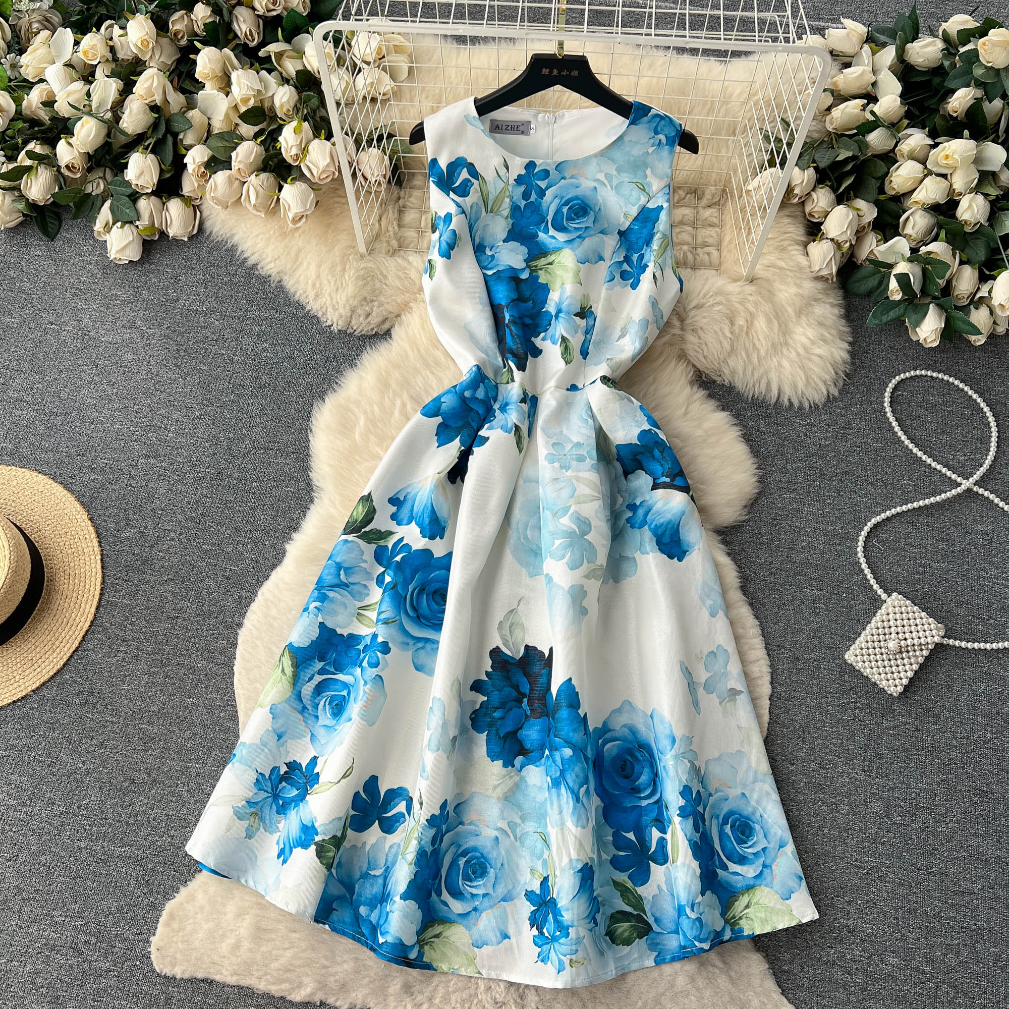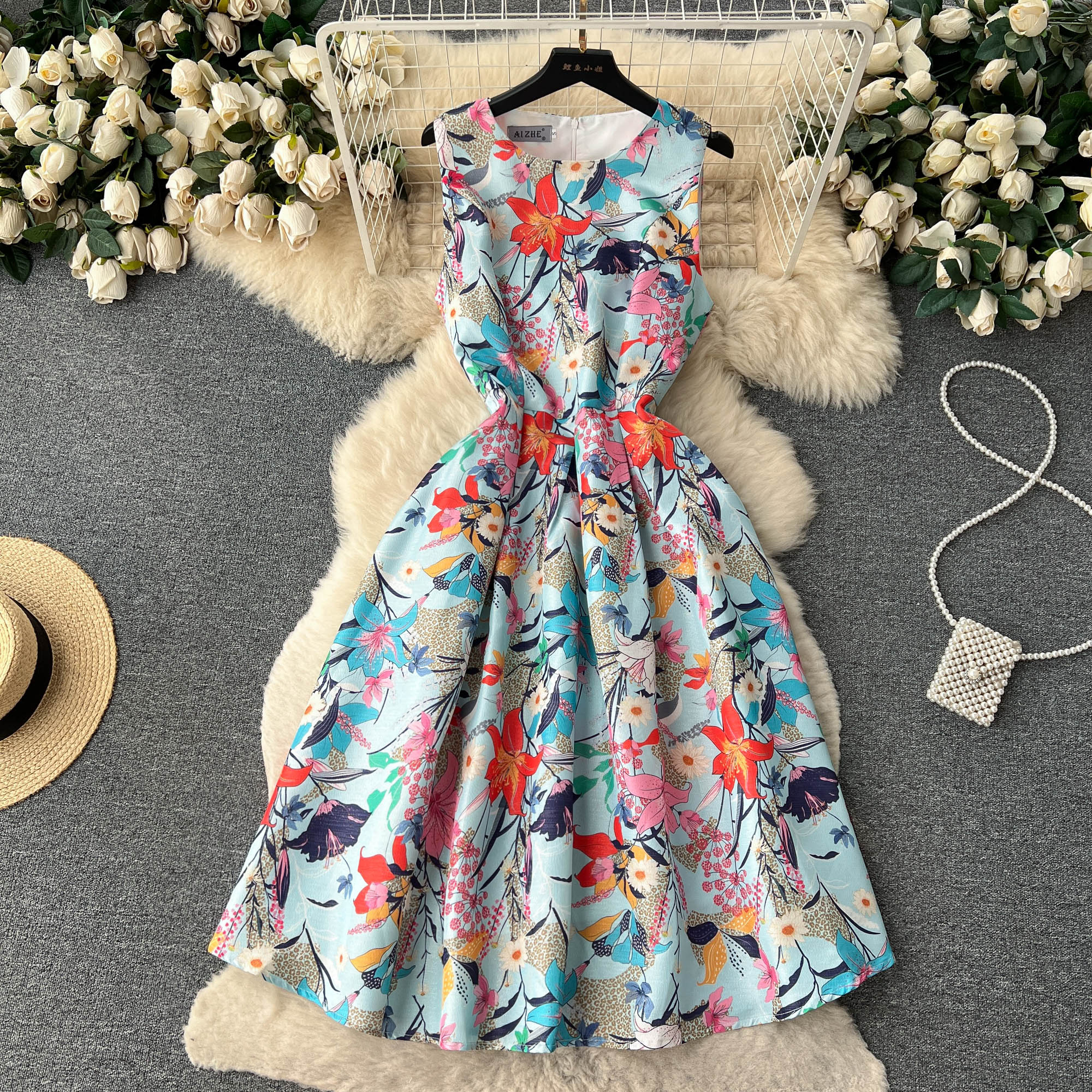 Floral Elegant Sleeveless Pleated Waist-Defining Skirt Dress For Women