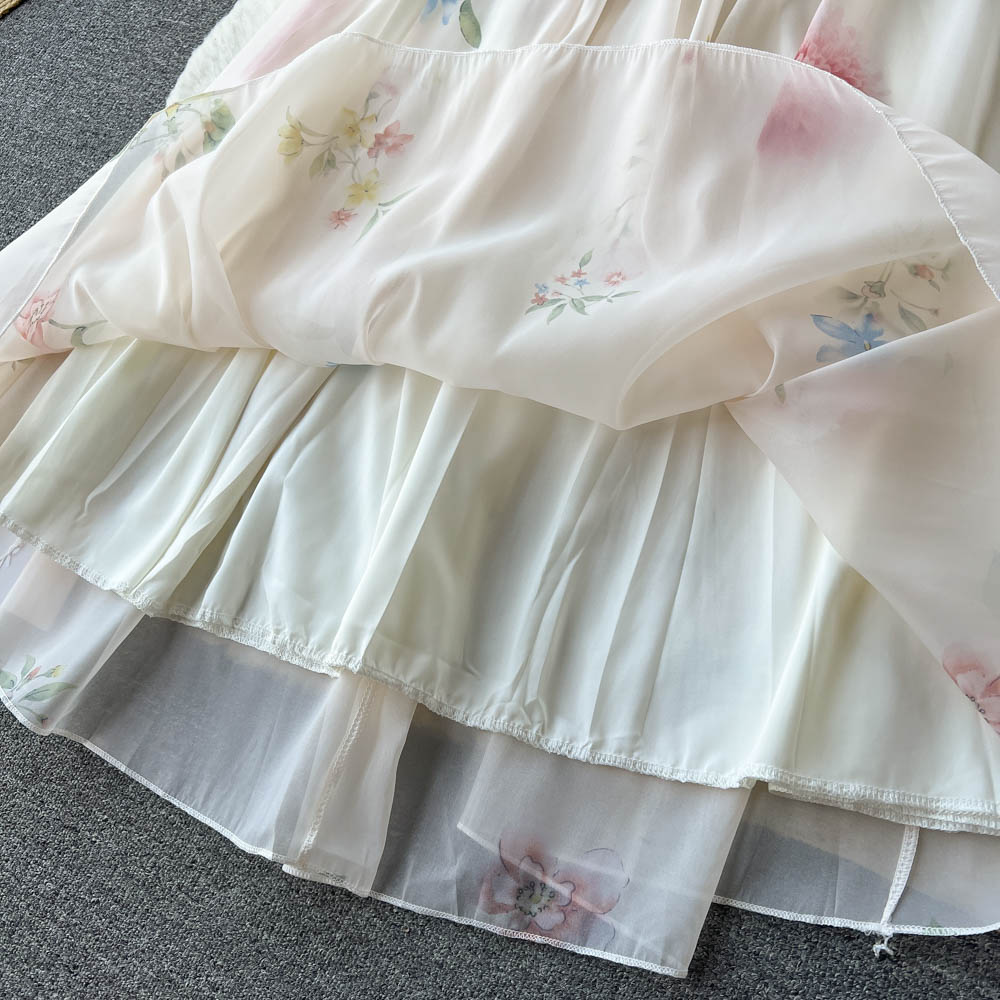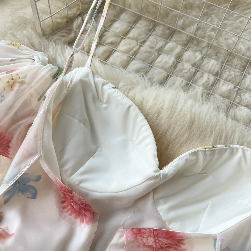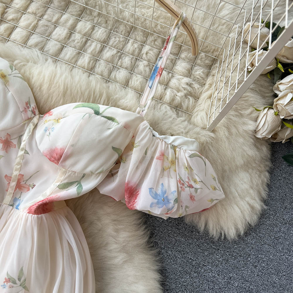 French Fantasy One-Shoulder Bandeau Slip Dress with Floral Puff Sleeves