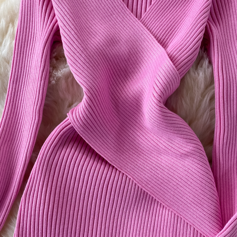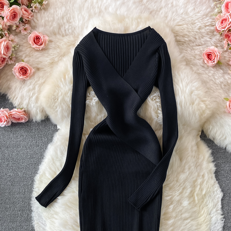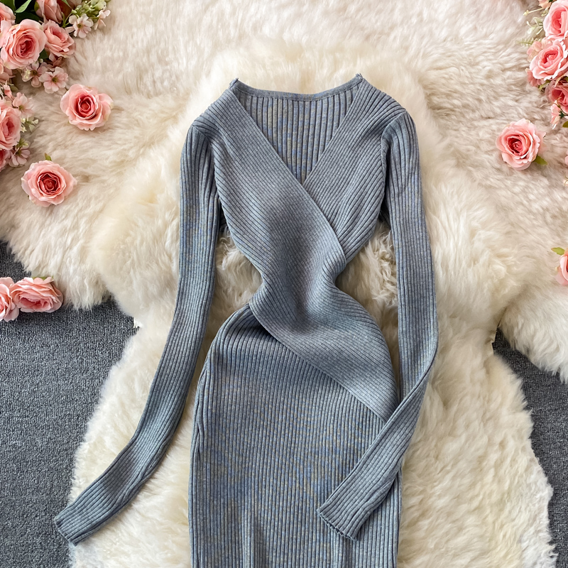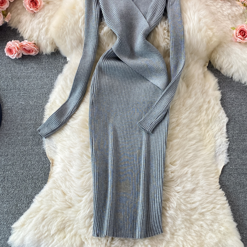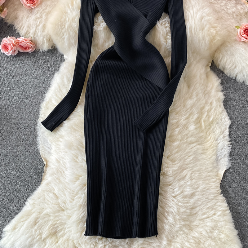 French-Inspired Knitted Deep V-Neck, Cinched Waist, and Midi Length Bodycon Dress