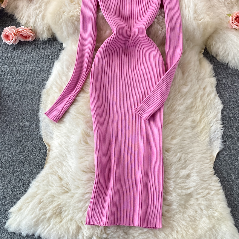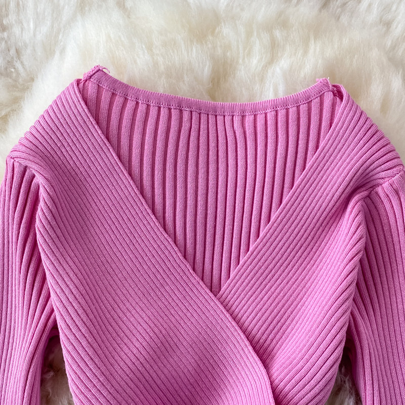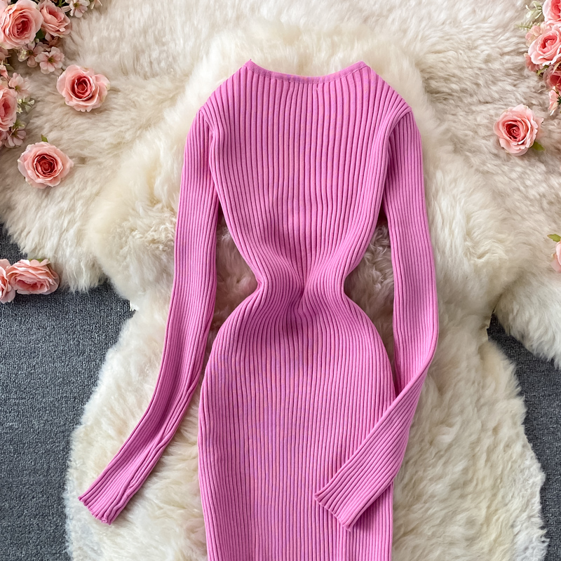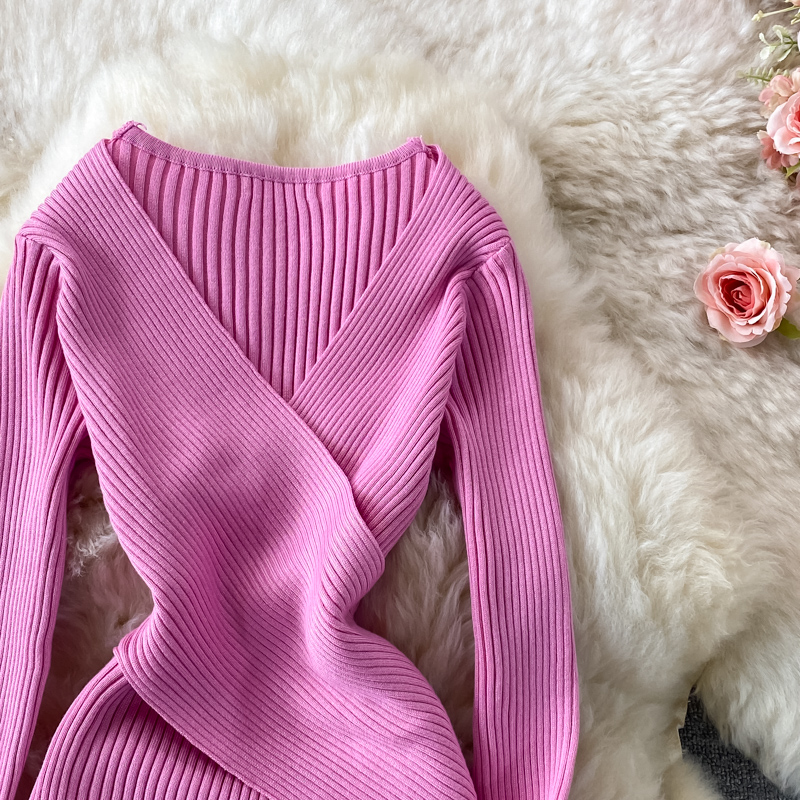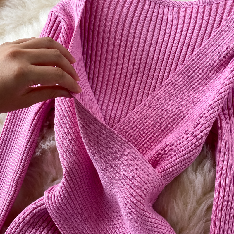 French-Inspired Knitted Deep V-Neck, Cinched Waist, and Midi Length Bodycon Dress