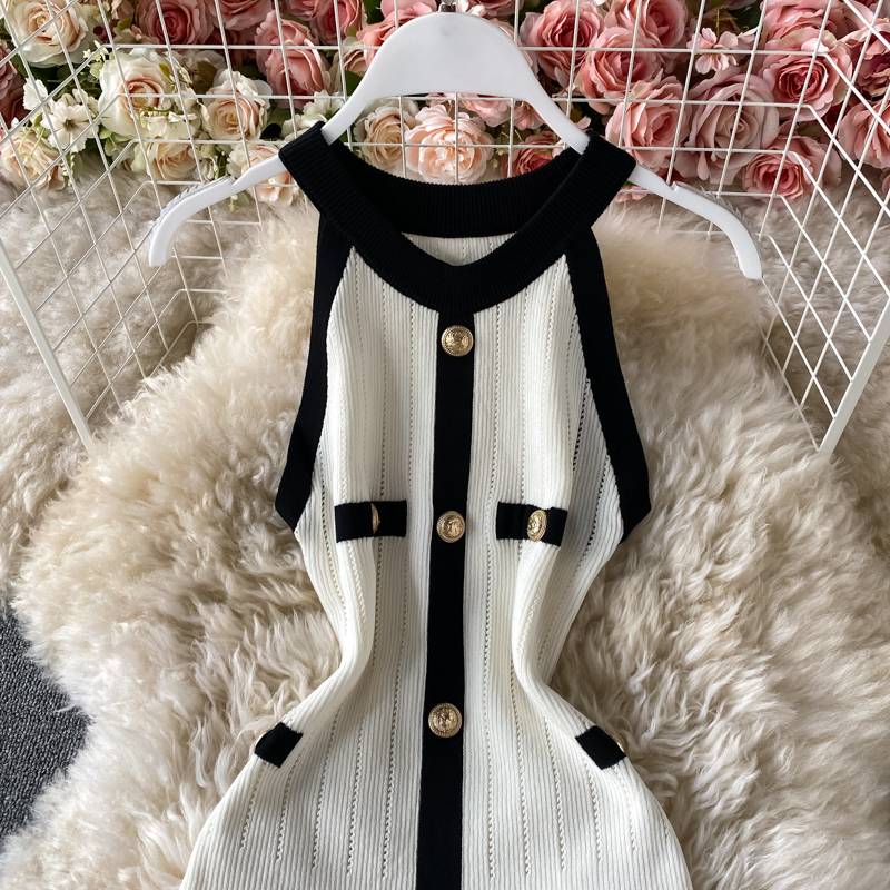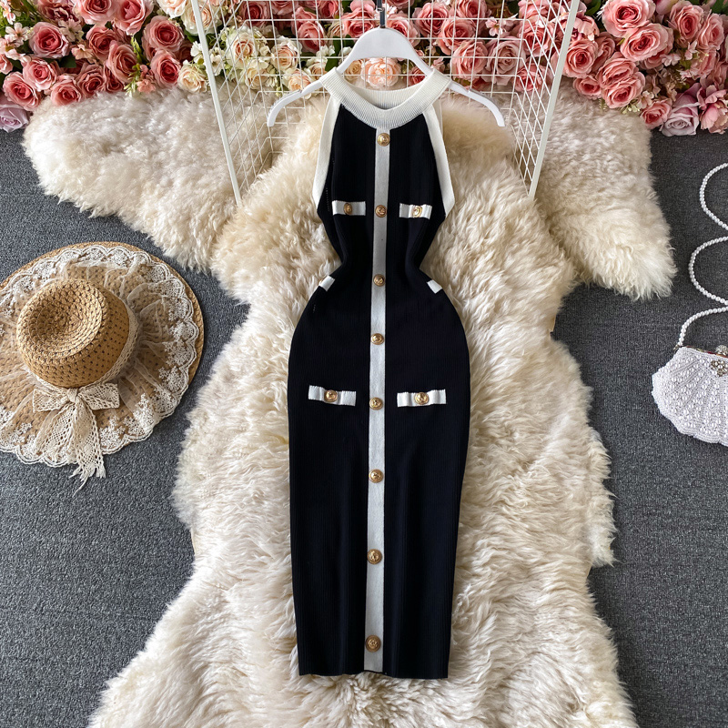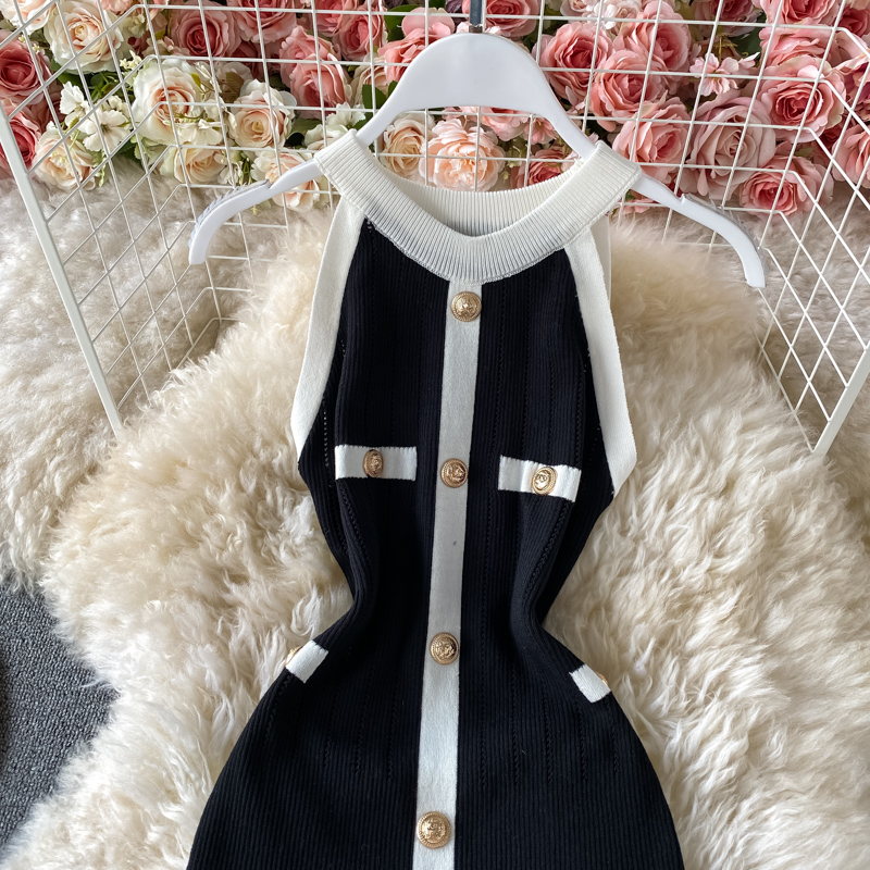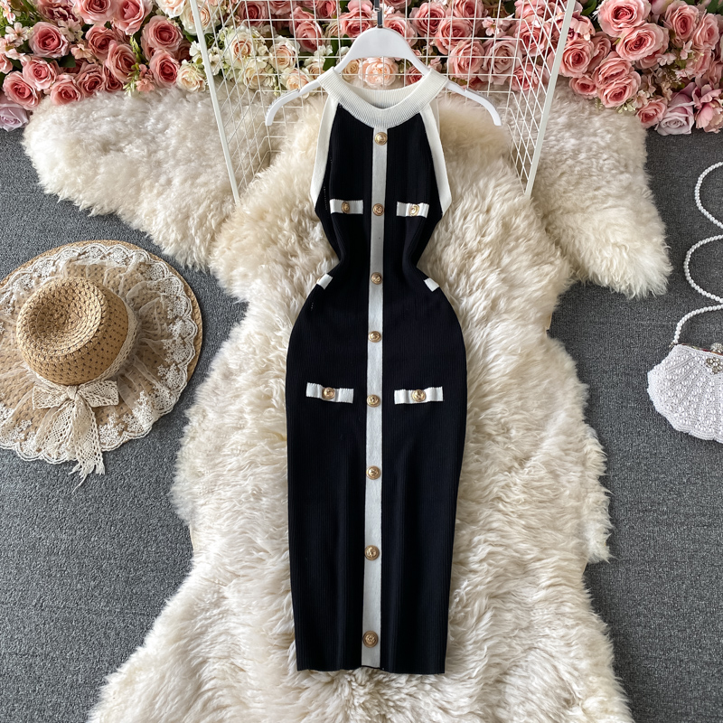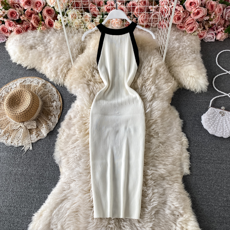 French Style Halterneck, Off-Shoulder, and Color-Blocked Knitted Bodycon