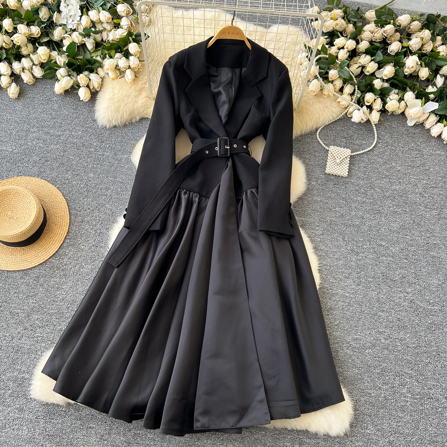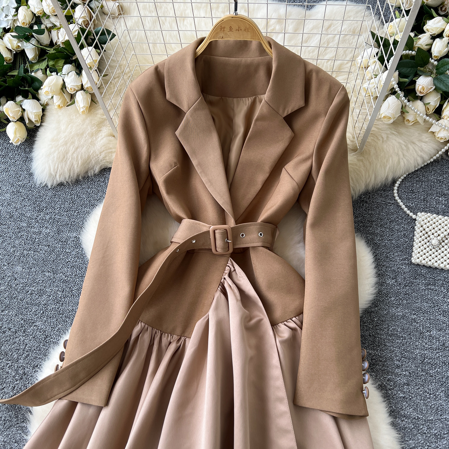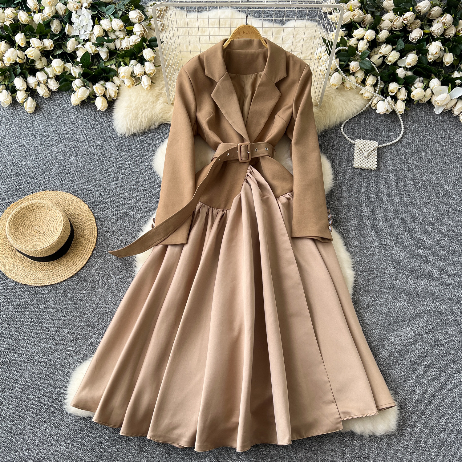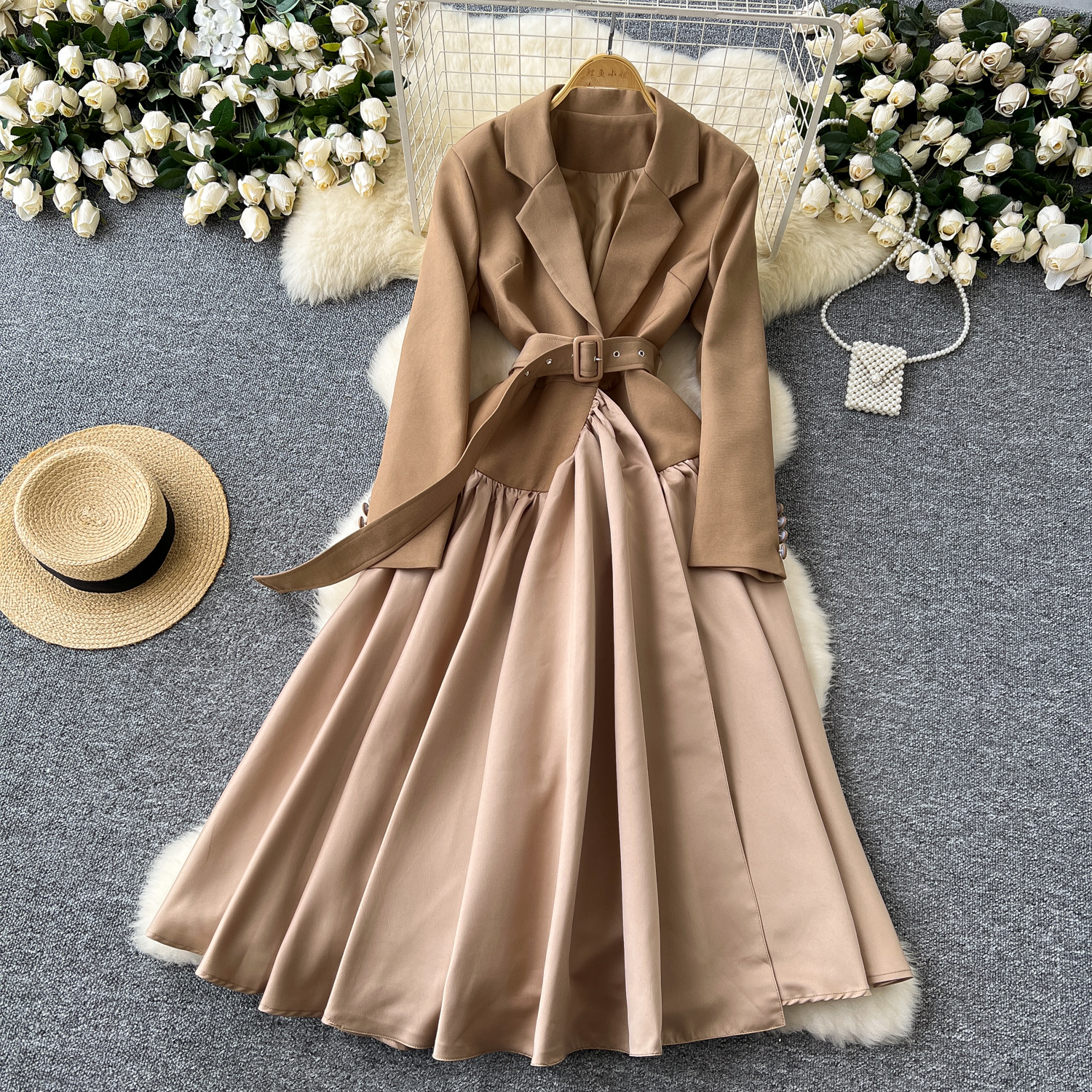 Glamorous Long Suit Dress with Tie Waist Stylish Long Sleeve Lapel Stitching Skirt