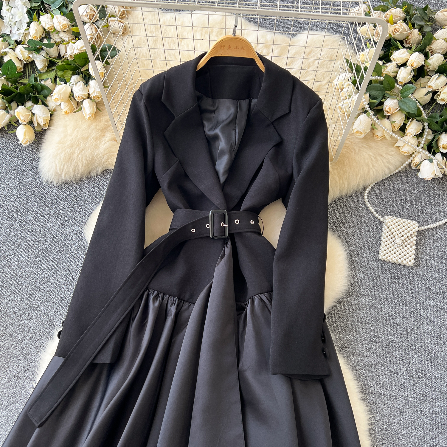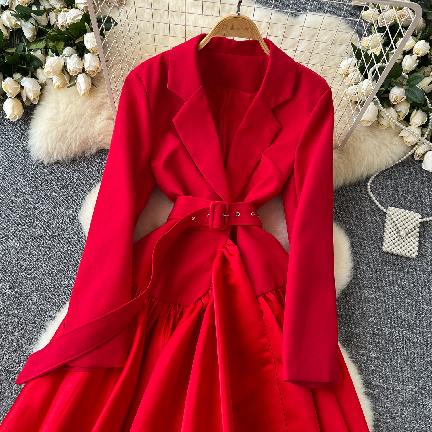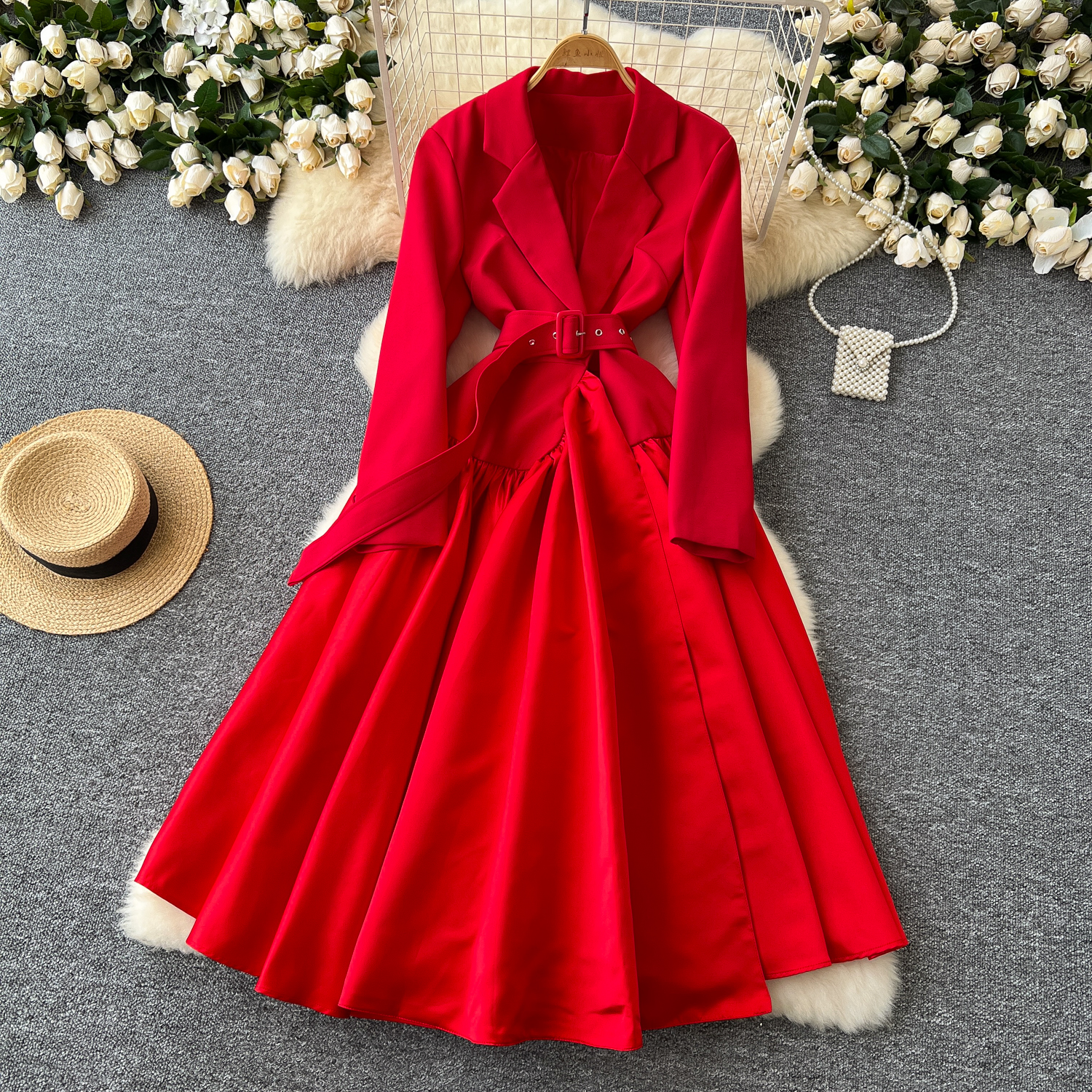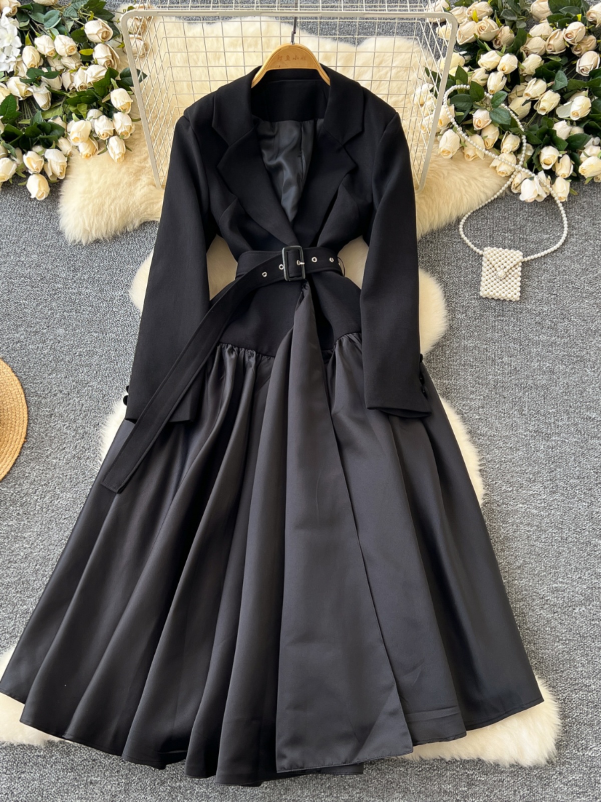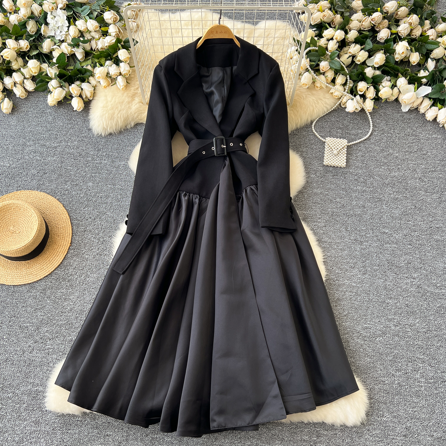 Glamorous Long Suit Dress with Tie Waist Stylish Long Sleeve Lapel Stitching Skirt