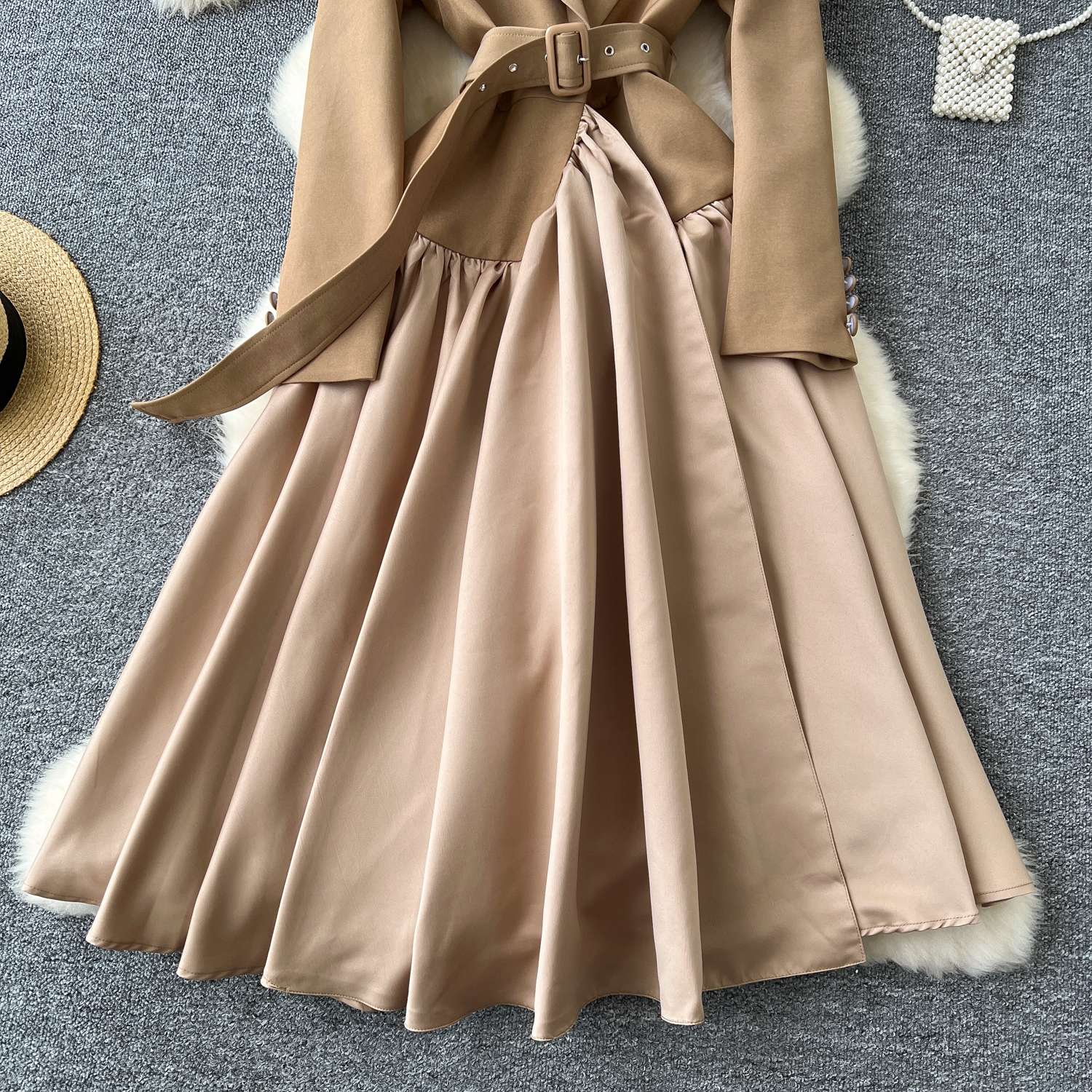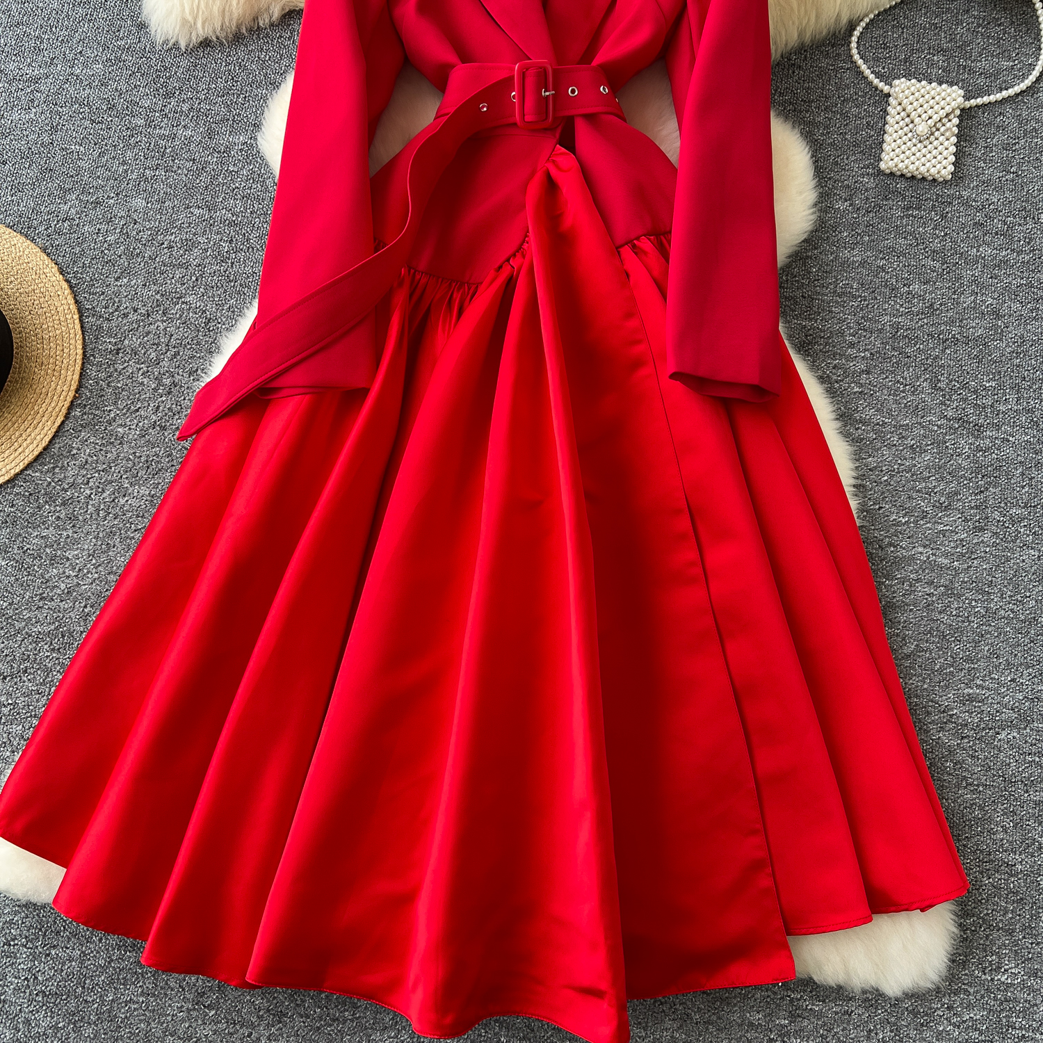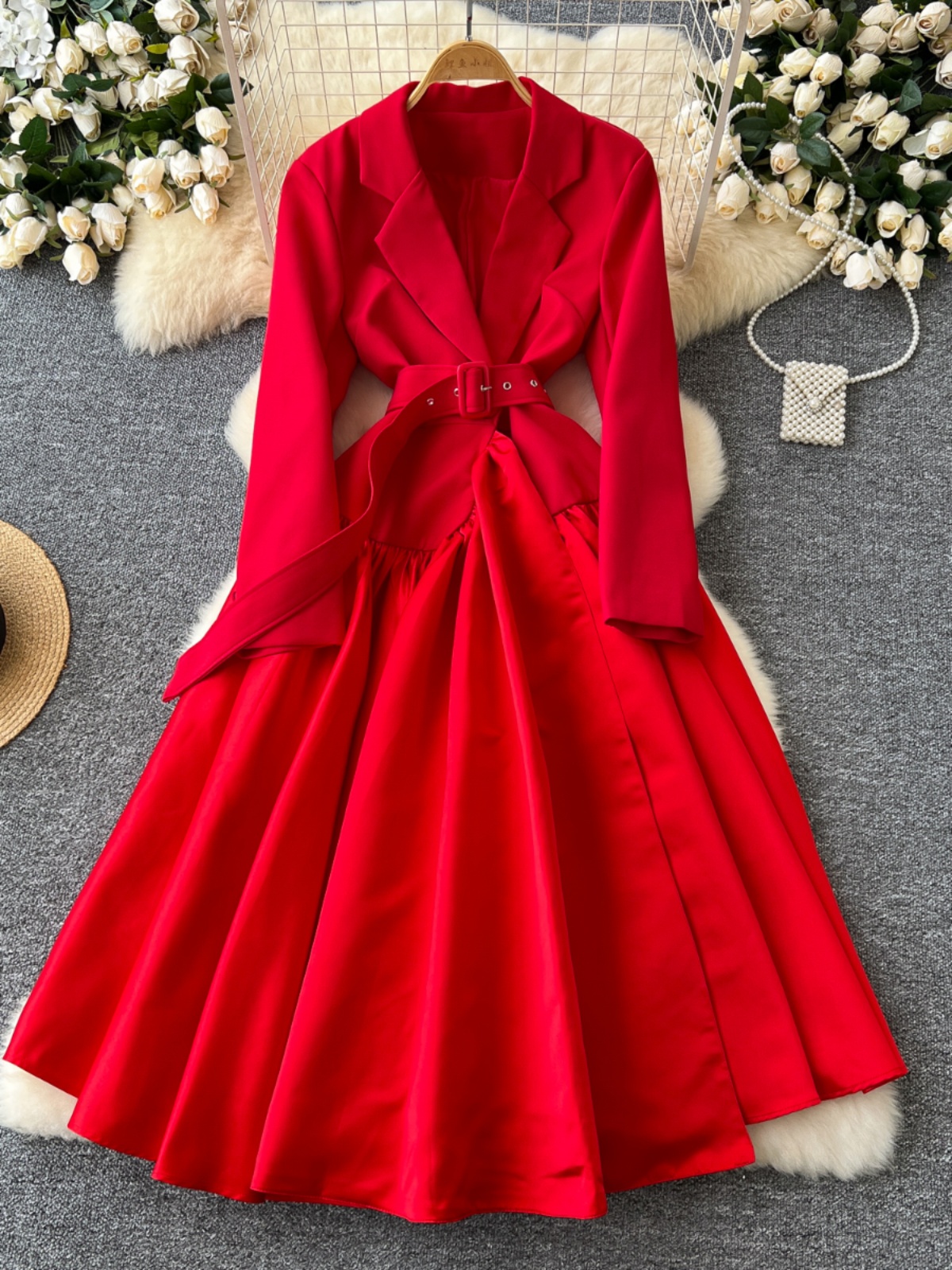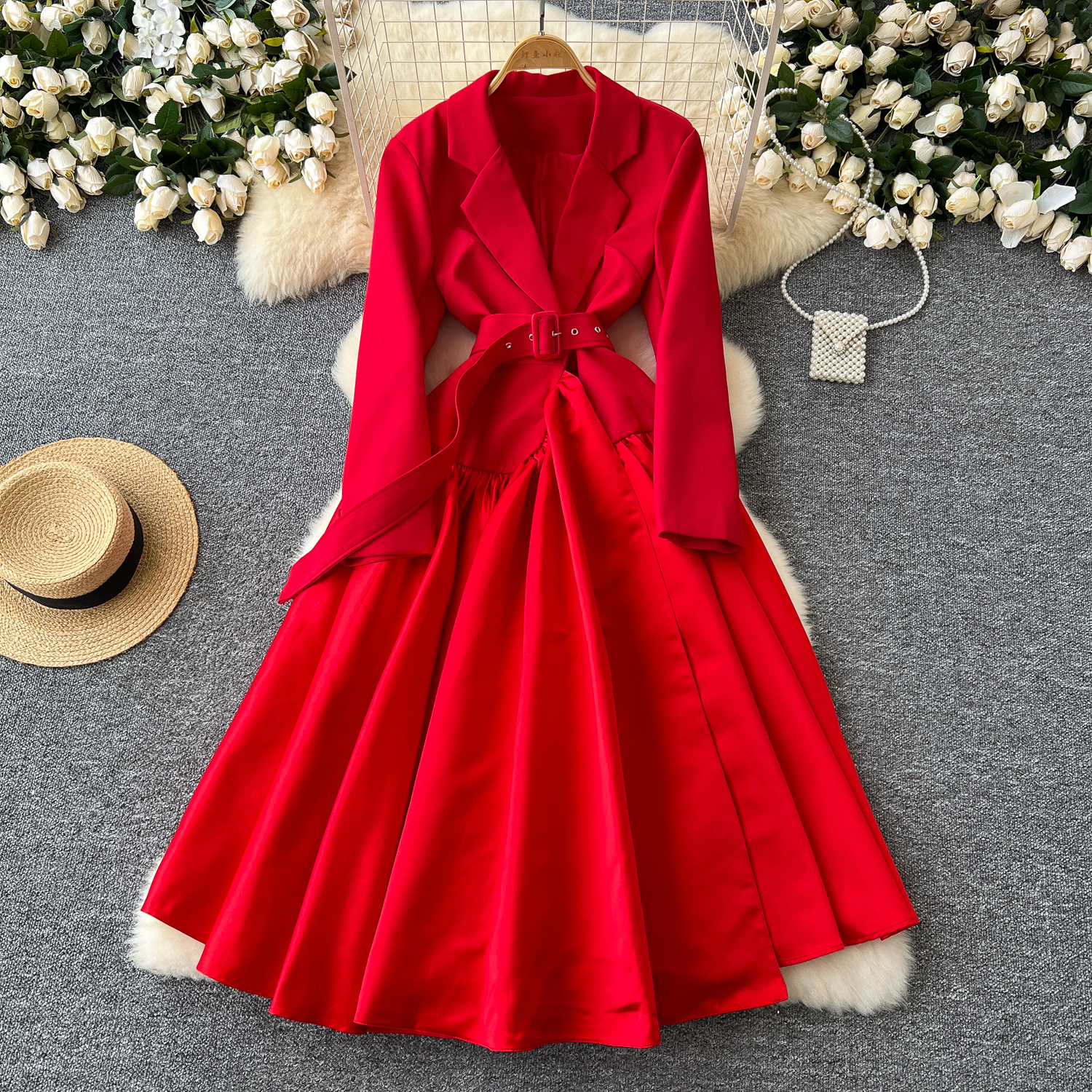 Glamorous Long Suit Dress with Tie Waist Stylish Long Sleeve Lapel Stitching Skirt