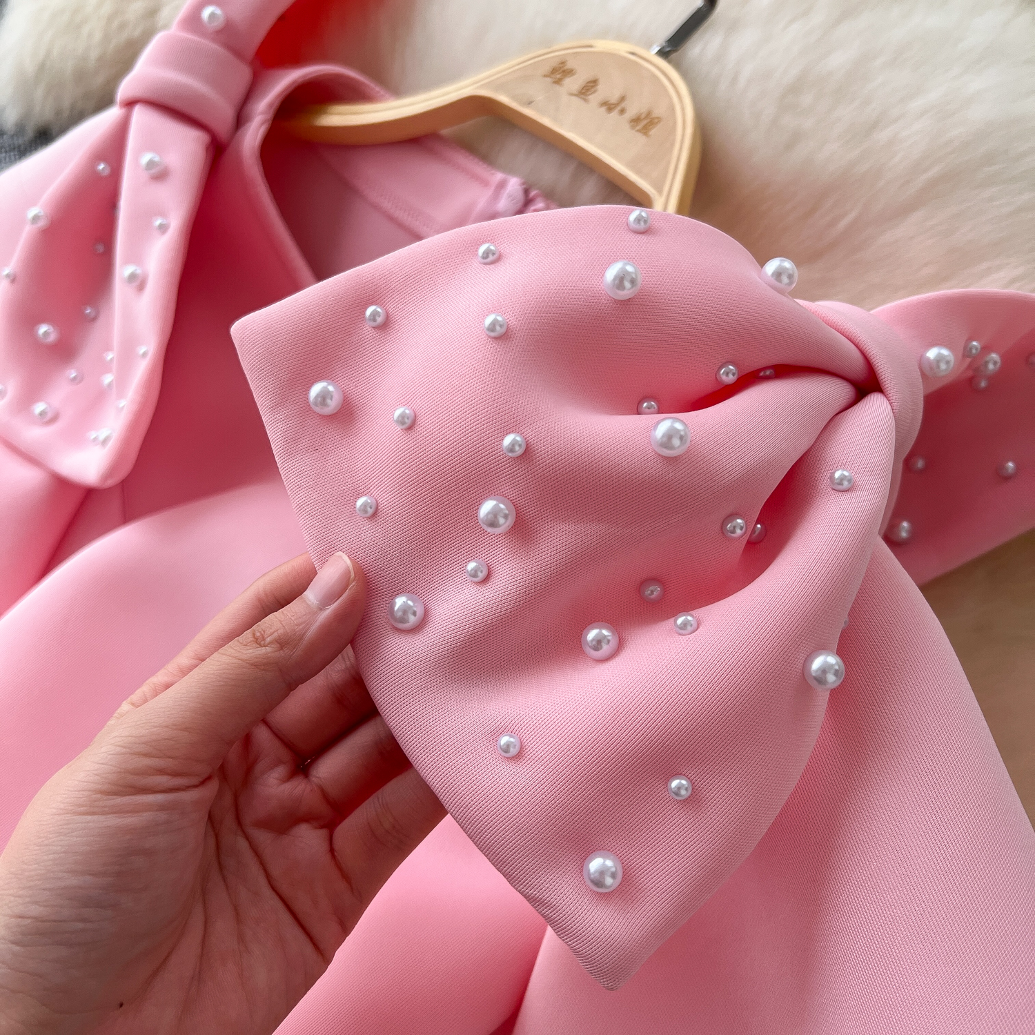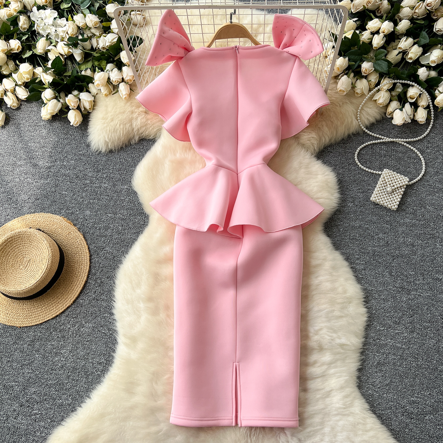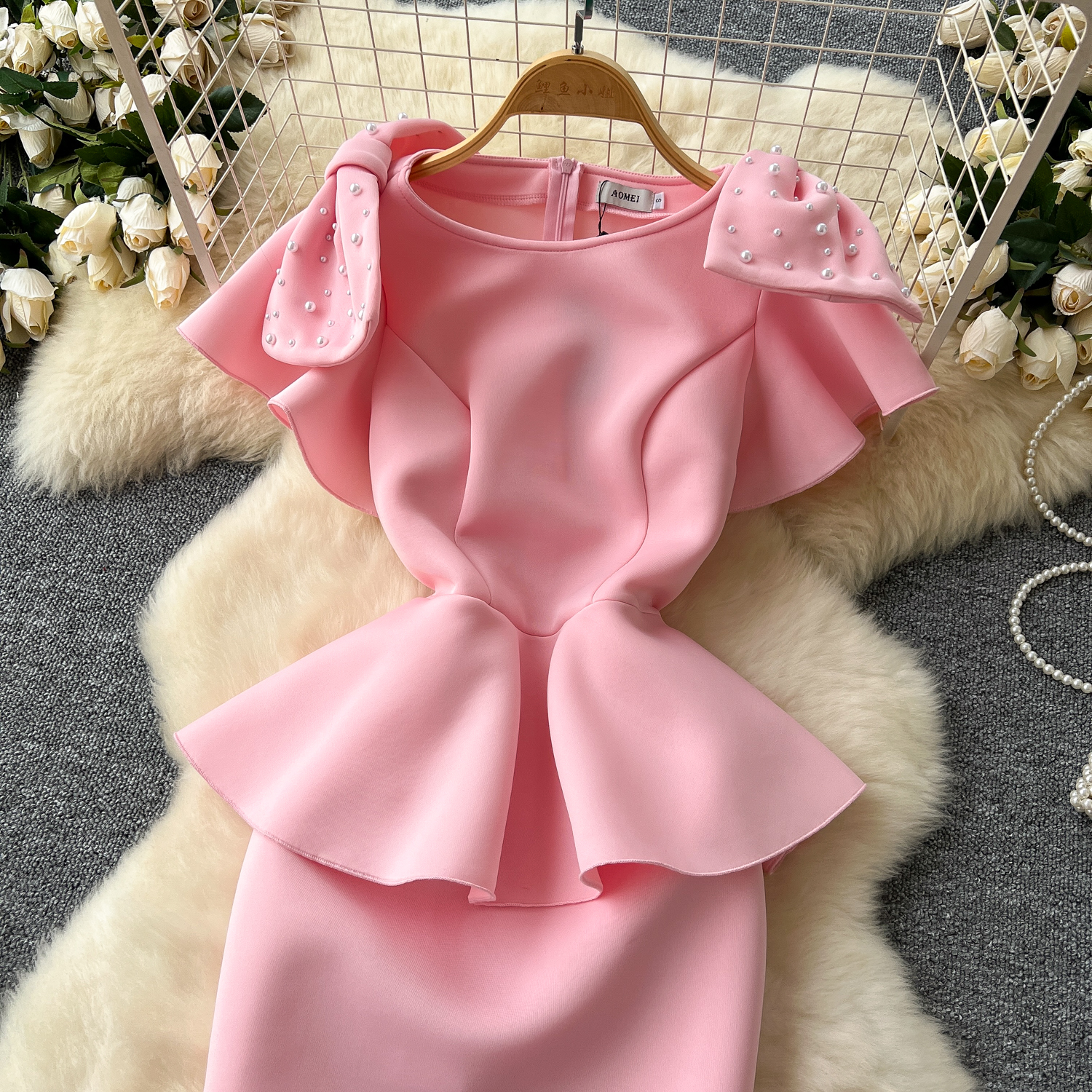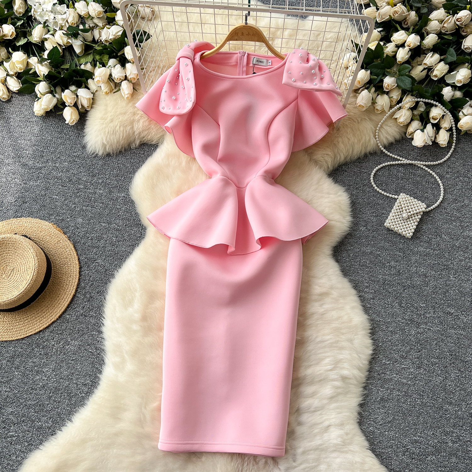 Luxurious Bow Waist Dress with Beaded Design and Ruffles Skirt
