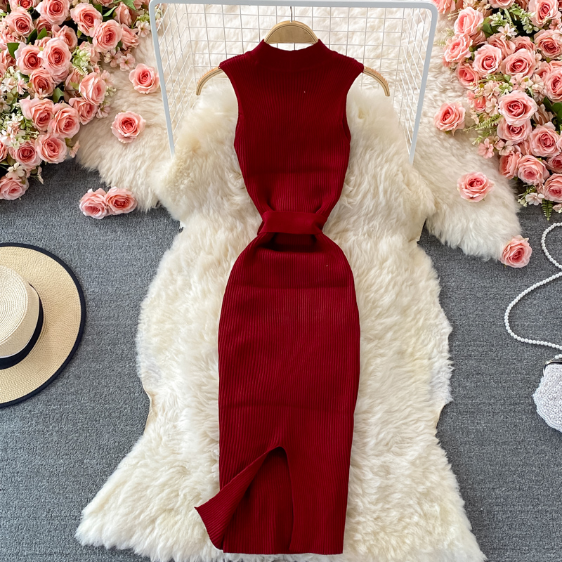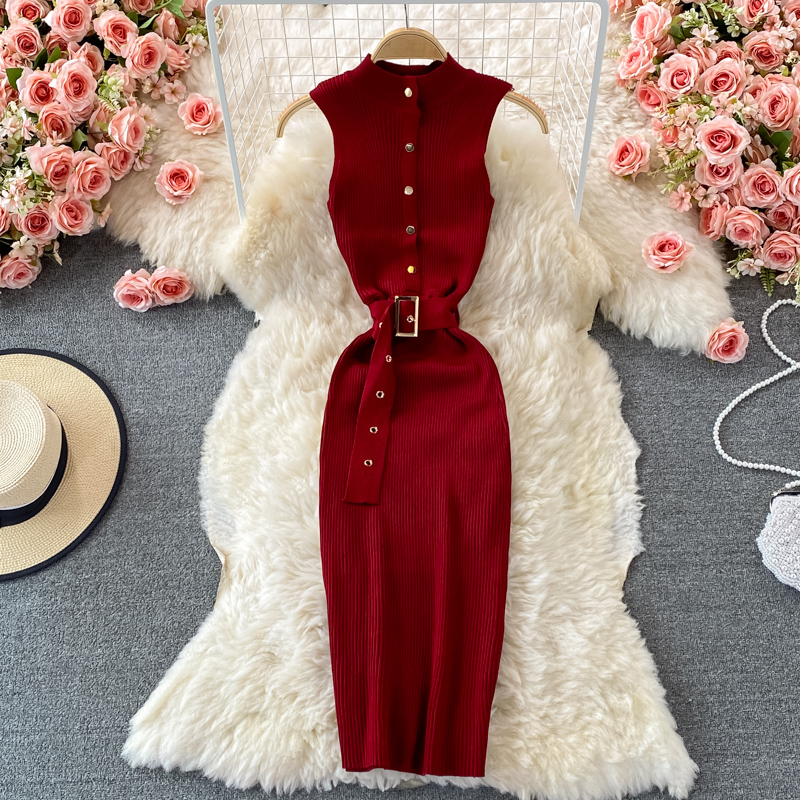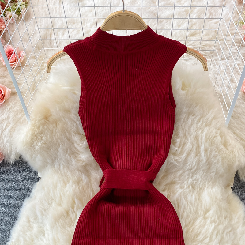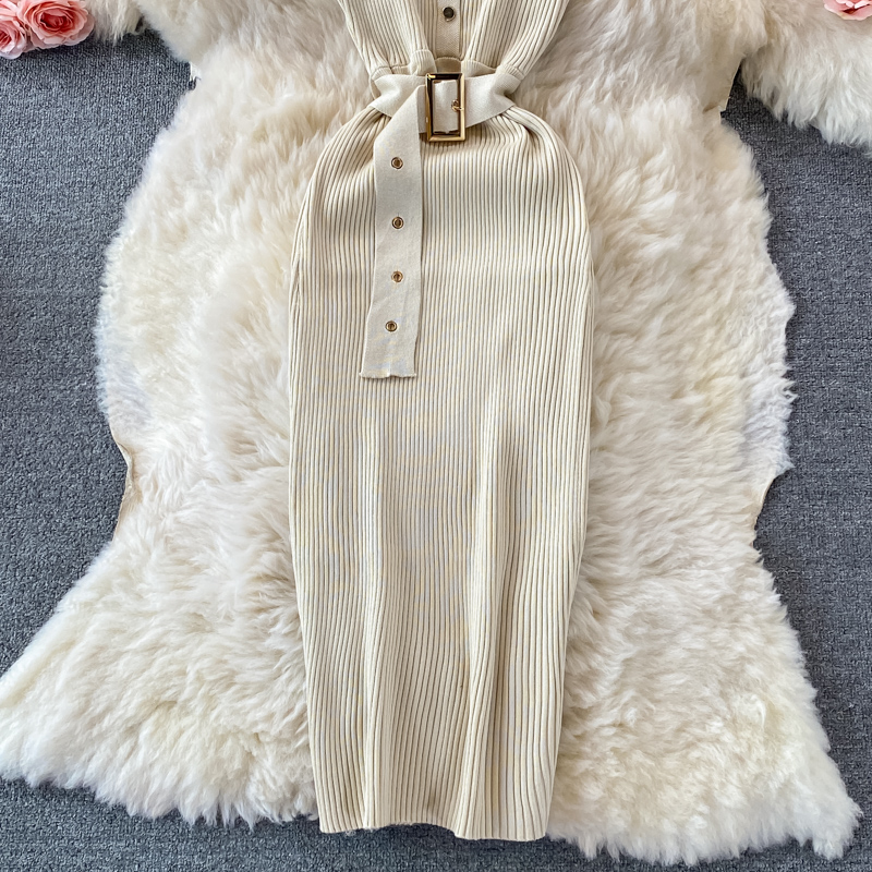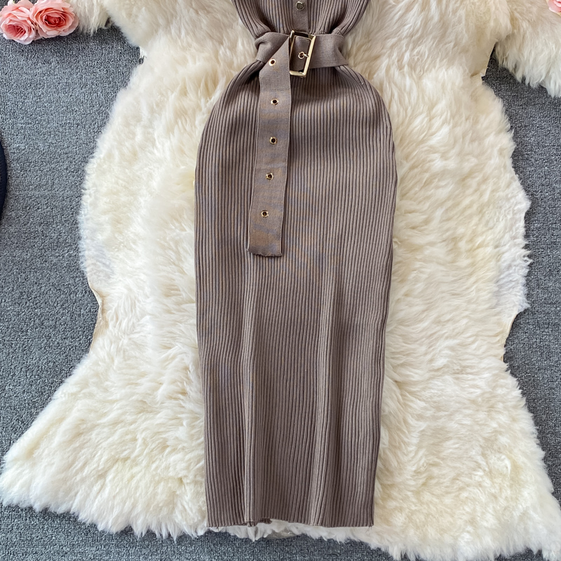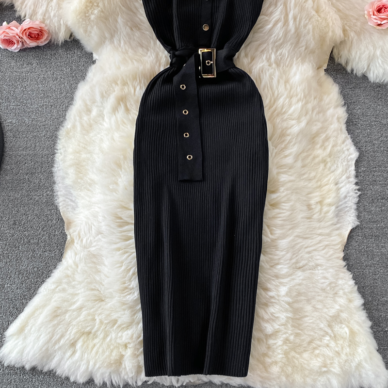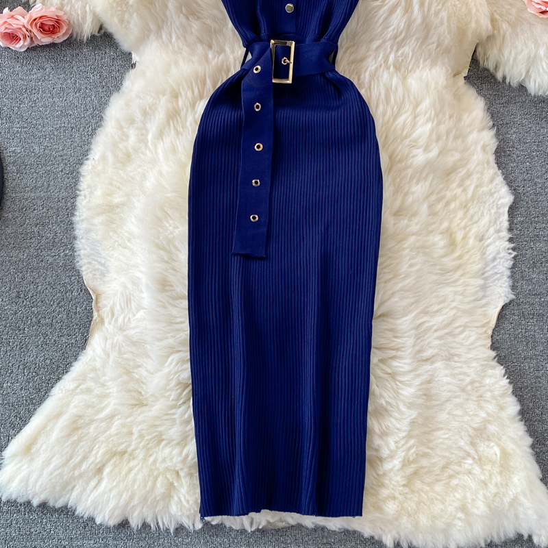 Luxurious Stretch Knitted Stand-Collar and Slim Mid-Length Bodycon Dress